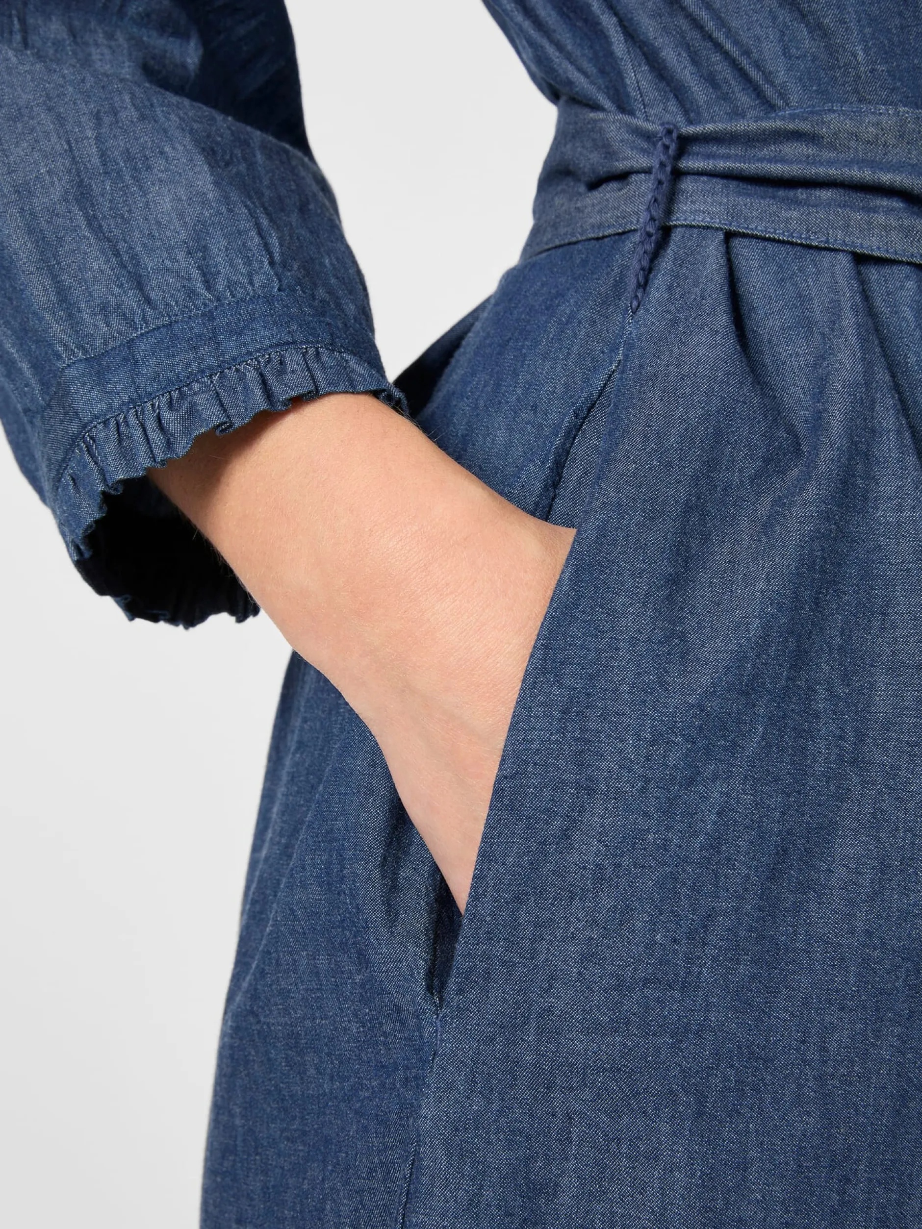 Locker fallendes Kleid aus einem weichen und leichten Denim aus kontrolliert biologisch angebauter Baumwolle. Gearbeitet ist es in legerer Passform mit Hemdkragen, durchgehender Knopfleiste und gerundetem Saum. Für eine feminine Silhouette lässt sich das Kleid mit einem Gürtel aus Oberstoff taillieren. Genauso gut kann es ohne Gürtel getragen werden – für einen lässigen, entspannten Look. Die dreiviertellangen Ärmel sind an den Enden gerafft und mit Rüschen versehen. Brustabnäher und eine aufspringende Kellerfalte sorgen für einen guten und bequemen Sitz. In die Seitennaht sind zwei Taschen eingesetzt, die Platz für Kleinteile des täglichen Bedarfs bieten.
