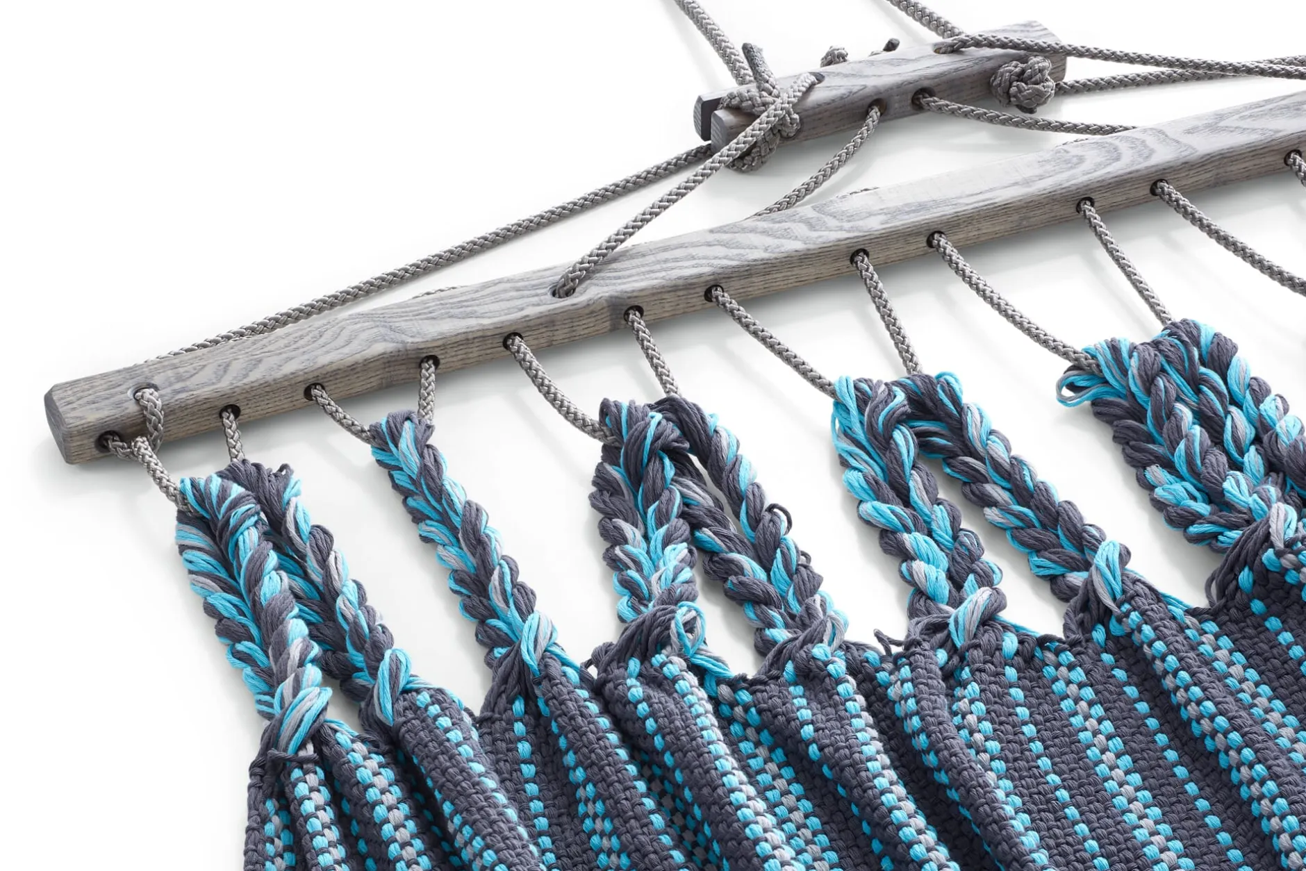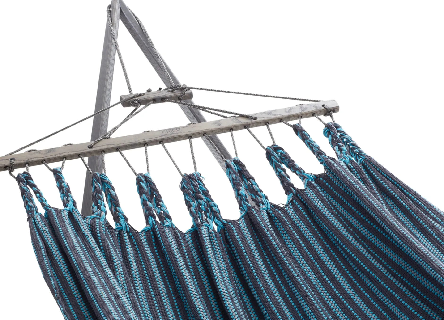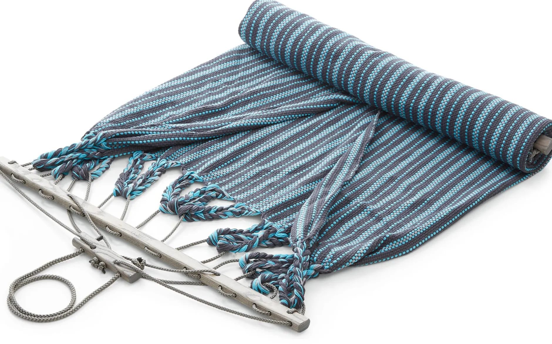 Die Hängematten werden in einer eigens entwickelten Endloswebtechnik gearbeitet, sie sind nicht nur von einer Materialopulenz, die man schon beim ersten Griff spürt – sie sind vor allem auch außerordentlich reißfest. Ein verstellbarer hölzerner Fixierstab verhindert das Zusammenrutschen der Matte, eine Spannvorrichtung ermöglicht Längenänderungen. Einzig beim Tragseil verwendet der Hersteller ein synthetisches Material, eine UV- und witterungsbeständige Polyestermischung, die die langfristige Belastbarkeit der Hängematte gewährleistet.