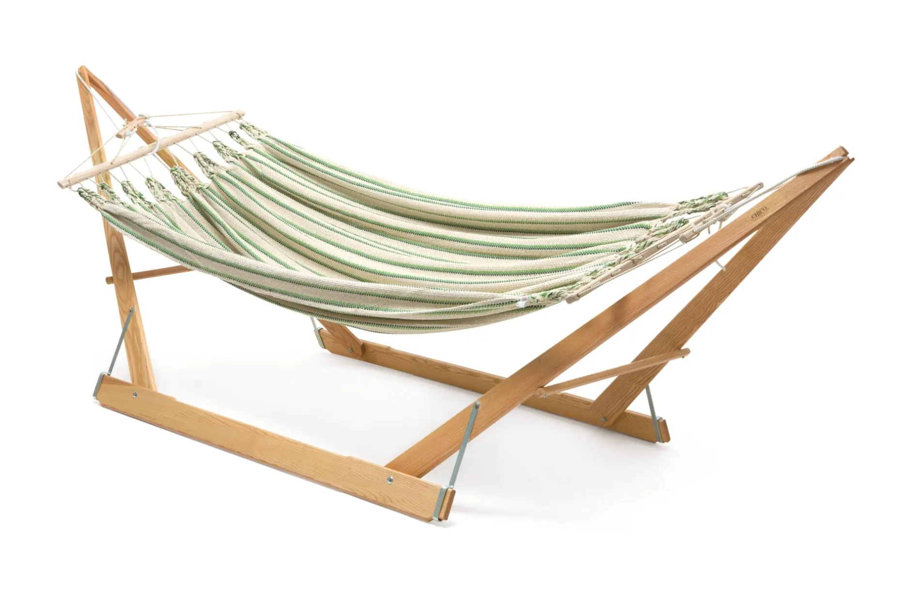 Die Hängematten werden in einer eigens entwickelten Endloswebtechnik gearbeitet, sie sind nicht nur von einer Materialopulenz, die man schon beim ersten Griff spürt – sie sind vor allem auch außerordentlich reißfest. Ein verstellbarer hölzerner Fixierstab verhindert das Zusammenrutschen der Matte, eine Spannvorrichtung ermöglicht Längenänderungen. Einzig beim Tragseil verwendet der Hersteller ein synthetisches Material, eine UV- und witterungsbeständige Polyestermischung, die die langfristige Belastbarkeit der Hängematte gewährleistet.