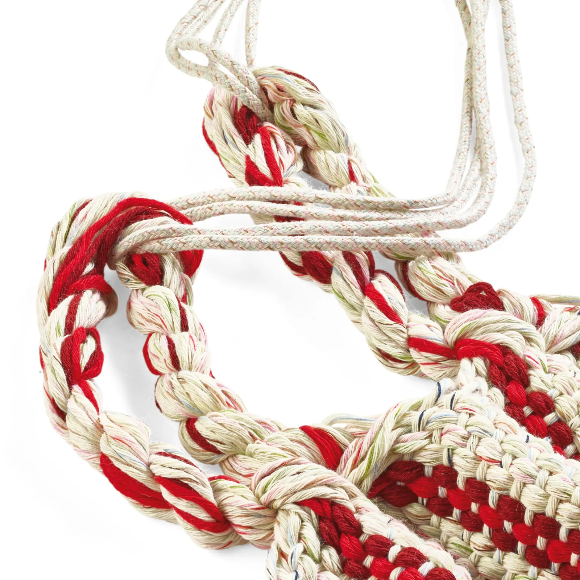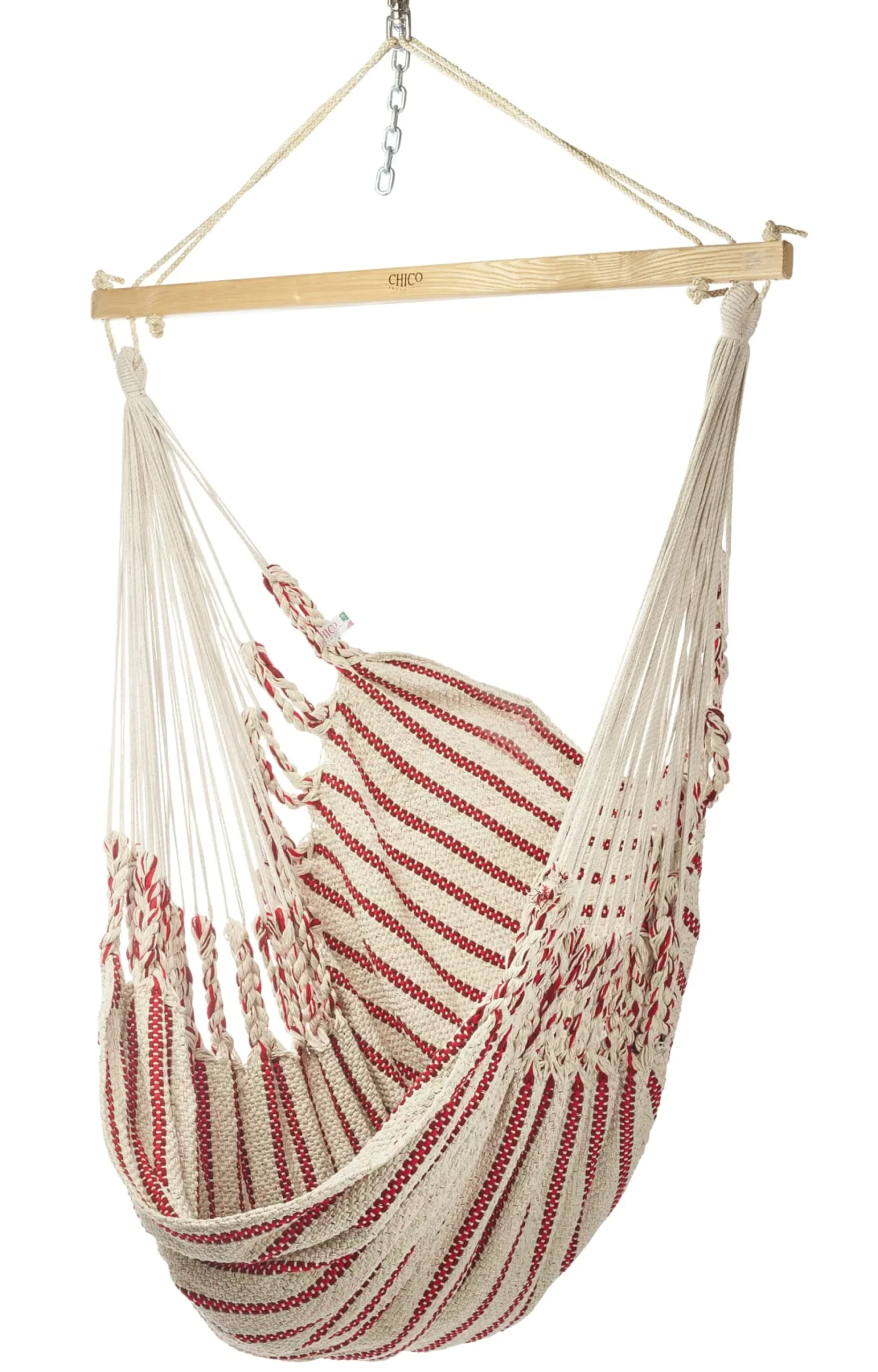 Der Stoff wird in einer speziellen Endloswebtechnik gearbeitet, bei der eine festgelegte Anzahl baumwollener Endlosfäden so miteinander verwoben wird, dass im Gewebe weder störende Knoten noch lose Randfäden auftreten und jeder einzelne Faden mit dem Trägerseil fest verbunden ist. Eine derart gewebte Stoffbahn ist überaus reißfest und sichert eine gleichmäßige Lastenverteilung; ihre Materialopulenz spürt man auf den ersten Griff. Der hölzerne Fixierstab verhindert ein Zusammenrutschen der Matte, der Drehwirbel am Karabinerhaken – die beide aus verzinktem Stahl gefertigt und damit unempfindlich sind – ermöglicht die Höhenanpassung des Hängesessels. Das Tragseil besteht aus gutem Grund aus synthetischem Material. Der österreichische Hersteller setzt hier eine UV- und witterungsbeständige Polyestermischung ein, die abriebsicher ist und eine langfristige Belastbarkeit gewährleistet.