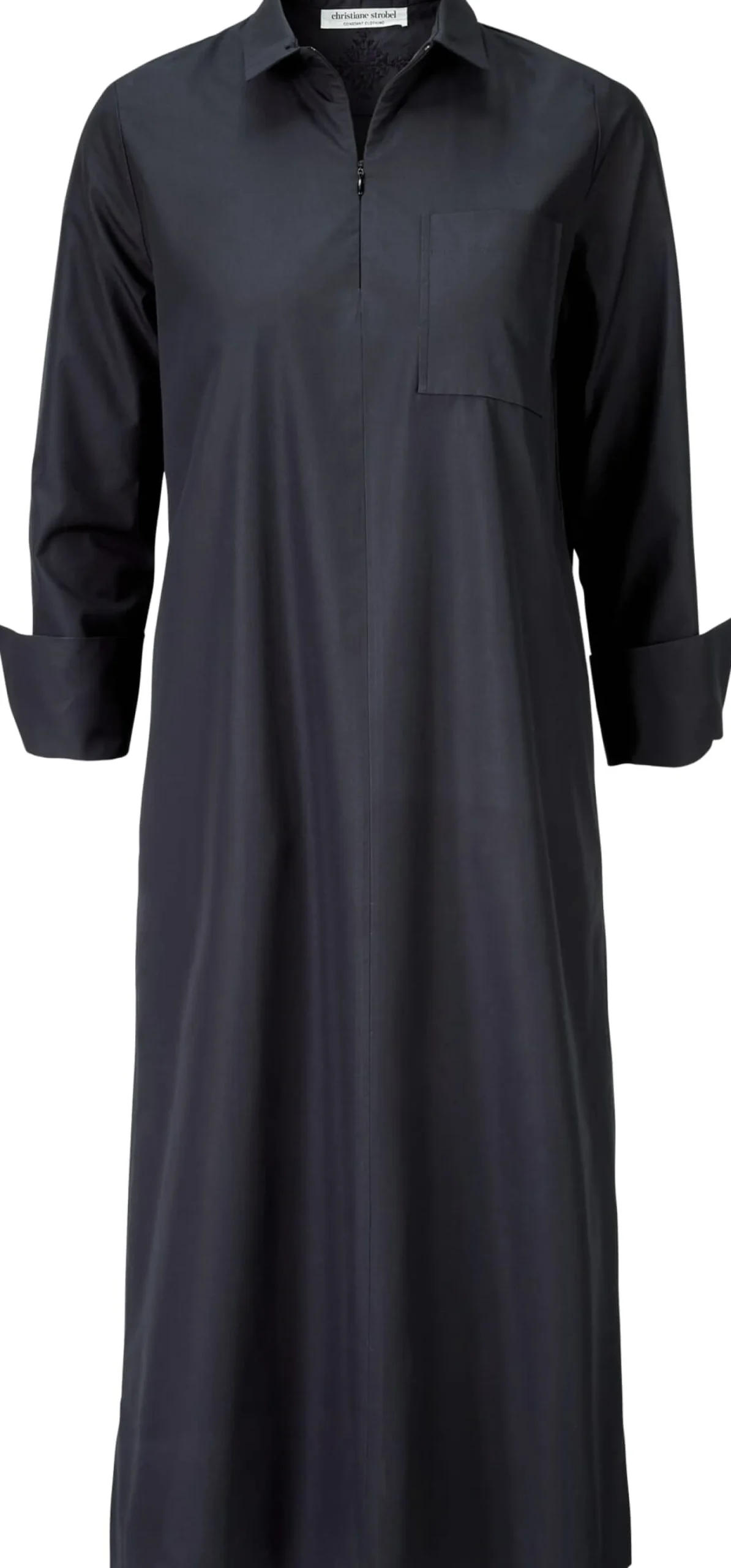 Dieses überschnittene Hemdblusenkleid in Midilänge ist aus kontrolliert biologisch angebauter Baumwolle gefertigt. Es ist mit einer Brusttasche, zwei Seitennahttaschen und dreiviertellangen Ärmeln mit geschlitzten Manschetten ausgestattet. Der Rumpfsaum ist vorn gerade und hinten gerundet. Für eine sportliche Note sorgt der schmale Nahtreißverschluss, mit dem sich das Kleid auch hochgeschlossen tragen lässt. Die Kellerfalte unter der Schulterpasse erhöht den Tragekomfort, und die detailreiche Fassi-Stickerei im Nacken – handmade in Marrakesch – macht jedes Stück zum Unikat.