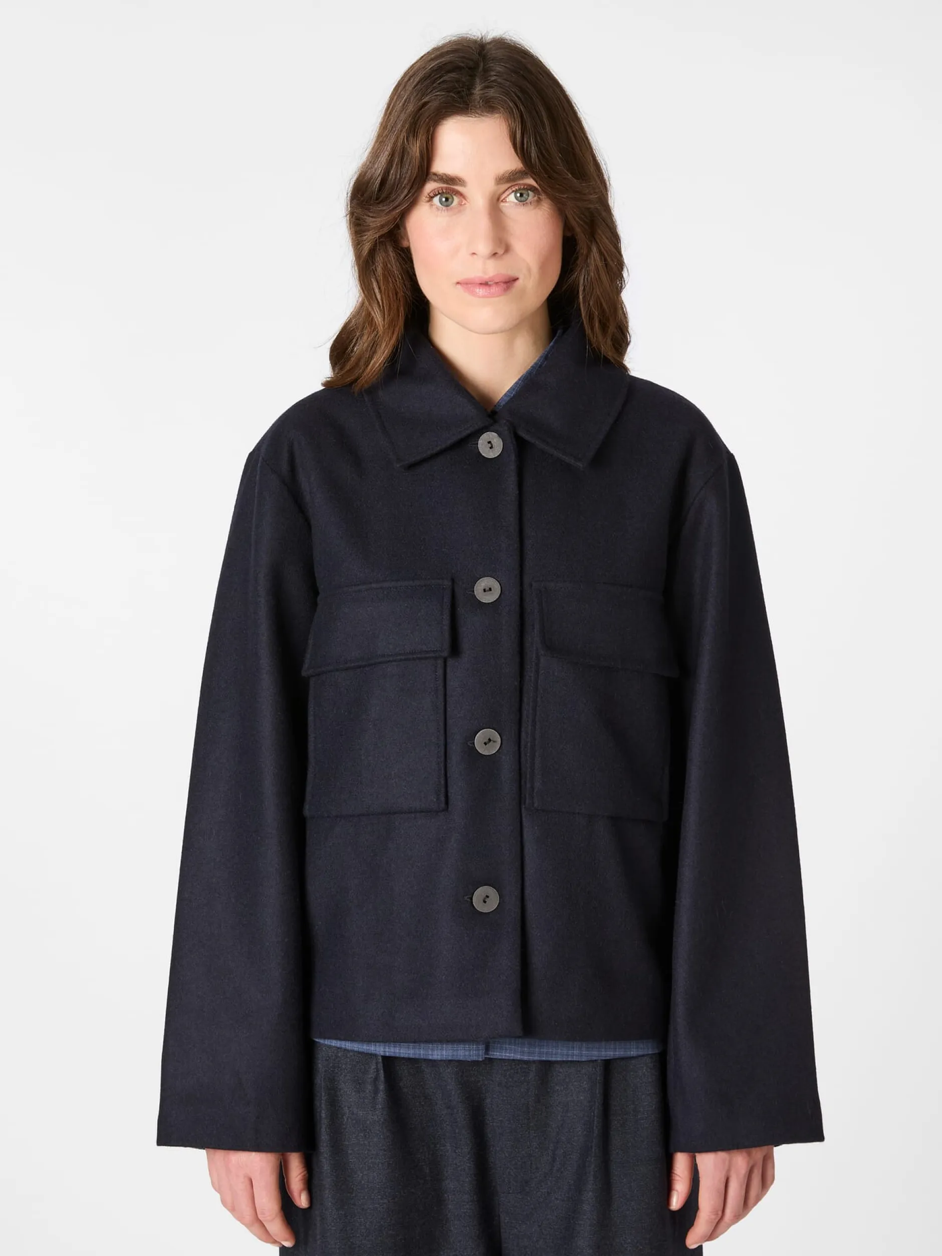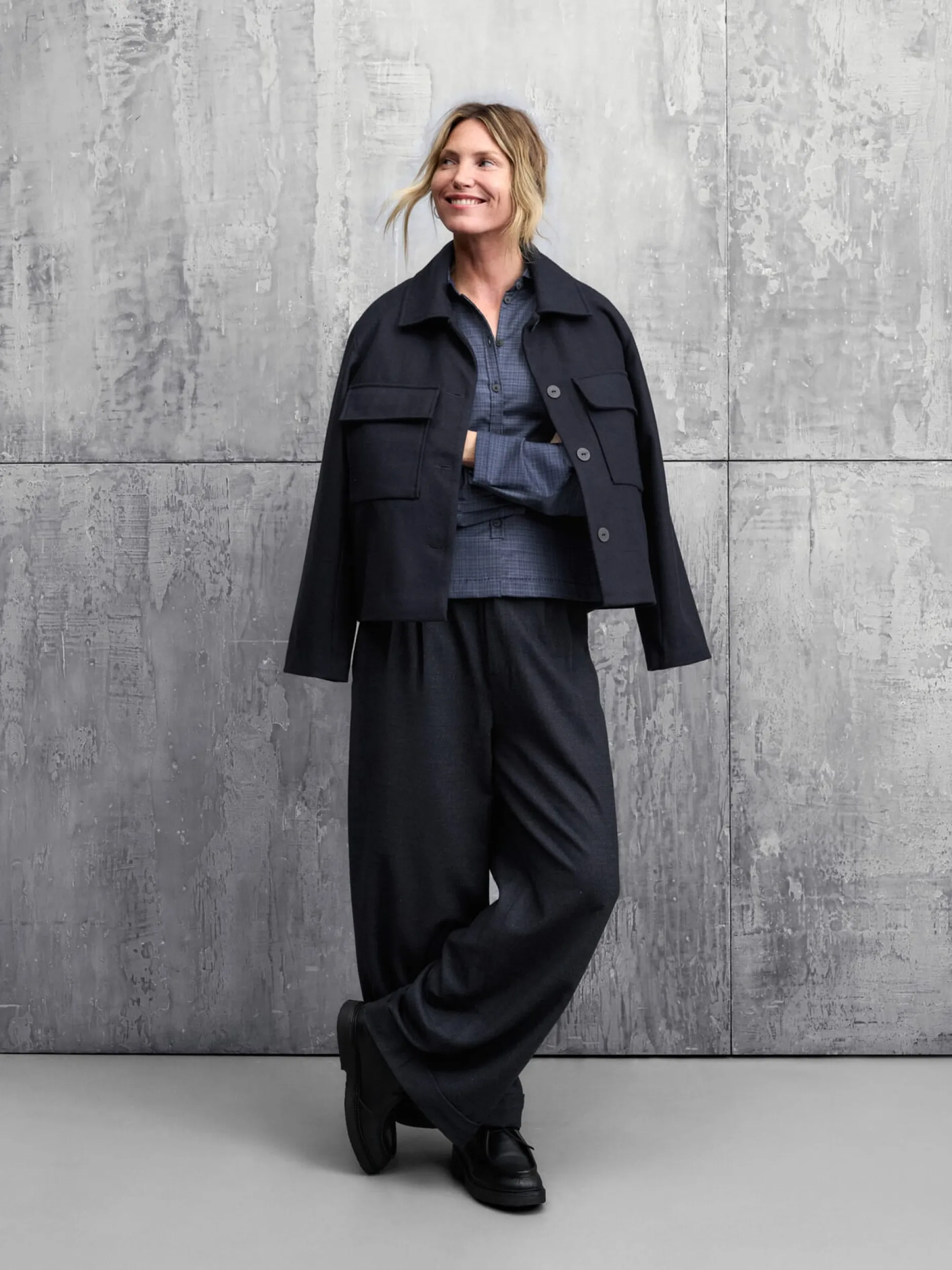 Dank ihrer geraden, legeren Passform und der verwendeten Materialien ist diese Hemdjacke überaus komfortabel und eine ideale Begleiterin für frische Herbst- und Frühlingstage oder kühle Sommerabende. Christiane Strobel fertigt den Oberstoff aus einem dichten, wärmenden Wolltuch, das Futter aus reiner, hautsympathischer Baumwolle. Gearbeitet ist die Jacke mit zwei großen, aufgesetzten Brusttaschen mit Patte und geradem Saum. Weitere schnitttechnische Details sind die Querteilungsnaht am hinteren Saum sowie eine Längsteilungsnaht im Rücken, die die Silhouette optisch verschlankt. Abgerundet wird das Design durch die in Japan handgefertigten Papierknöpfe und das handgestickte Dreieck am rückseitig angebrachten Riegel.