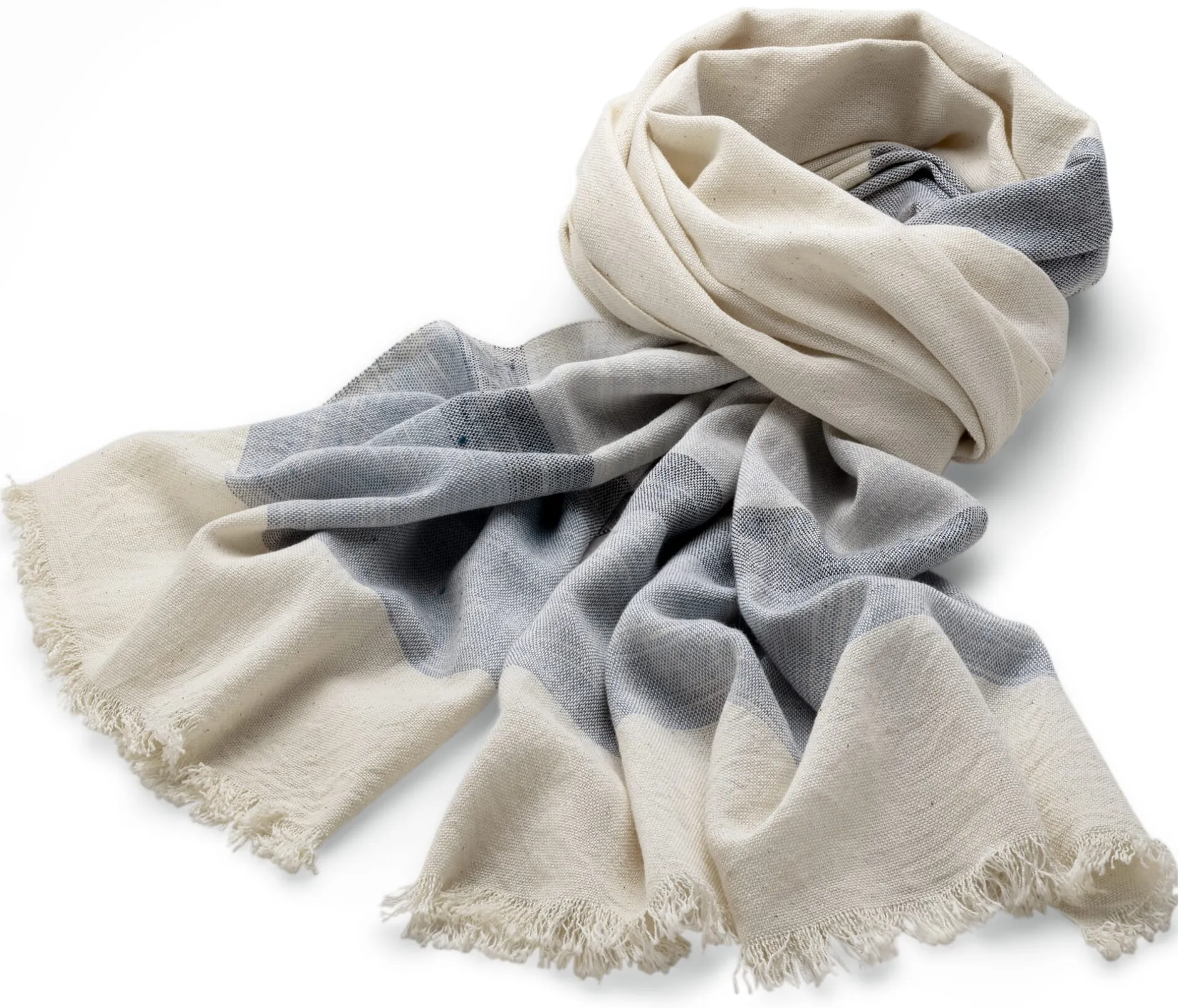 Gut für die Übergangszeit: handgewebtes, breites Schultertuch aus hautsympathischer Baumwolle und feiner Seide mit markanten zweifarbigen Blockstreifen und schmalen Fransenkanten an den Enden. Dank der Länge von nahezu zwei Metern kann das Tuch in den unterschiedlichsten Bindetechniken getragen werden und sorgt so für abwechslungsreiche Auftritte.