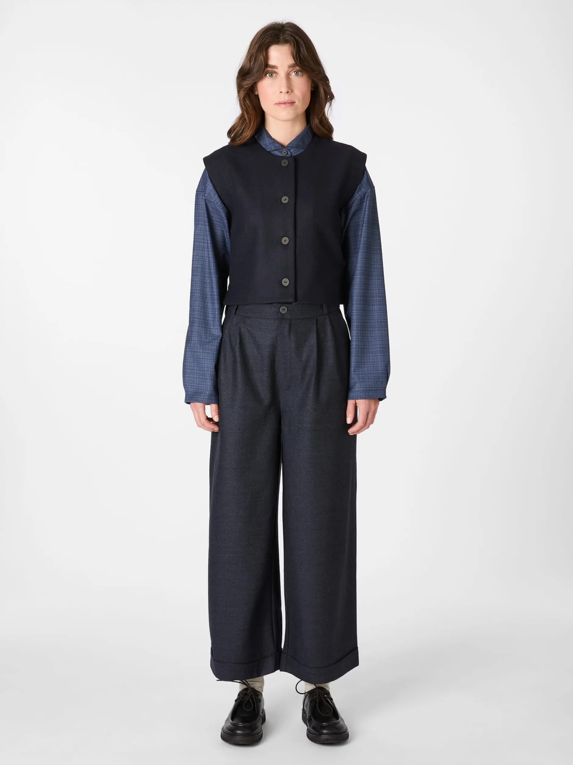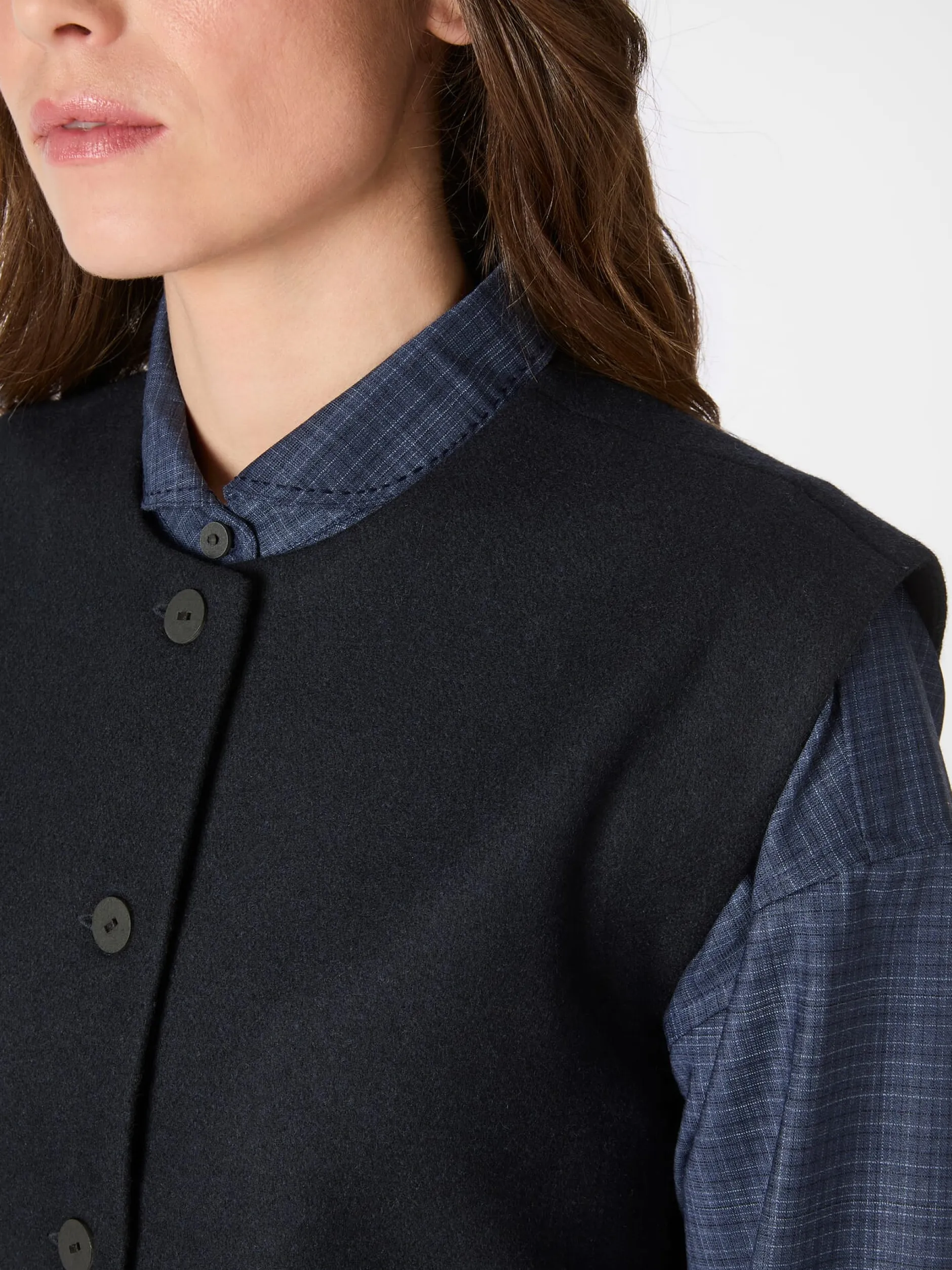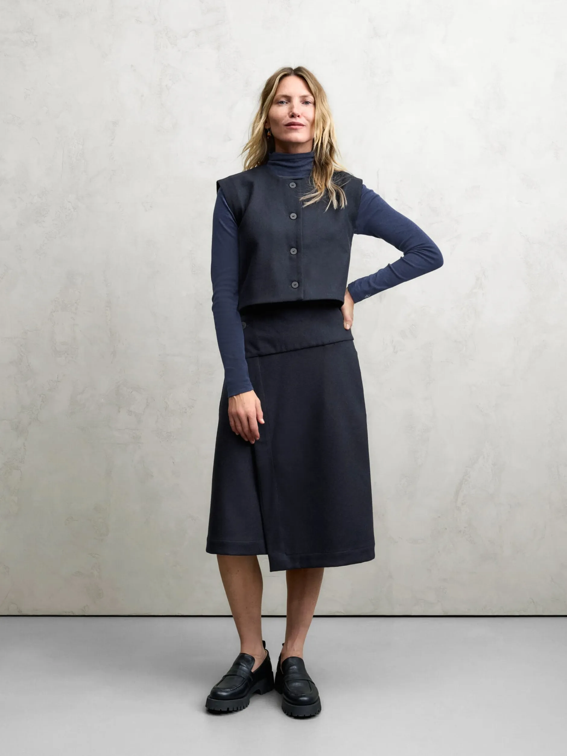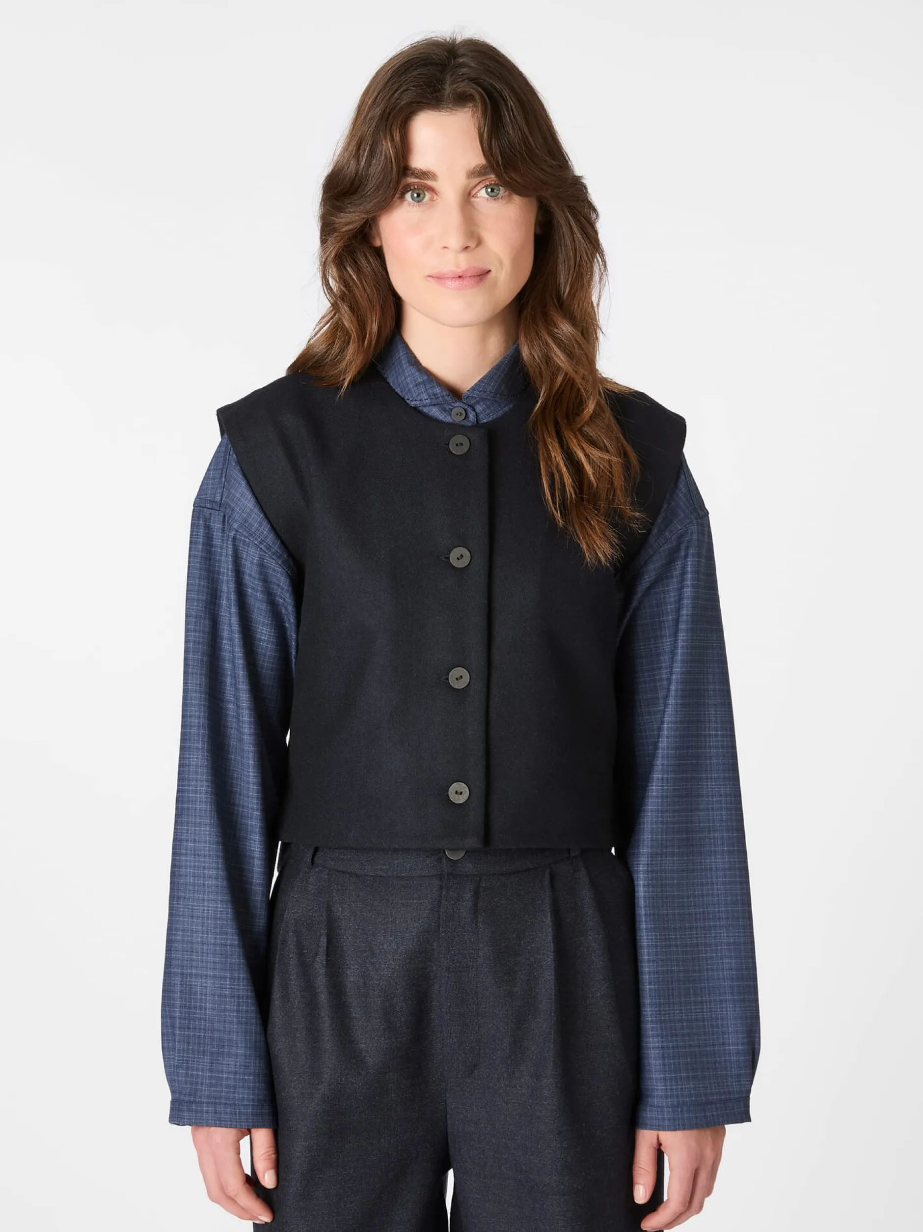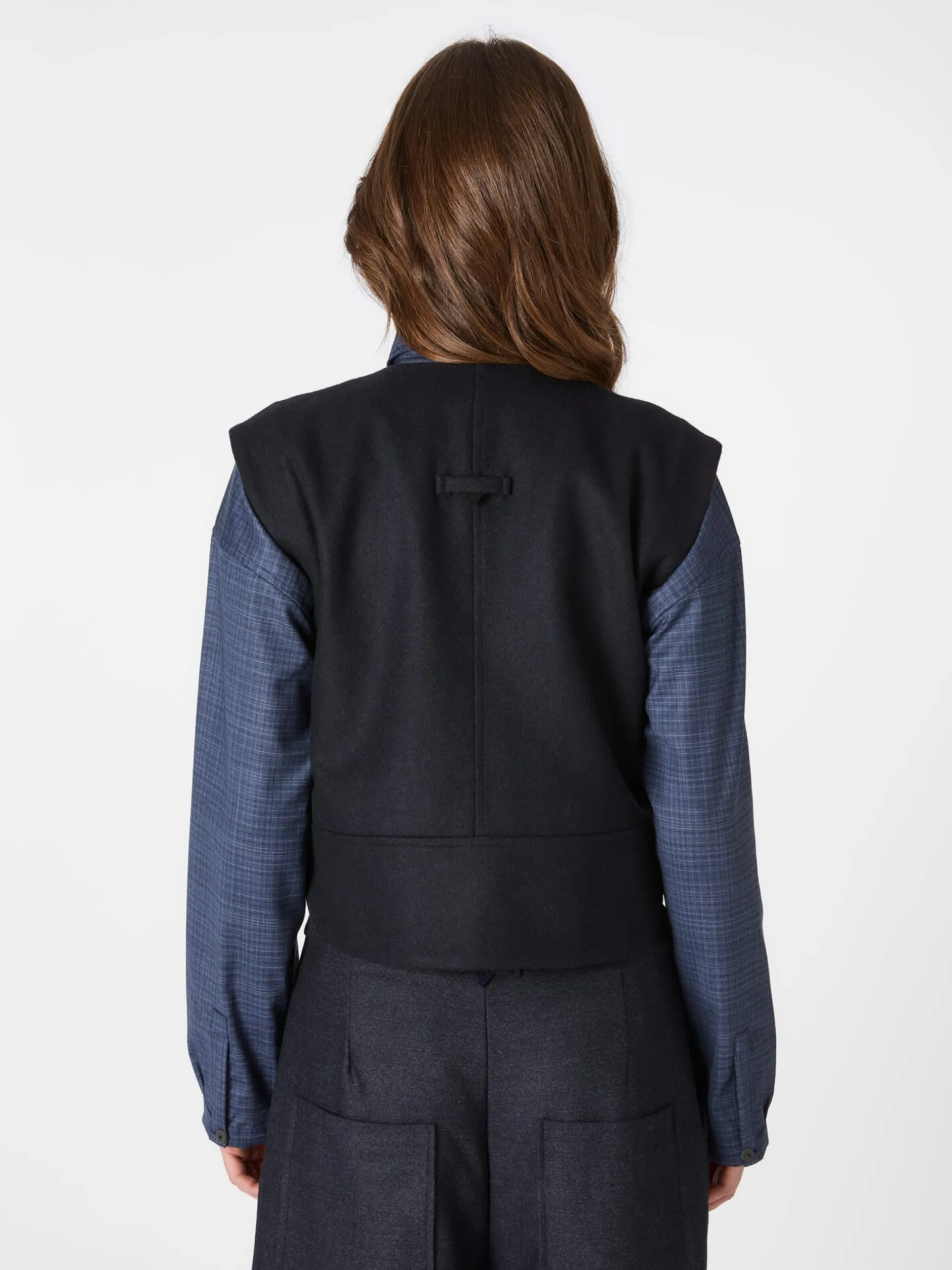 Diese wärmende, ungefütterte Weste konfektioniert Christiane Strobel aus einem dicht gewebten Tuch aus reiner Wolle. Der leicht antaillierte Schnitt und die Längsteilungsnaht im Rücken verschlanken die Silhouette optisch. Der Rumpfsaum ist vorn gerade und hinten gerundet. Seitenschlitze sorgen für mehr Bewegungsfreiheit. Kombiniert mit Bluse und Businesshose oder -rock im gleichen Farbton passt die Weste perfekt zu klassischen, eleganten Outfits. Im Mix mit Jeans und Shirt setzt sie legeren Looks das i-Tüpfelchen auf. Zu den markanten Details gehören die in Japan handgefertigten Papierknöpfe und das handgestickte Dreieck am rückseitig angebrachten Riegel.