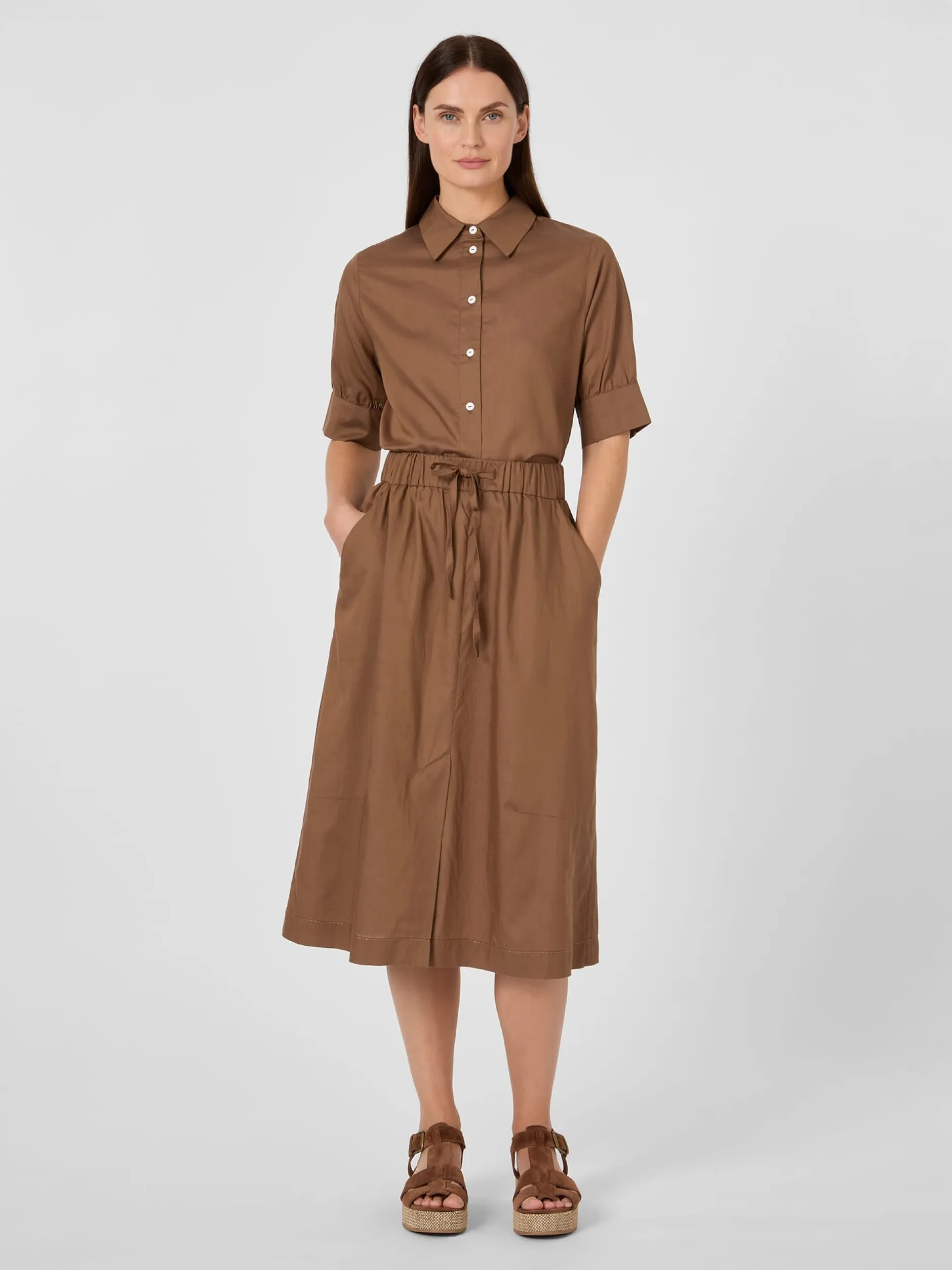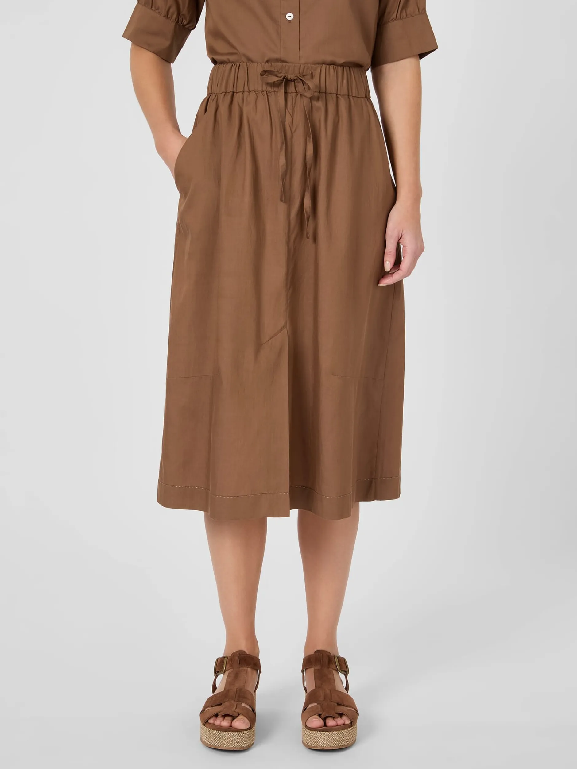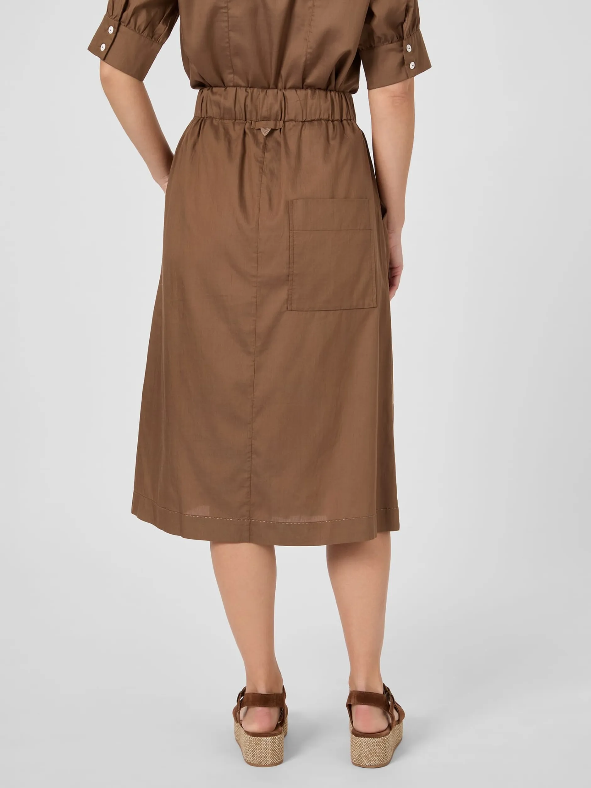 Lyocell (TENCEL™) und Baumwolle vereinen sich bei diesem überknielangen Rock zu einem leichten, weich auf der Haut liegendem und dennoch strapazierbarem Gewebe. Es zeigt einen zarten Glanz, ist atmungsaktiv und verleiht dem Rock einen fließenden Fall. Die lockere Passform in leichter A-Line erhöht den Tragekomfort, wozu auch der elastische Bund mit Bindeband beiträgt. Für noch mehr Bewegungsfreiheit ist der Rock vorn mit einem langen Gehschlitz gearbeitet. Zwei Seitentaschen nehmen Kleinteile des täglichen Bedarfs auf. Die große aufgesetzte Gesäßtasche schenkt dem eleganten Rock eine Spur Lässigkeit.