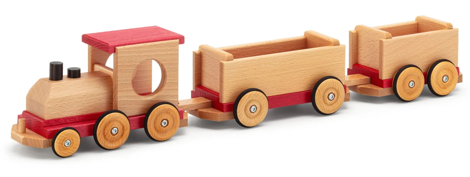 Eine Lokomotive und zwei Waggons aus Buchenholz, teilweise lackiert. Bereifung aus Silikon. Lokomotive Höhe 11 cm, Breite 9,5 cm, Länge 19,5 cm. Waggons Höhe 8 cm, Breite 9,5 cm, kurzer Waggon Länge 17,5 cm, langer Waggon Länge 22,5 cm. Gesamtlänge zusammengesteckt 55 cm. Gesamtgewicht 1,1 kg.