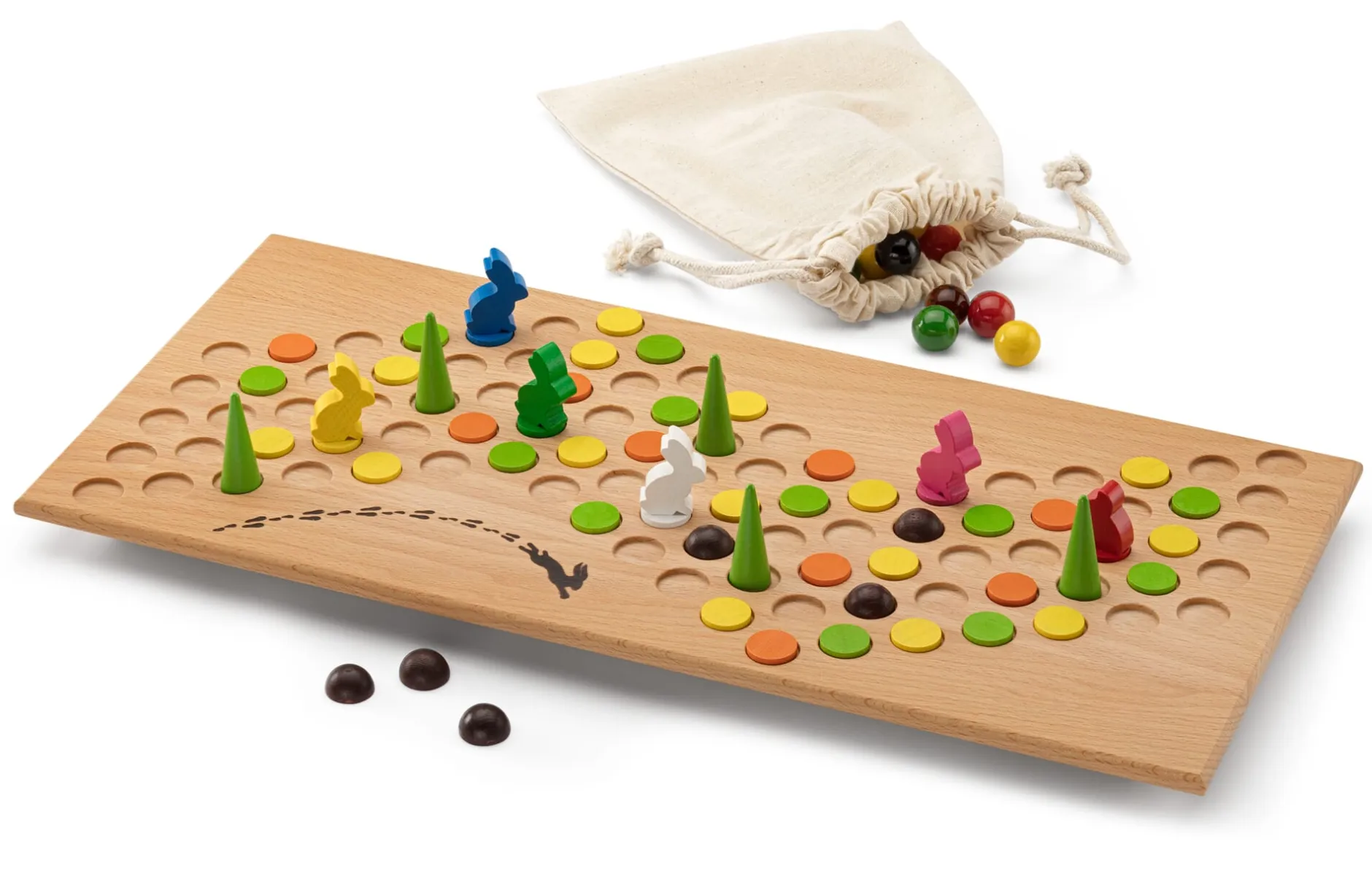 Die Spielregeln sind auch vom jüngsten Sprössling schnell durchschaut. Dass im Eifer des Rennens ein Zug auch einmal recht „energisch“ ausfallen kann, macht dem Spiel gar nichts: Material und Verarbeitung bekunden eine solide Robustheit, die selbst bei beherztem Zugriff und rasantem Lauf gelassen mitzieht. Spielbrett, Figuren und Spielsteine bestehen aus massivem, sorgfältig gefrästem und geschliffenem Buchenholz und nehmen bereits mit ihrer materialtypisch samtigen Haptik für sich ein. Derart hochwertig gearbeitet, ist das Spiel wie gemacht, um in der ganzen Familie viele Spieleabende lang Bewunderung für einen besonders raffinierten Laufweg und Gelächter über einen gewagten Sprung hervorzurufen. Auf die Plätze!