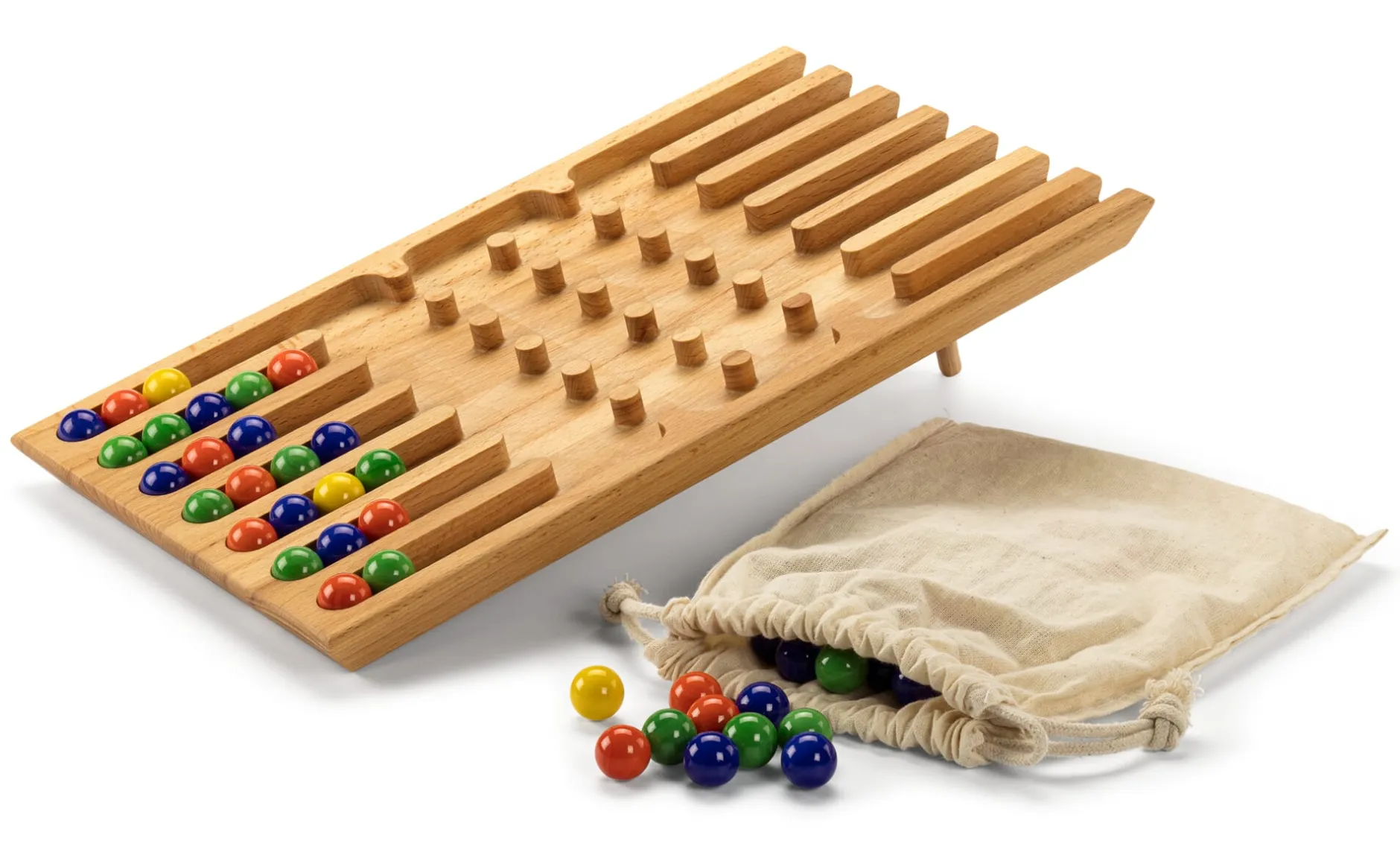Vor allem aber ist es eine spannende Herausforderung, der gerade Kinder begeistert und ausdauernd nachkommen, wenn ihre Murmeln schnell und vernehmlich durch die Bahnen des soliden Buchenholz-Spielbrettes klackern. Die Spieldynamik lässt sich stets neu variieren: Das Spielbrett bildet eine schiefe Ebene, deren Neigung mithilfe eines Rundstabs verstellt werden kann. Bei aller spielerischen Rasanz ist die Sorge um Spielbrett und Murmeln gänzlich unbegründet: Das Brett ist aus massivem geöltem Buchenholz gearbeitet, Bahnen und Hindernisse sind präzise platziert und passgenau ausgefräst – und die soliden Glasmurmeln klackern anhaltend munter im Zickzack durch ihre Bahn.