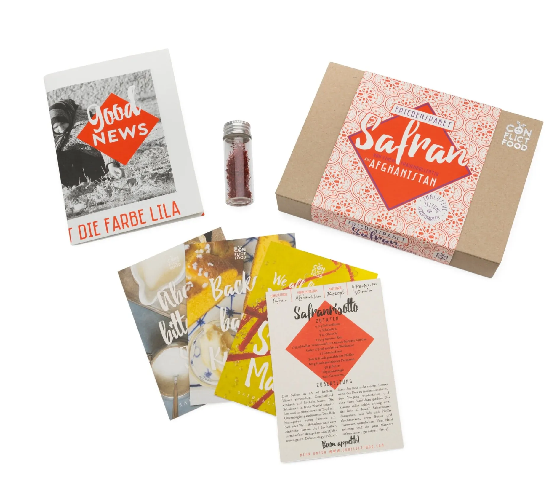 Afghanistan ist seit langem von kriegerischen Auseinandersetzungen und politischen Umwälzungen geplagt. Und das Land hat derzeit eigentlich nur ein landwirtschaftliches „Exportprodukt“, nämlich Opium. Dabei gibt es im Westen des Landes feinsten Safran, den ein Frauenkollektiv erntet und verarbeitet. Mit dem Erlös unterstützt Conflictfood jeweils Bildungseinrichtungen vor Ort. Der Safran im Glasröhrchen kommt in einer wunderschönen Schachtel, die nicht nur Rezepte und Informationen über das Projekt enthält, sondern auch eine weitergehende Nutzung ermöglicht.