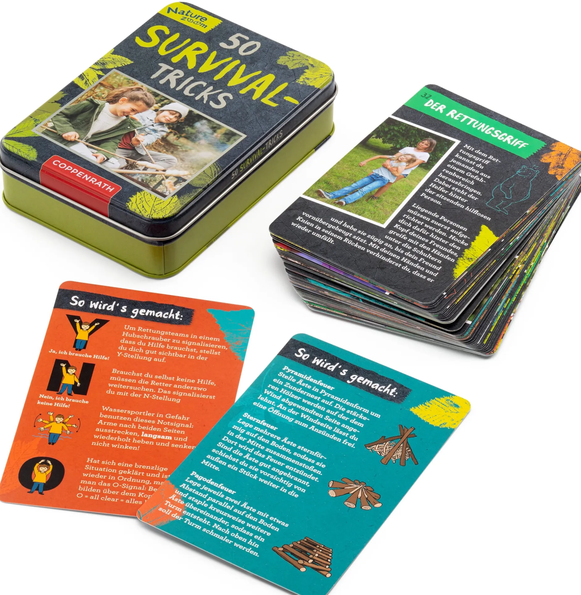 Mit hilfreichen Informationen und Tipps geben diese Karten Antworten und Anregungen. Praktisch und anschaulich führen die zahlreichen farbigen Illustrationen und Schritt-für-Schritt-Anleitungen durch unsere spannende Welt. Und mag die Herausforderung auch noch so groß sein, junge Forscher*innen und Entdecker*innen müssen sich nicht einmal um das Überleben dieser Ausrüstung sorgen: Die stabilen Karten sind abwischbar, sodass ihnen der übliche Abenteuerschmutz so schnell nichts ausmacht, und werden zusätzlich in der robusten Blechdose gut geschützt.