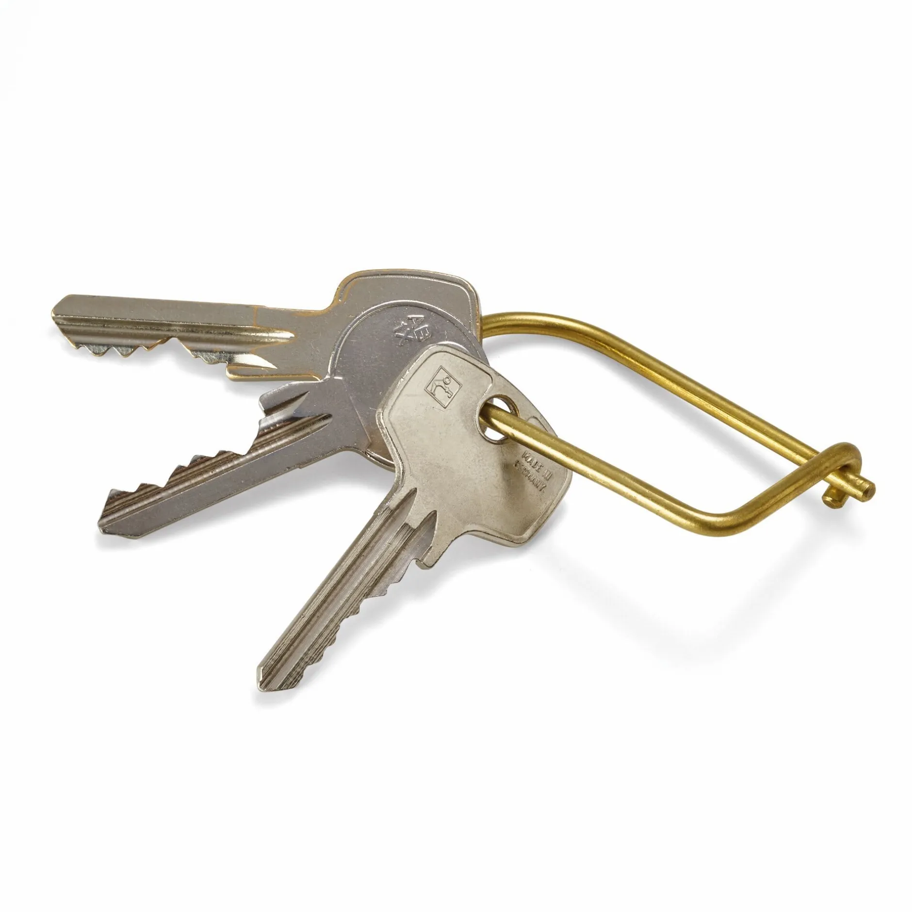 Kaltgeformt aus stabilem Messingdraht, steht dieser Schlüsselring so unter Spannung, dass eine einfache Hakenkonstruktion als Verschlussmechanik völlig ausreicht. Die filigrane Optik täuscht, denn der schlichte Ring kann auf diese Art und Weise diverse Schlüssel auf einmal halten. Hergestellt in den USA.