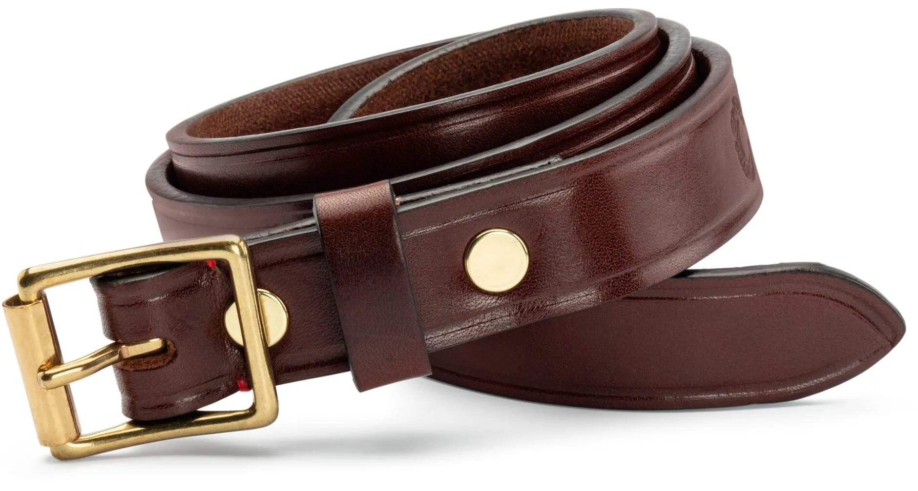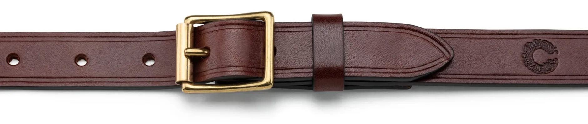 Einlagig. Rindleder (Stärke 3,8–4 mm), vegetabil gegerbt. Messingschließe. Hergestellt in England. Breite 2,5 cm. In den Längen 28 (80 cm), 30 (85 cm), 32 (90 cm), 34 (95 cm), 36 (100 cm), 38 (105 cm) und 40 (110 cm)