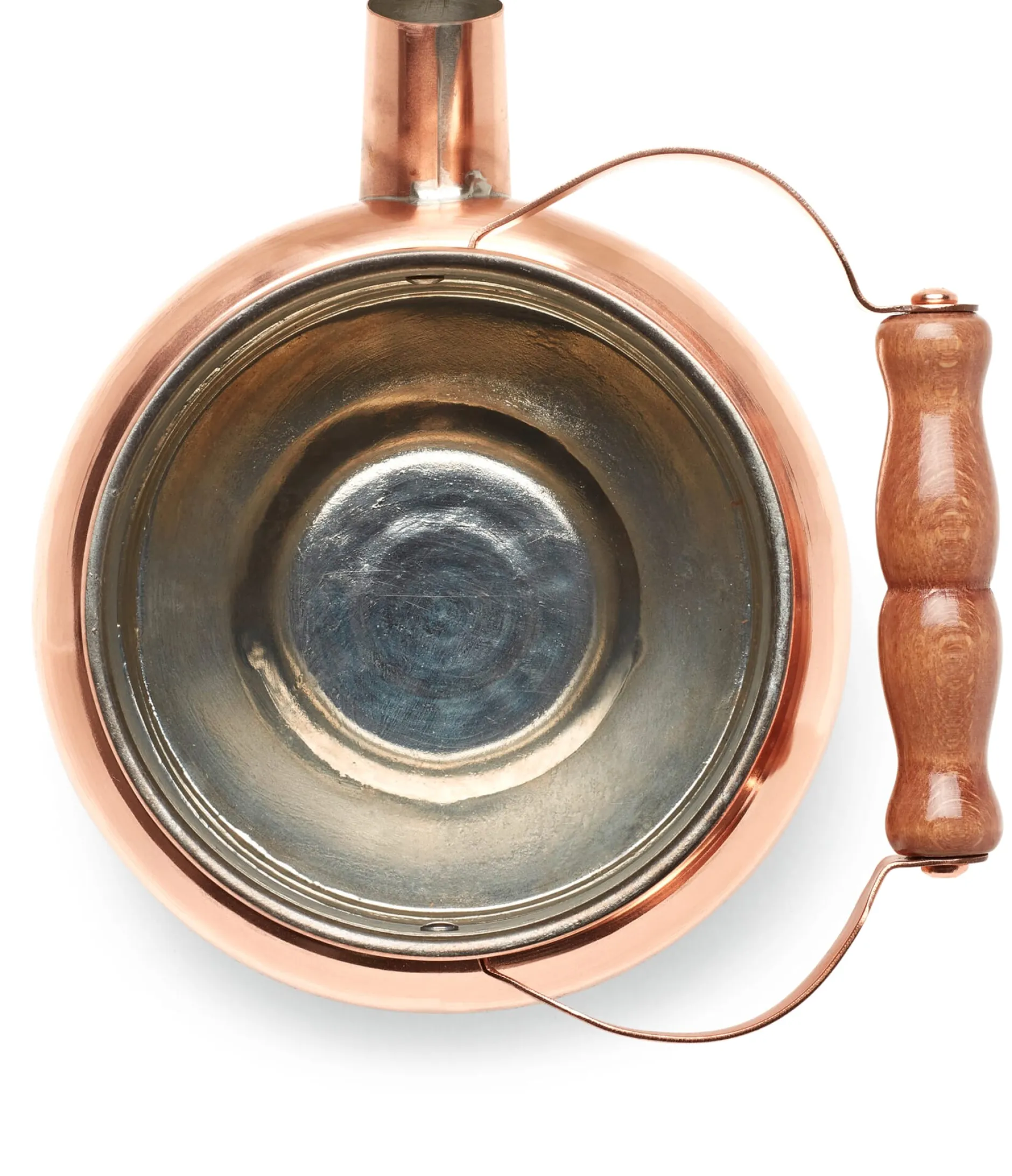 Kupfer, innen verzinnt. Handgriff Buchenholz lackiert, Deckelknauf Messing. Flöte aus Kupfer. Volumen 1,5 l. Boden Ø 13,5 cm, Korpus Ø 17 cm. Höhe mit aufgestelltem Griff 21,5 cm (mit zur Seite geklapptem Griff Ø 17 cm). Breite 21 cm. Gewicht 980 g. Nicht für Induktionskochflächen geeignet.