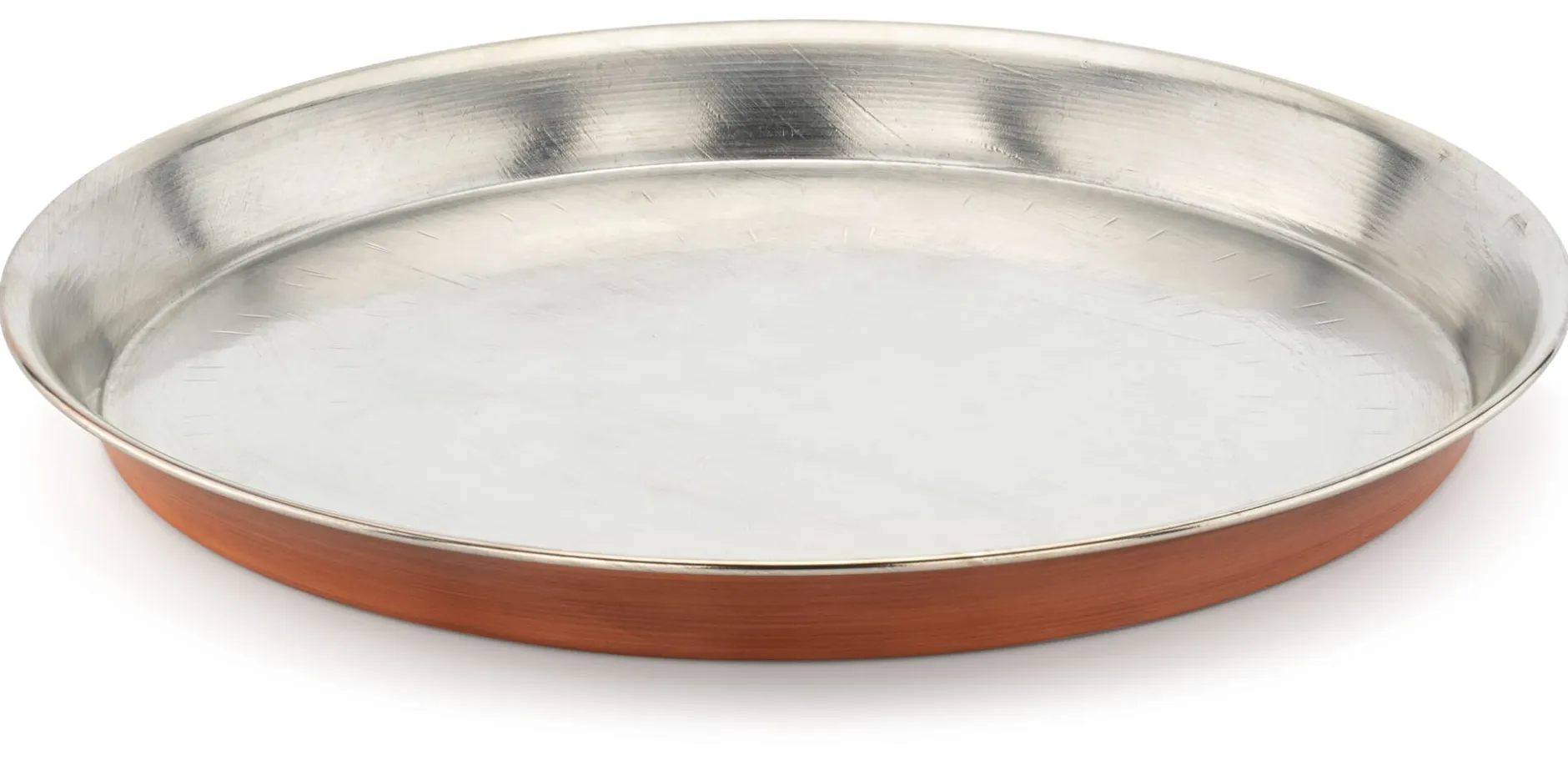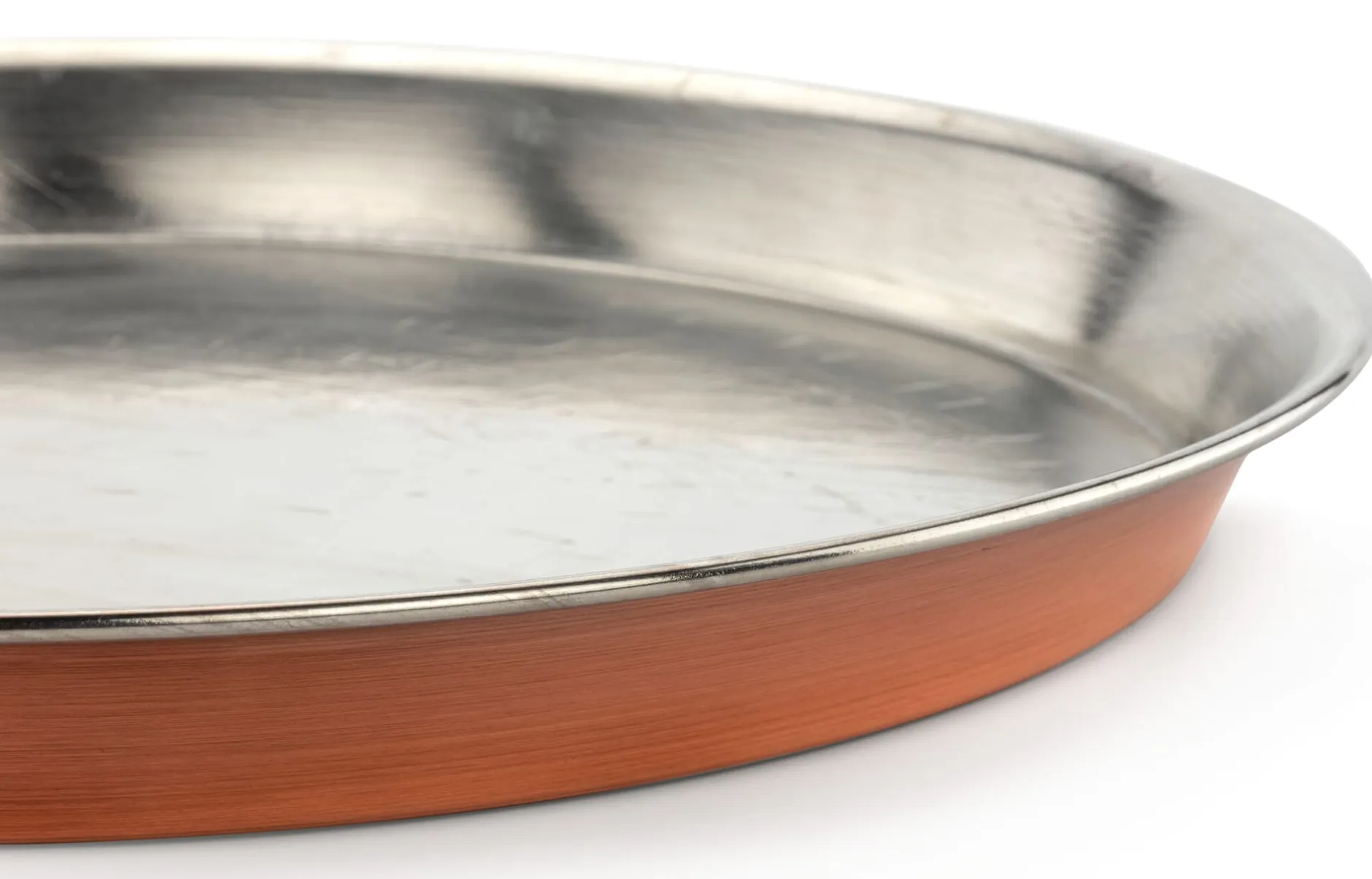 Kupfer, an der Innenseite verzinnt. Boden Ø 28 cm, Ø oben 31 cm. Randhöhe 2,5 cm. Gewicht 680 g. Lieferung in einer Pizzaschachtel aus bedrucktem Karton.