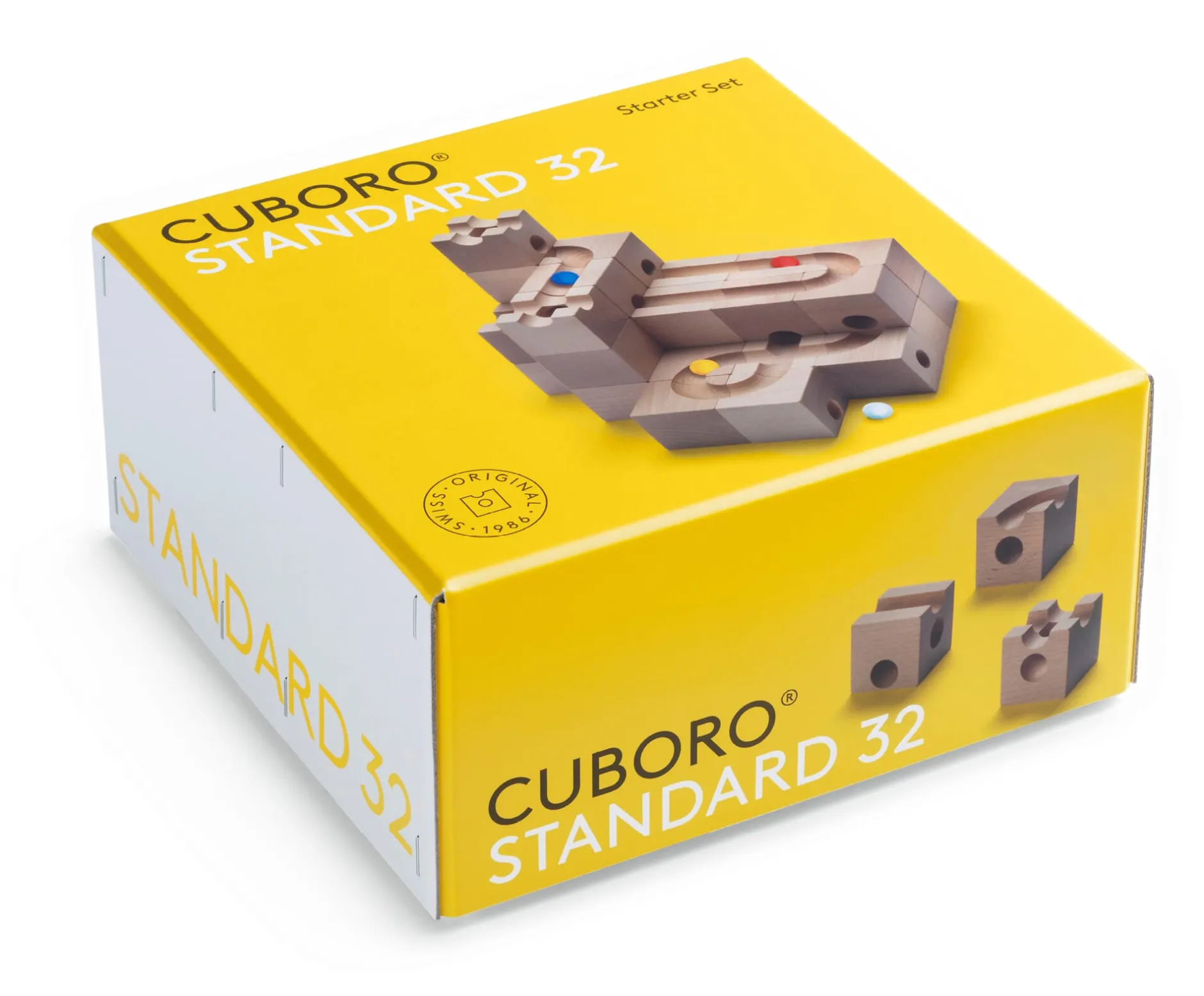 Ab 5 Jahre. Buchenholz (Herkunft Schweiz) naturbelassen. Set mit 32 bzw. 50 Würfel-Elementen (à 5 cm Kantenlänge) und 5 farbigen Glasmurmeln. Hergestellt in der Schweiz. Gewicht 3,2 bzw. 4,6 kg.