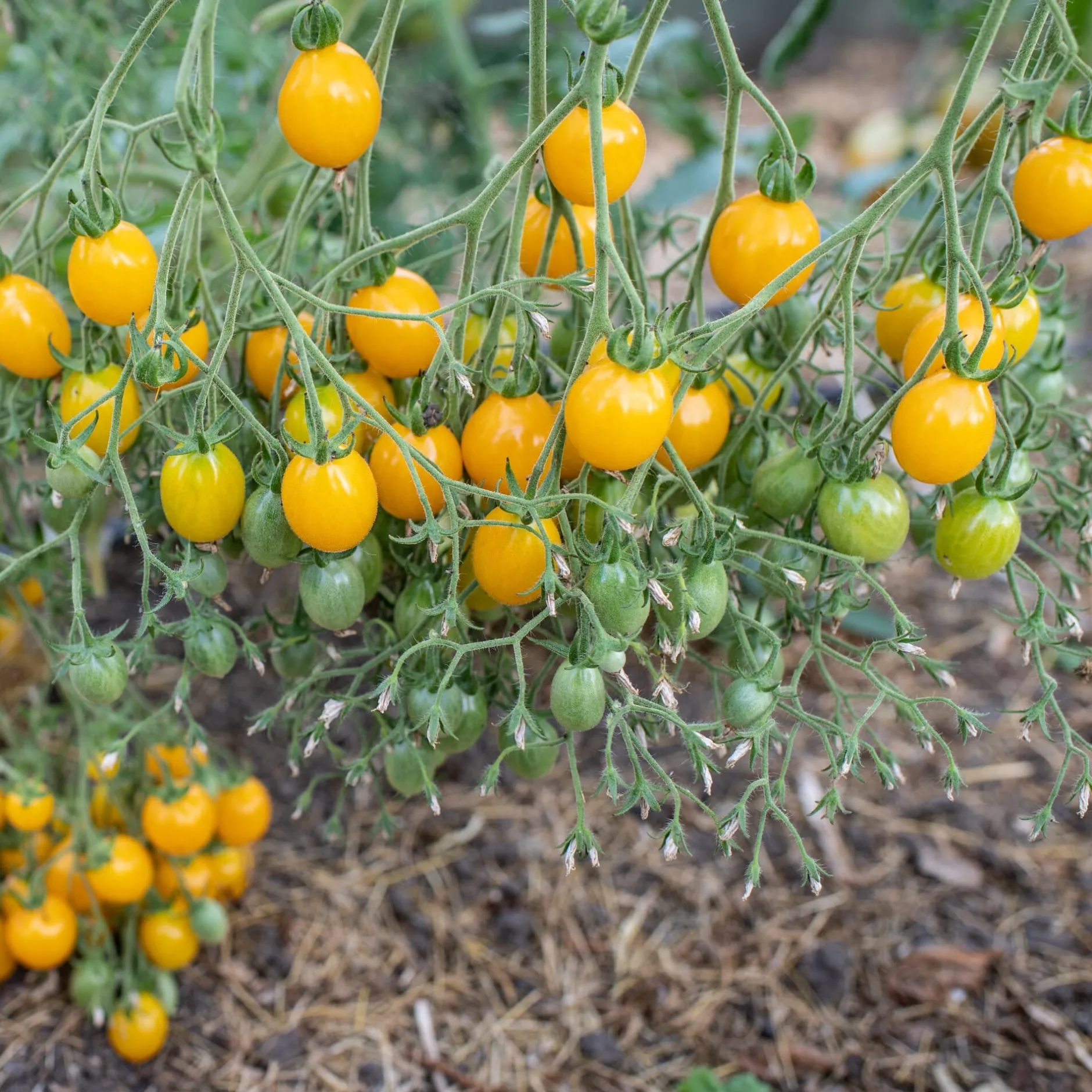 Eine gelbe Kirschtomate mit üppigen Fruchtständen voller kleiner, süß-aromatischer Tomaten. Wurden im Sommer nicht alle Früchte schon verspeist, können vor dem ersten Frost die kompletten Fruchtstände geerntet und aufgehängt eingelagert werden. Die Früchte daran halten noch wochenlang ohne einzutrocknen. Die Pflanze ist hochwachsend, mit beachtlichem Ertrag und gedeiht am besten im Gewächshaus oder unter einem Dach geschützt.