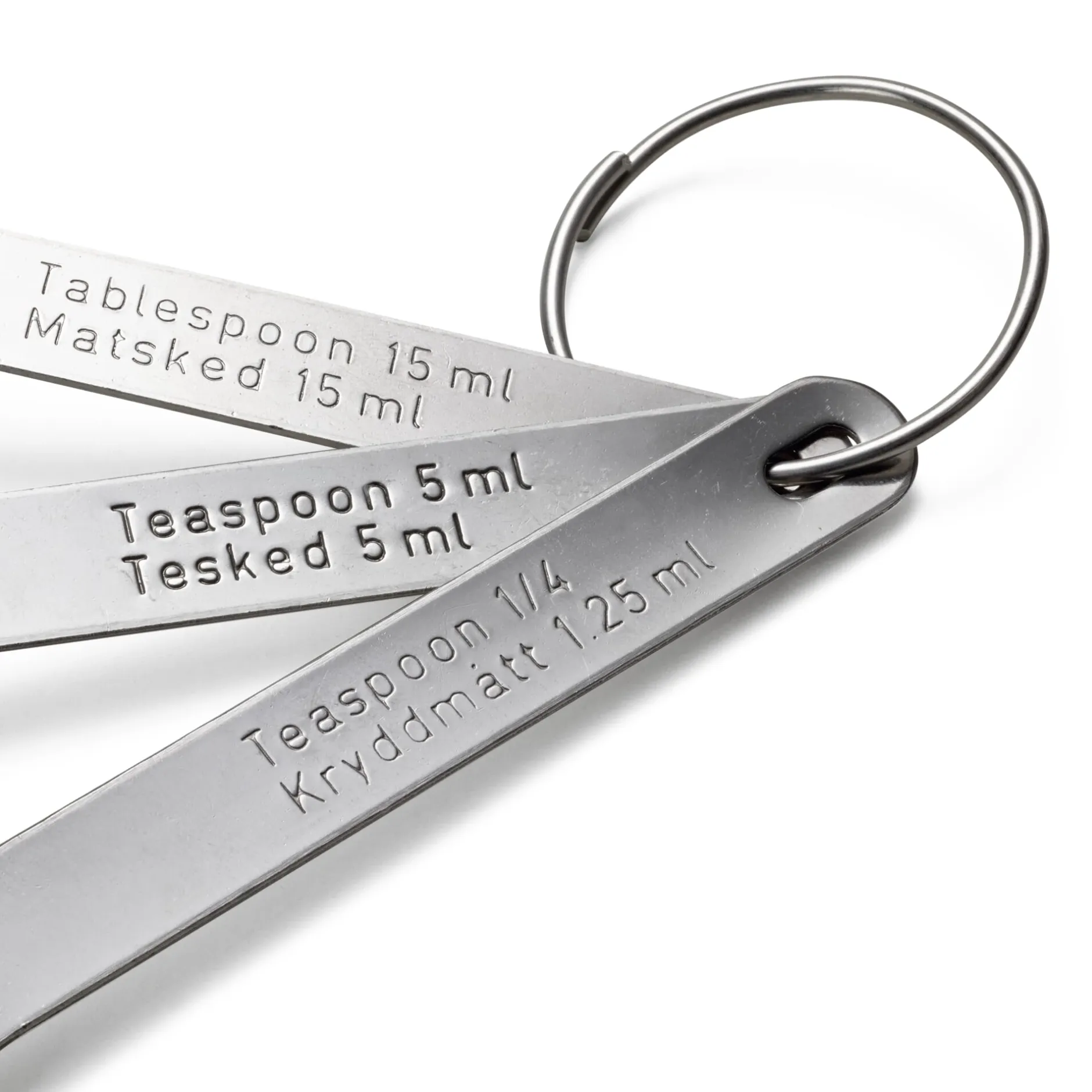 3 Löffel, je einer mit dem Maß Esslöffel (15 ml, Länge 12 cm, Gewicht 25 g), Teelöffel (5 ml, Länge 11 cm, Gewicht 15 g) und Viertel-Teelöffel (1,25 ml, Länge 10,5 cm, Gewicht 10 g).