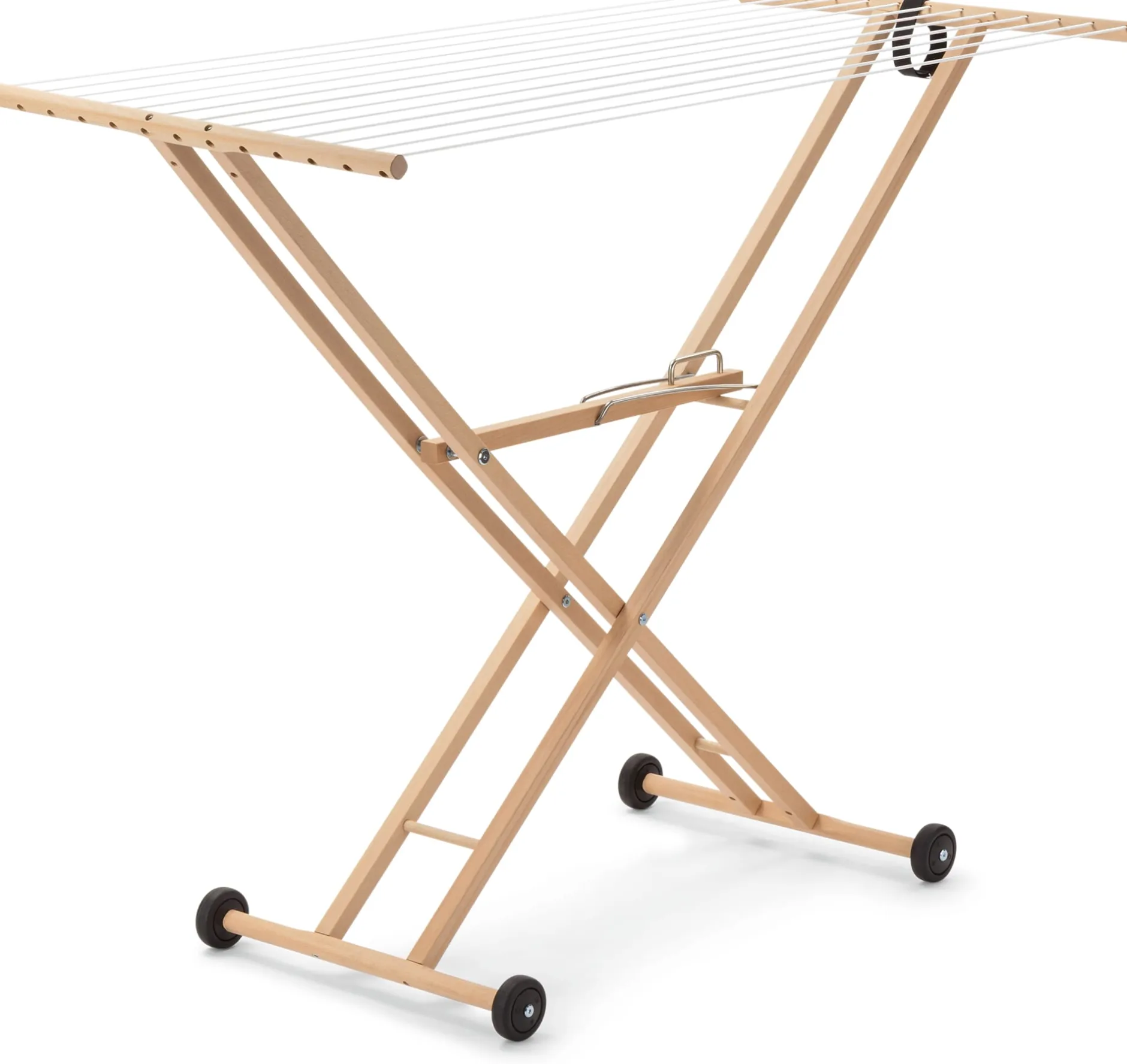Er wirkt so stilvoll wie ein Möbelstück, dabei ist dieser Wäscheständer in seinem Wesen ein echtes Arbeitstier. Aus massivem heimischem Buchenholz gebaut, ist er nicht nur optisch, sondern dank der samtig glatt geschliffenen Holzoberfläche auch haptisch ein Erlebnis. Standsicher und kippfest ist er allemal und außerdem auf den kugelgelagerten, bodenschonend gummibelegten Rädern leichtgängig rollbar – von geradezu unschätzbarem Vorteil, wenn die Wäsche bei plötzlich einsetzendem Donnerwetter schnellstens von Terrasse oder Balkon gerettet werden muss (ohnehin sollte der Wäscheständer witterungsgeschützt stehen). Er ist höher als herkömmliche Wäscheständer, sodass Laken und größere (Tisch-)Decken nicht über den Boden schleifen, und auch wenn er selbst gerade einmal 4,5 Kilogramm auf die Waage bringt, nimmt er eine Belastung von bis zu 20 Kilogramm gelassen hin. Die Wäscheleinen sind in 13 Einzelbahnen gespannt, so bleiben sie zuverlässig straff. Zusammen ergeben die Leinen eine nutzbare Länge von rund 18 Metern, auf denen auch eine größere Waschmaschinenfüllung ausreichend Platz zum luftigen Trocknen findet.