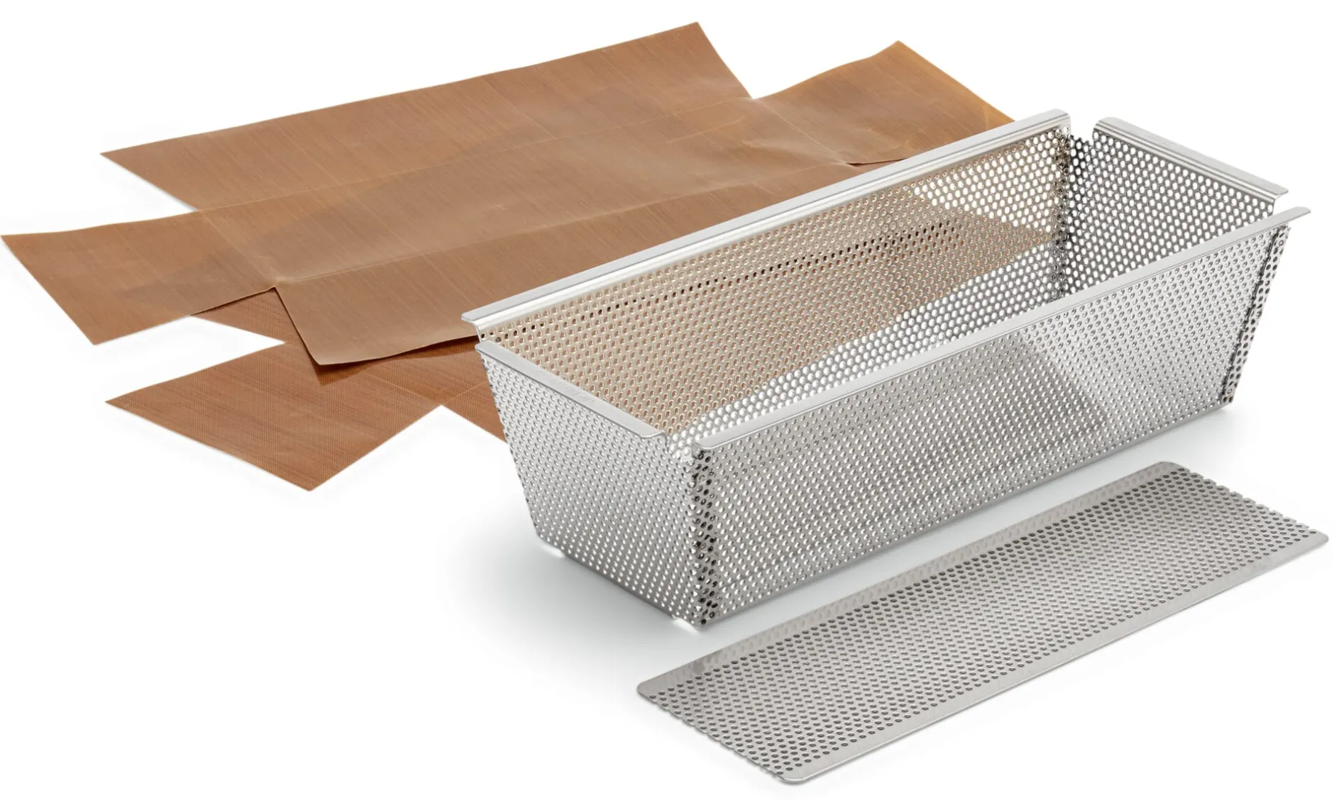 Zweiteilige Backform aus Edelstahl. Perforierung Ø 2 mm. Je zwei passend zugeschnittene Backfolien für Boden und Rand liegen bei. Für die Spülmaschine geeignet.