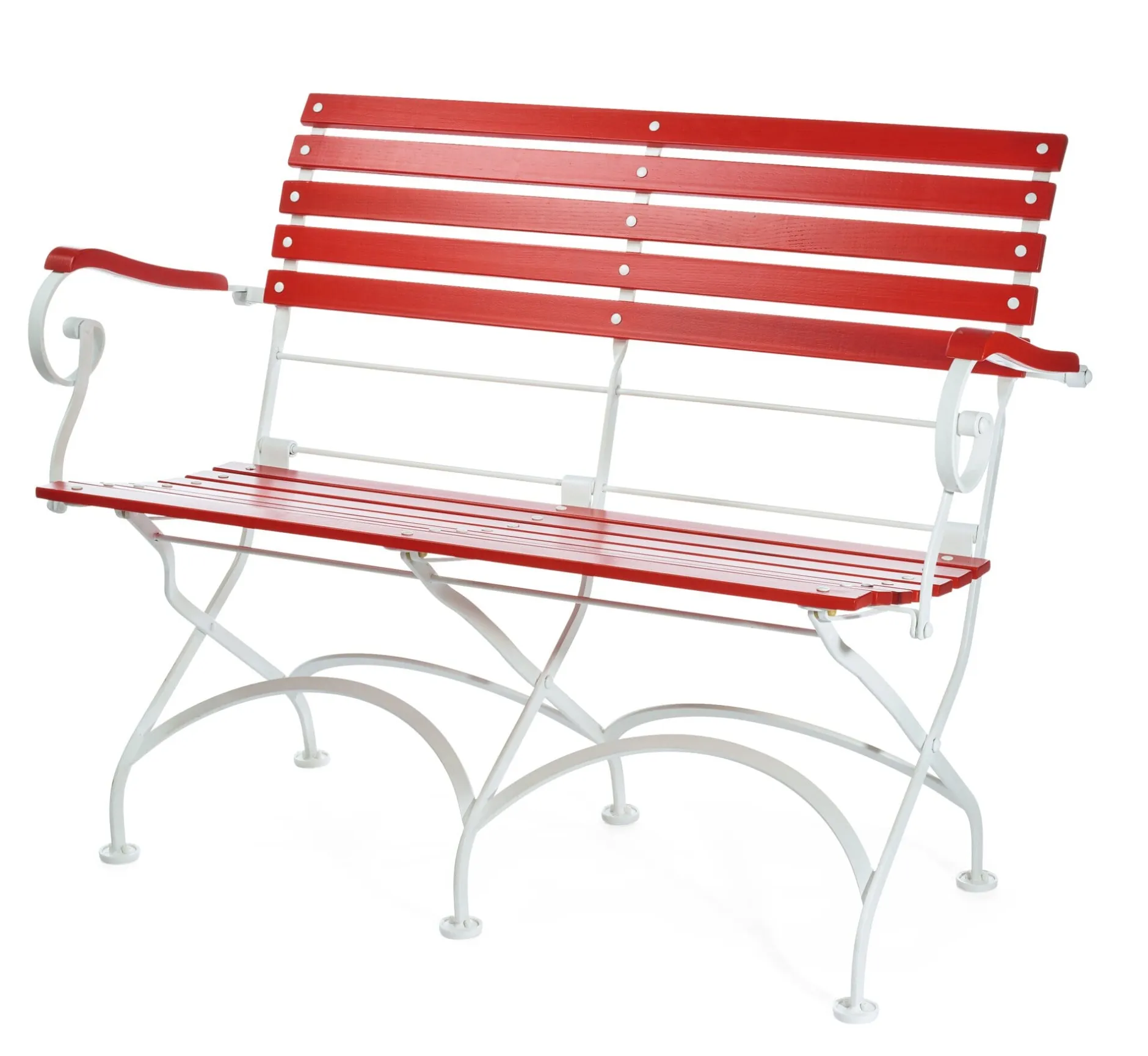 Klassisch an dieser Gartenbank ist neben der geschwungenen Form der Sitz- und Anlehnfläche, auf der es sich auch ohne Polster oder Unterlage bequem sitzen lässt, auch die Farbkombination aus leuchtendem Rot und hellem Weiß. Recht ungewöhnlich für ein Gartenmöbel diesen Ausmaßes ist, dass es sich so schmal zusammenklappen lässt.