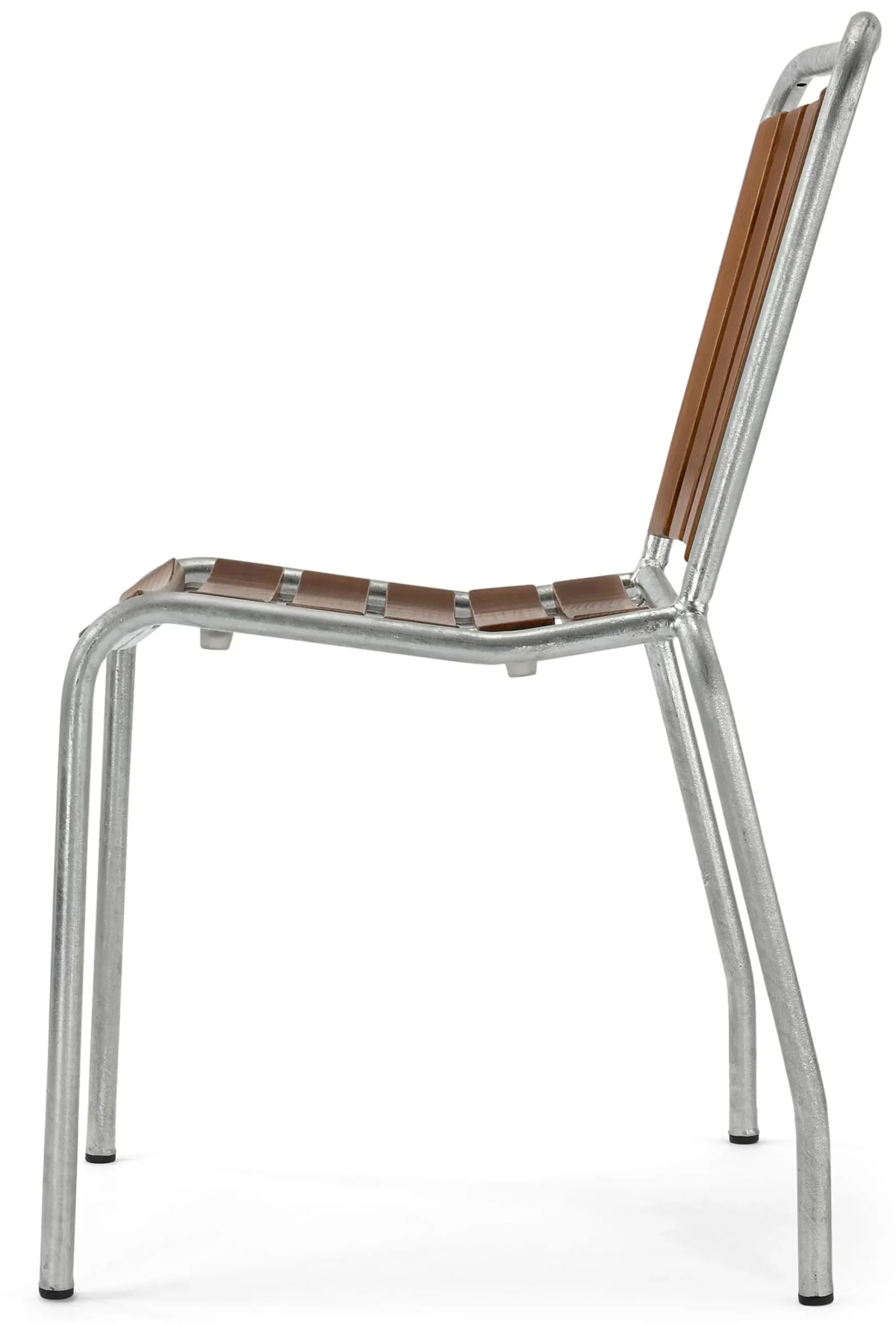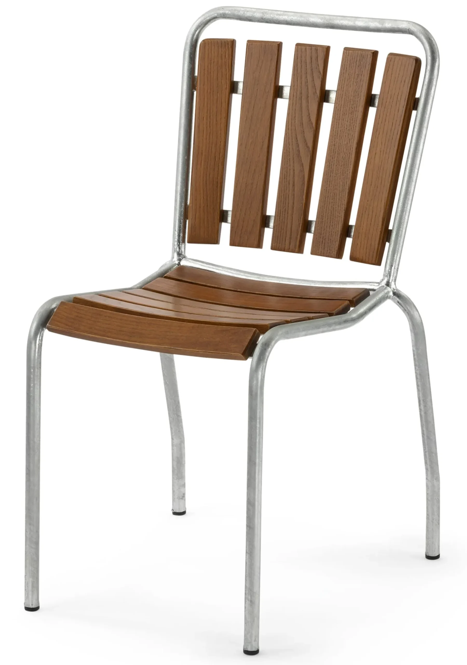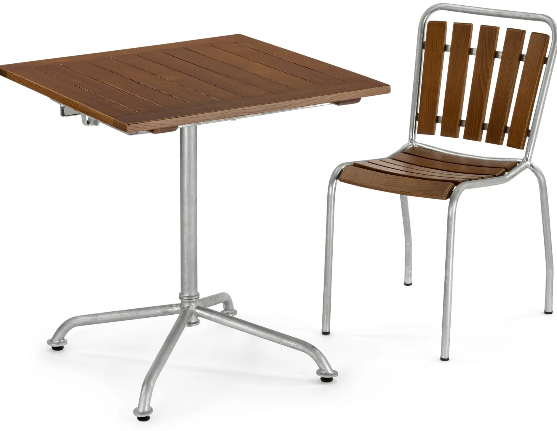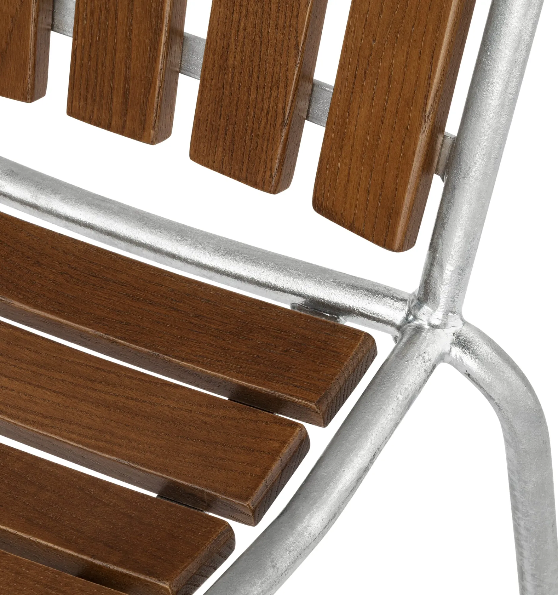 Gestell Stahl feuerverzinkt, Auflagen Kastanienholz lackiert (Holzherkunft Türkei). Höhe 81 cm, Breite 38 cm, Tiefe 50 cm. Sitzfläche 33 × 37 cm, Sitzhöhe 42 cm. Gewicht 6,9 kg.