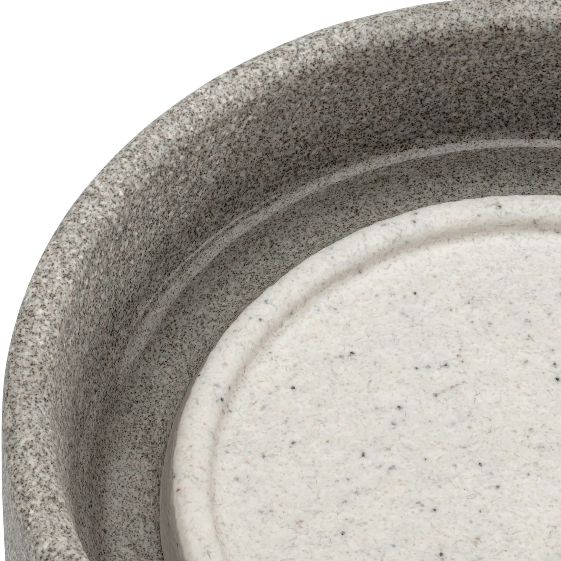 Schale aus Granicium® (Granitkeramik), Ø 18,5 cm, Höhe 5,5 cm. Pflanzstein aus Porosium® (keramisch gebundene Quarzkörner), Ø 12,5 cm, Höhe 2 cm. Gesamtgewicht 1,4 kg. Eine Tüte Saatgut wird für den Anfang mitgeliefert.