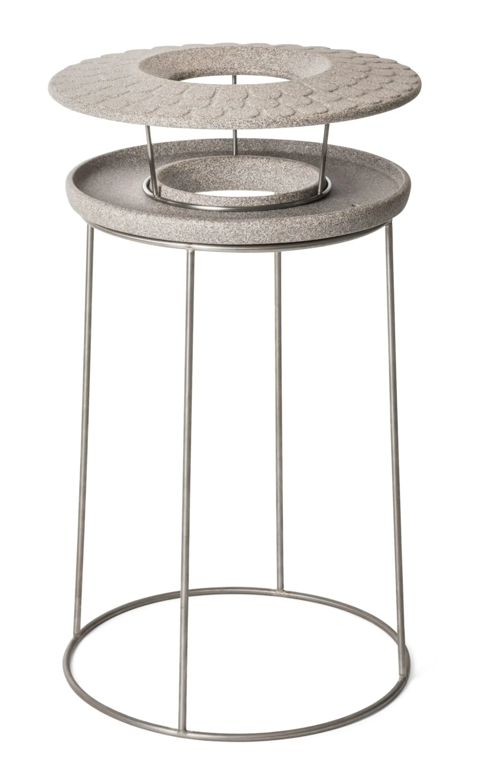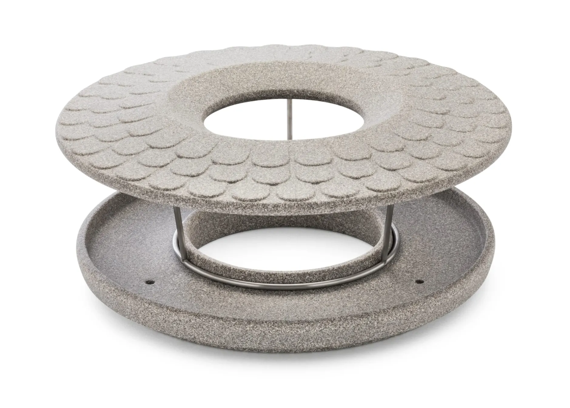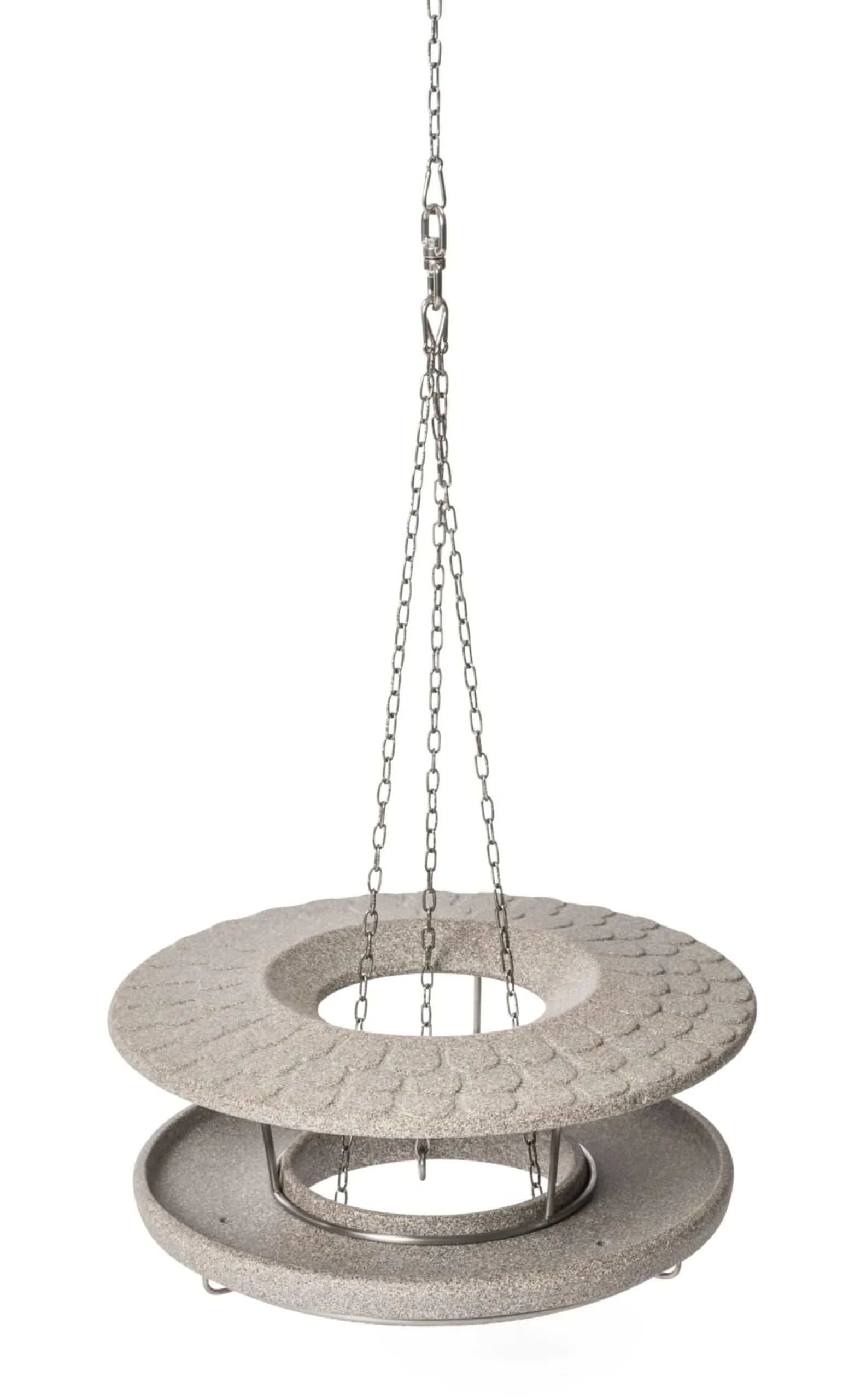 Echter Granit ist das Ausgangsmaterial, der zu Gesteinsmehl zerkleinert und in einem zweiten Schritt zu einer formbaren Masse ähnlich keramischem Ton verarbeitet wird. Diese Masse wird Granicium® genannt und ist eine Eigenentwicklung des Herstellers in Franken. Man muss sie mit Vorsicht behandeln, wenn man sie formen will, und einen Trocknungsprozess von etwa zwei Wochen Dauer einkalkulieren, bis ein Gegenstand daraus bei sehr hohen Temperaturen im Gasbrand überhaupt gebrannt werden kann. Wie dieses Futterhaus, das aus einer großzügen, ringförmigen Fläche und einem über diese noch etwas hinausragenden Dach mit Edelstahlgestänge besteht, das die Körner und Nüsse trocken hält. An einem stabilen Haken kann ein Vogelknödel herunterhängen. Somit können sogar die verschiedenen Futtervorlieben der bei uns lebenden Gartenvögel berücksichtigt werden. Die einen bevorzugen das Fettfutter aus dem Vogelknödel und die anderen das Streufutter.