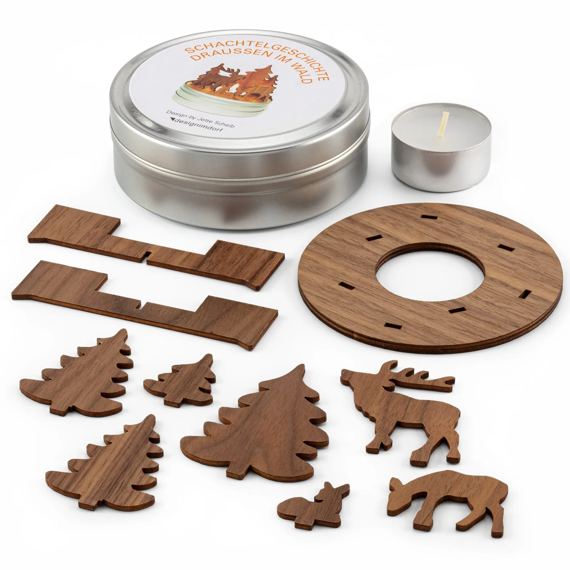 Teelichthalter Schachtelgeschichte Wald: Steckteile, Figuren aus Nussbaumholz und Teelicht in einer Metalldose.