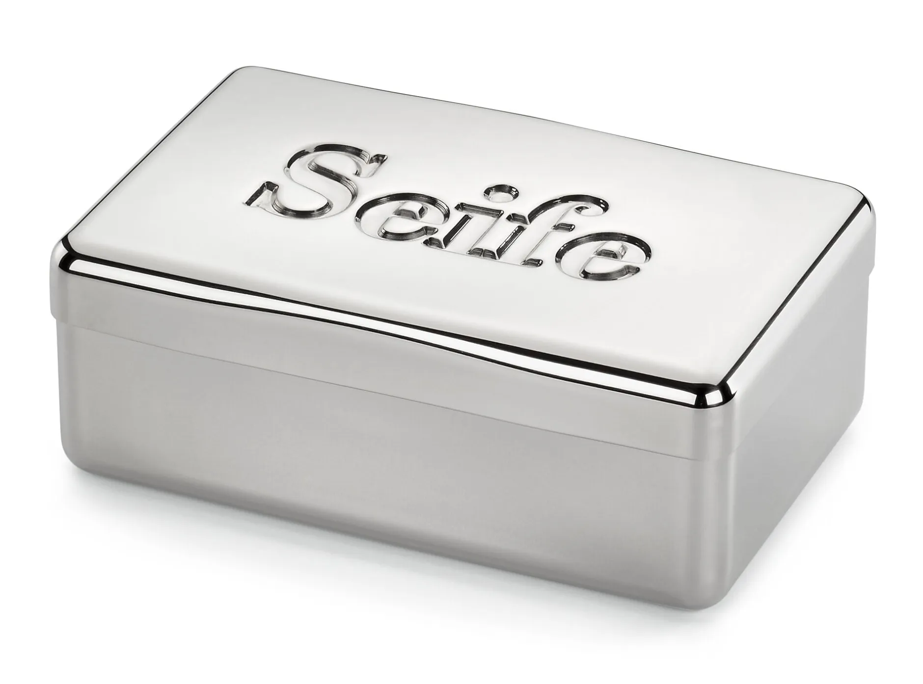 Seifendose aus Neusilber (einer Legierung aus Kupfer, Nickel und Zink), poliert. Hergestellt in Deutschland. 9,1 × 5,6 × 3,4 cm. Innenmaß 8,5 × 5,4 × 3 cm. Gewicht 80 g. Lieferung ohne Seife.