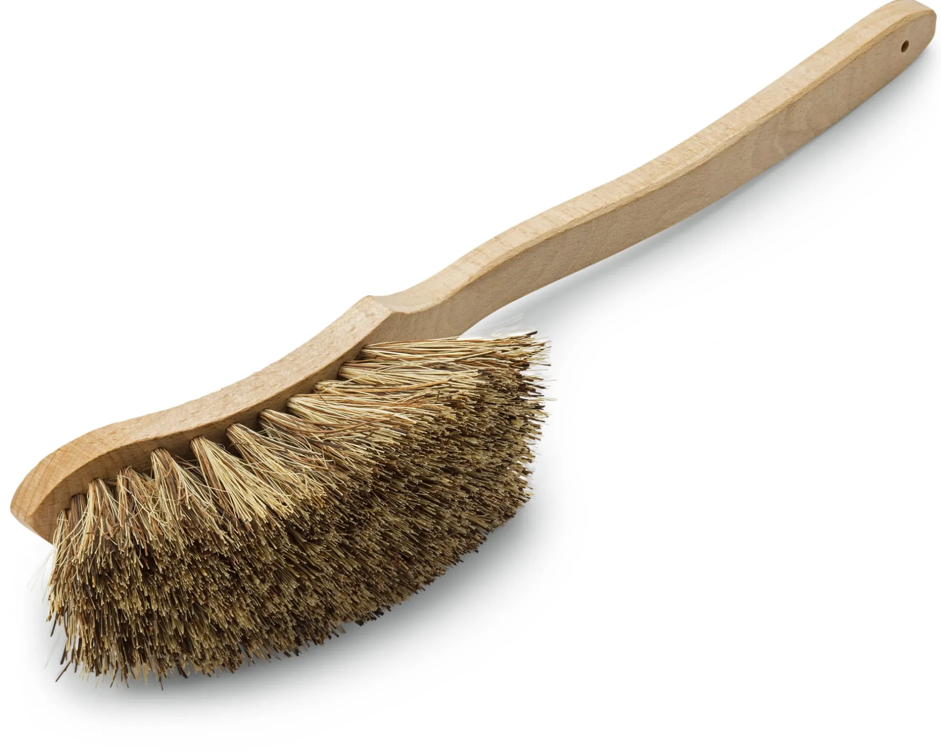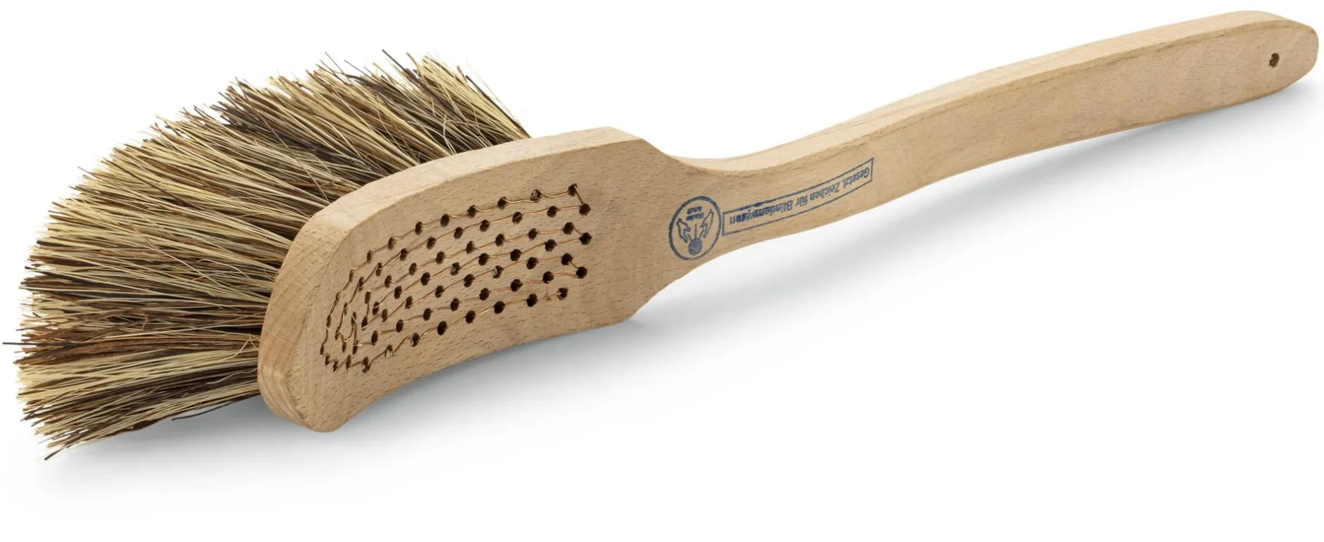 Die Bürste wird komplett in Handarbeit in einem nordrhein-westfälischen Sozialbetrieb gefertigt. Die Borsten werden von Hand eingezogen – zu erkennen am Kupferdraht, der die Borsten zusammenhält und die einzelnen Bündel fest mit dem Holzkorpus verbindet. Der Besatz besteht aus Union, einer Kombination aus sehr widerstandsfähigen Naturfasern: Naturfibre, den äußerst elastischen Blattrippen der Agave, sowie Bassine, den kräftigen Blattfasern der Sagopalme. Beide Fasern sind sehr zäh, bruchfest und resistent gegen Nässe, Säure, Lauge und Hitze.