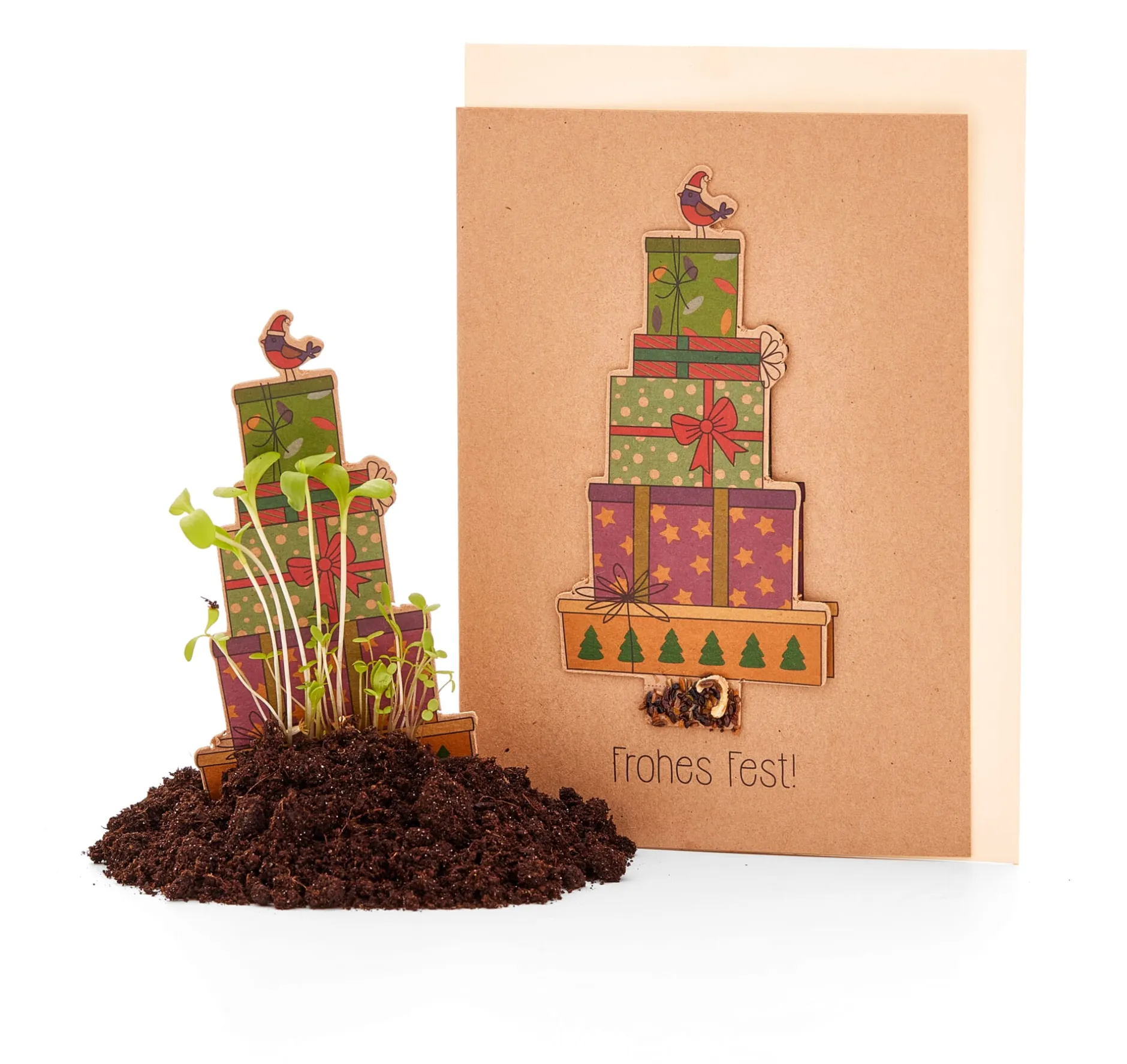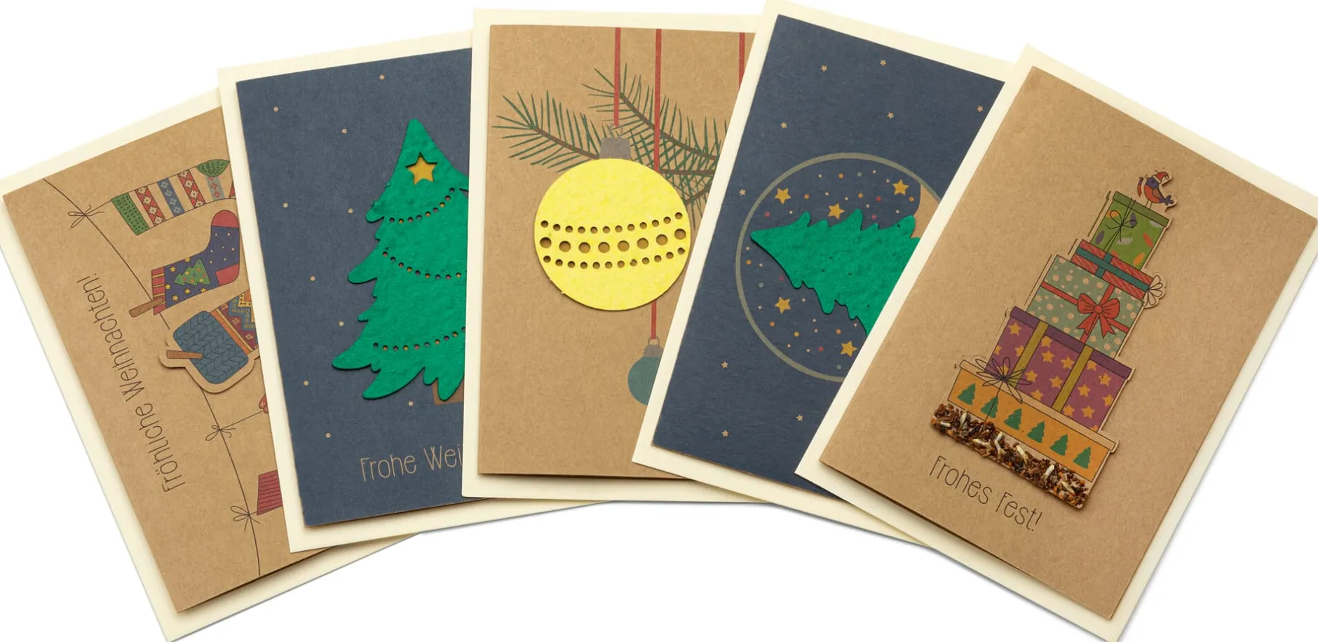 Weihnachtsgrüße, die bis in den Spätsommer hinein blühende Freude bringen, sind doch die schönsten Grüße. Finden Sie nicht auch? So bieten wir Ihnen hier ein 5er-Set Grußkarten im Klappkartenformat mit Festtagsmotiven an, in denen Sämereien von Wildblumen versteckt sind. Die Empfänger*innen Ihrer Weihnachtspost erhalten mit der Grußkarte je nach Motiv Saatpapier oder Saatgutstecker, die in etwas Erde im Blumentopf oder ins Beet gelegt beziehungsweise gesteckt und zum Erblühen gebracht werden können. Das jeweilige Kartenmotiv bleibt dabei sogar erhalten, da es zusätzlich auf die Vorderseite der Karten aufgedruckt ist.