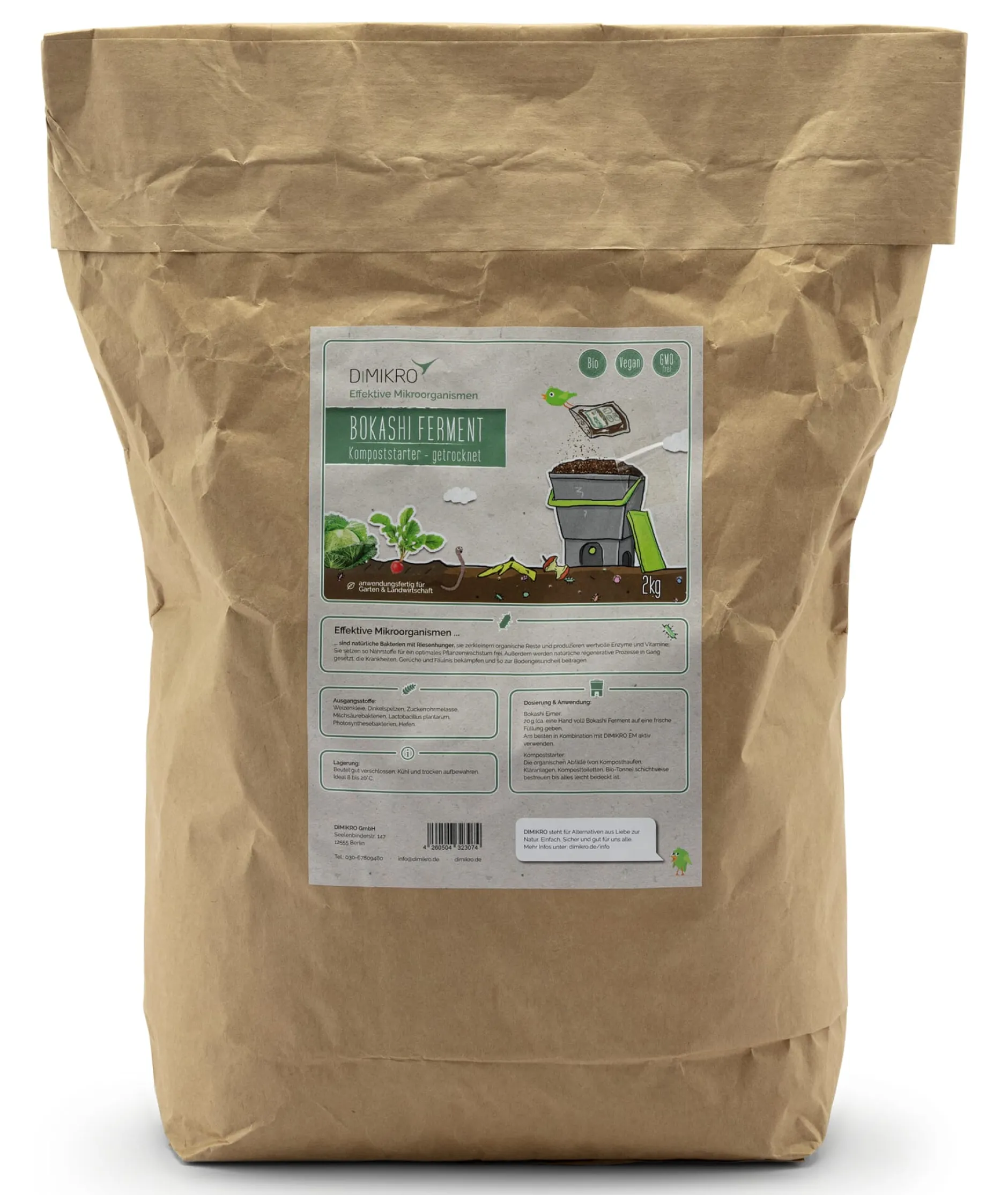 Das japanische Wort „Bokashi“ beschreibt einen Kompostier- oder Zersetzungsvorgang, bei dem vornehmlich Küchenabfälle durch Zugabe von Effektiven Mikroorganismen (EM) fermentiert werden. So verwandeln Sie Ihren Biomüll spielend leicht in hochwertigen Dünger, Bodenverbesserer und Kompostbeschleuniger. Und damit Sie diesen Prozess stets von Neuem in Gang setzen können, bieten wir das unserem Bokashi Küchenkomposter beiliegende Trockenferment hier in der 2-kg-Nachfüllpackung an. Es wird in Deutschland auf der Basis von schonend getrocknetem und fermentiertem Getreide, Melasse sowie Effektiven Mikroorganismen hergestellt. Als Streumittel eignet es sich besonders für feuchte organische Abfälle, es unterbindet Gerüche, die bei der Zersetzung entstehen können, und verhindert Schimmelbildung.