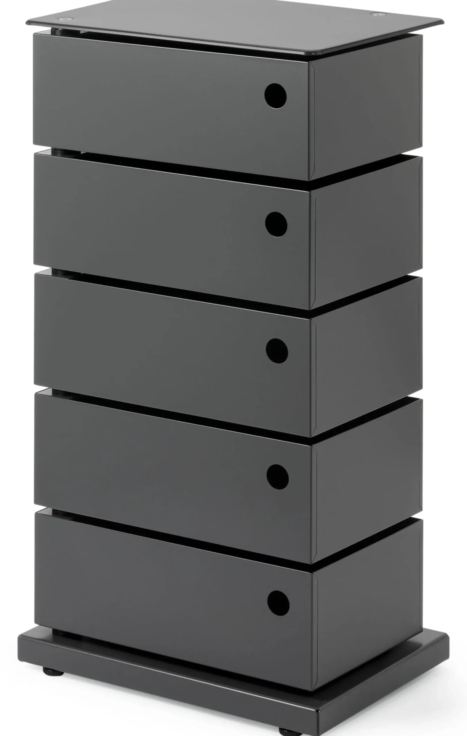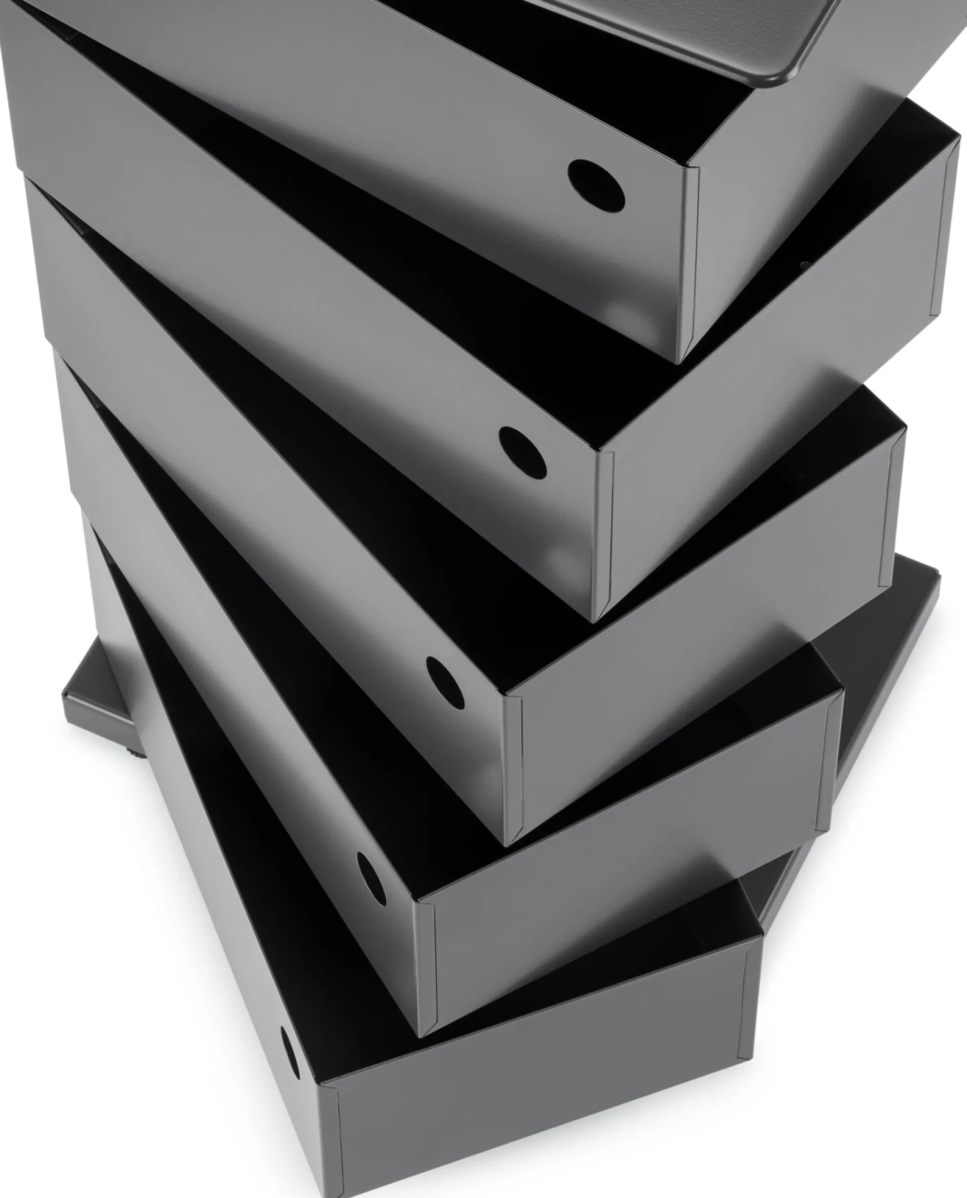 Im englischen Sprachraum „Pivot Cabinet“ genannt, verweist diese Bezeichnung – „pivot“ bedeutet so viel wie „Drehgelenk“ oder „Schwenkachse“ – auf das wesentliche konstruktive Element des Containers: Die einzelnen Laden werden an einer Achse aufgeschwenkt, nicht aufgezogen oder -geklappt, wie üblich. Diese Konstruktionsidee wurde unter anderem durch Joe Colombos 1970 entwickelten Rollcontainer „Boby“ bekannt. Der italienische Architekt war zugleich einer der führenden futuristischen Industriedesigner der 1960er Jahre, einer Zeit der Aufbruchstimmung und Zukunftsvisionen, die – folgt man beispielsweise Herbert Marcuses Gedankengang – den Weg aus dem Reich der Notwendigkeit in das Reich der Freiheit zu bahnen suchten. Entwürfe wie Verner Pantons Freischwinger „Panton Chair“, Olivier Mourgues Sessel „Djinn“, der in „2001 – Odyssee im Weltraum“ das Interieur schmückte, und Colombos „Tube Chair“ wurden zu Ikonen. Colombos „dynamische Möbelstücke“ zielten dabei stets auch auf Multifunktionalität ab.