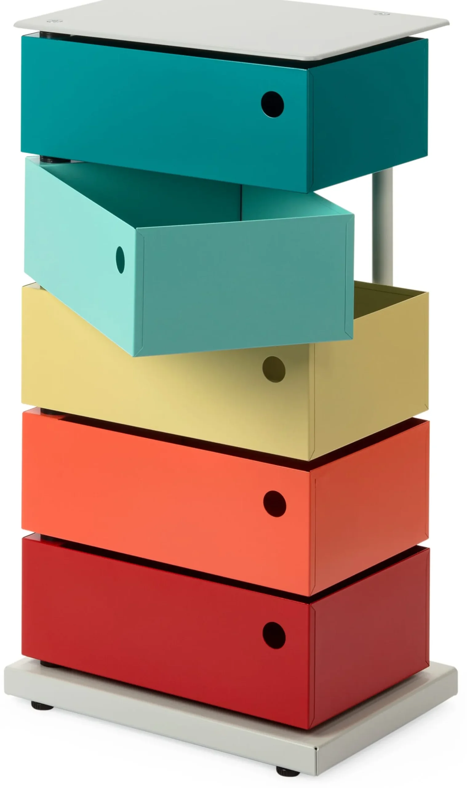 Im englischen Sprachraum „Pivot Cabinet“ genannt – „pivot“ bedeutet so viel wie „Drehgelenk“ oder „Schwenkachse“ –, verweist diese Bezeichnung auf das wesentliche konstruktive Element des Containers: Die einzelnen Laden werden an einer Achse aufgeschwenkt, nicht aufgezogen oder -geklappt, wie üblich. Diese Konstruktionsidee wurde unter anderem durch Joe Colombos 1970 entwickelten Rollcontainer „Boby“ bekannt. Der italienische Architekt war zugleich einer der führenden futuristischen Industriedesigner der 1960er Jahre, einer Zeit der Aufbruchstimmung und Zukunftsvisionen, die – folgt man beispielsweise Herbert Marcuses Gedankengang – den Weg aus dem Reich der Notwendigkeit in das Reich der Freiheit zu bahnen suchten. Entwürfe wie Verner Pantons Freischwinger „Panton Chair“, Olivier Mourgues Sessel „Djinn“, der in „2001 – Odyssee im Weltraum“ das Interieur der Raumstation schmückte, und Colombos „Tube Chair“ wurden zu Ikonen. Colombos „dynamische Möbelstücke“ zielten dabei stets auch auf Multifunktionalität ab.
