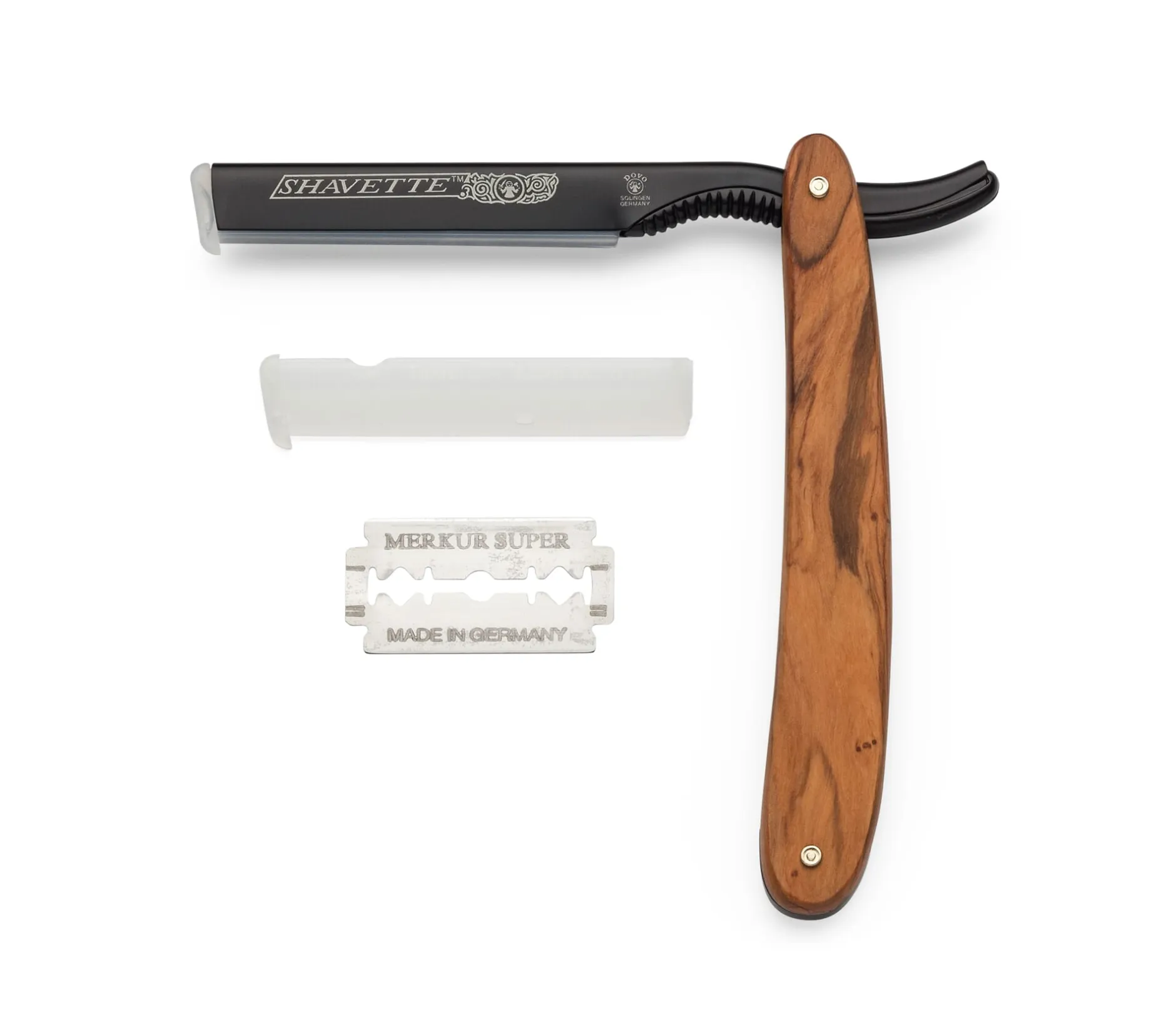Die Dovo Shavette® ist einerseits das Rasiermesser für die professionellen Barbiere, die damit Bart, Konturen und Nackenpartie rasieren, einige Friseure verwenden es auch für den Messerschnitt der Haare. Andererseits bietet sie für den Laien den einfachsten Einstieg in die Messerrasur. Praktisch dabei ist, dass sie deutlich weniger Pflege benötigt als ein Rasiermesser, da sie mit klassischen Wechselklingen bestückt wird. Diese müssen vor dem Einsetzen lediglich an einer (Tisch-)Kante auseinandergebrochen oder mit einer Schere halbiert werden. Zwei Halterungen (eine für kurze, eine für lange Klingen) und eine kurze Rasierklinge werden mitgeliefert. Das Besondere bei diesem Modell sind die haptisch angenehmen Griffschalen aus Olivenholz.