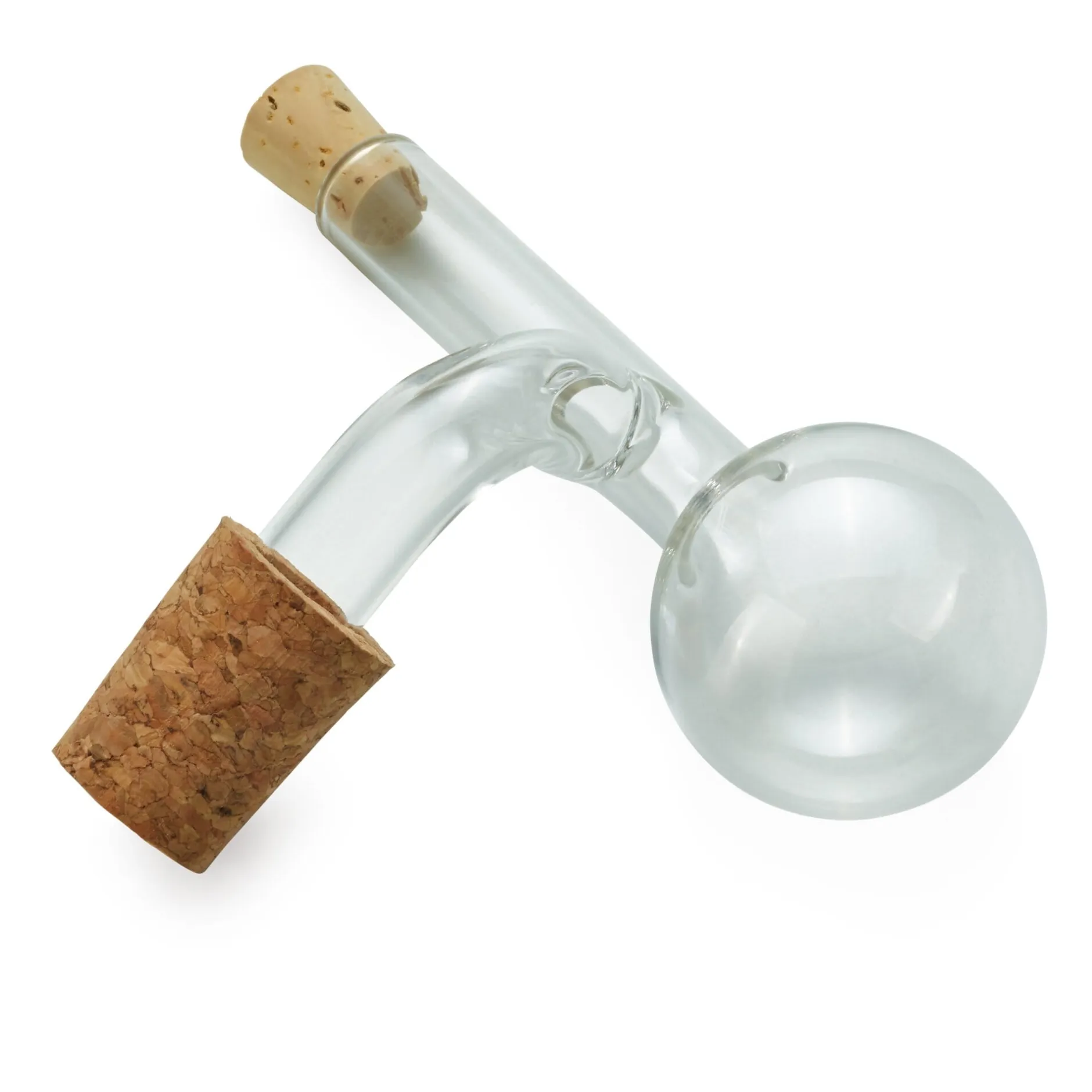 Aus mundgeblasenem Glas gefertigt, mit Naturkorken. Volumen 20 ml. Ø Kugel 3,5 cm, Rohr Ø 1,3 cm. Breite 8,5 cm, Tiefe 3,5 cm, Höhe 9,5 cm. Gewicht 15 g. Lieferung im kleinen Karton.