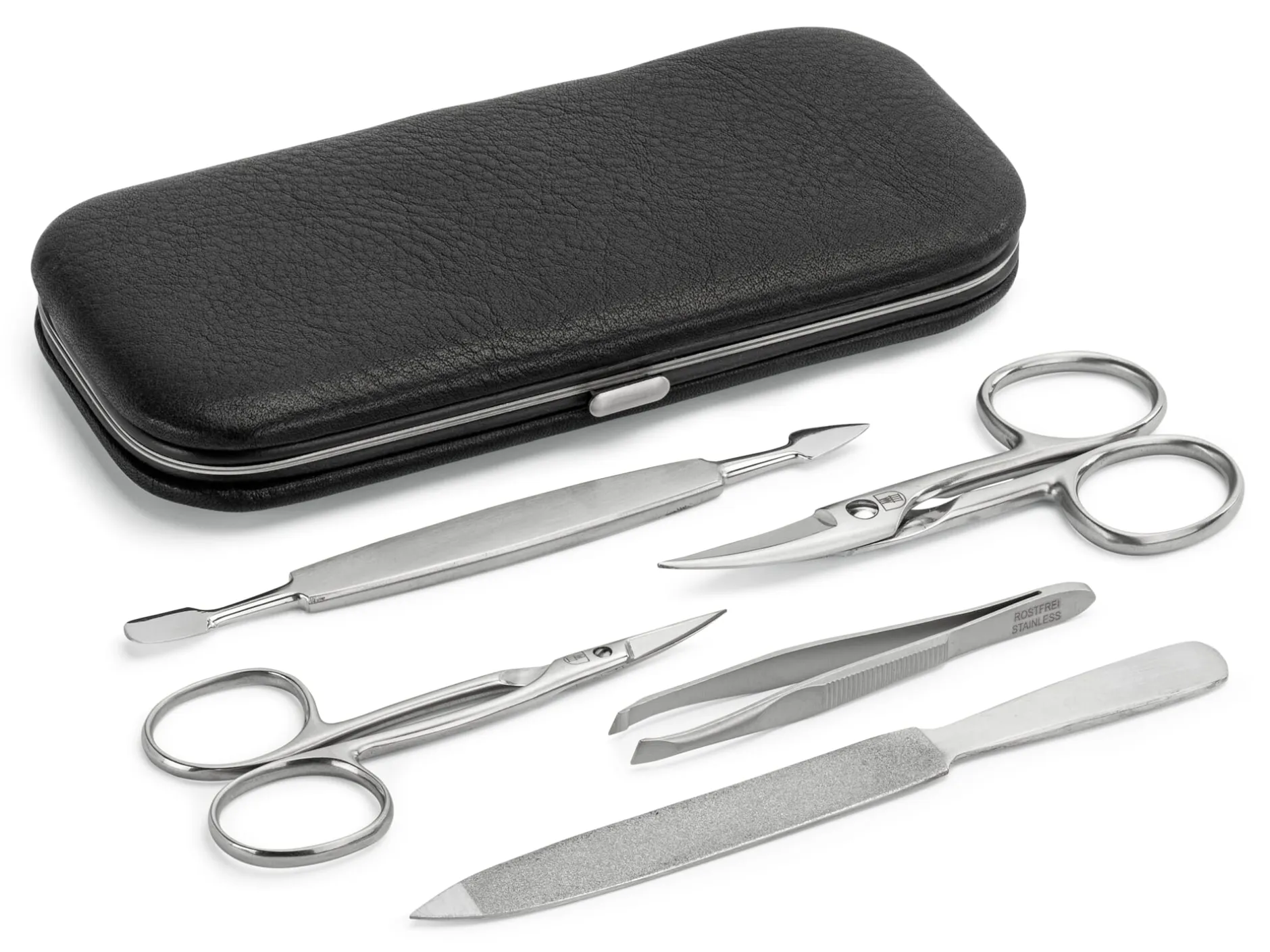 Bestückt mit je einer Haut- und Nagelschere, einer Pinzette (Länge 9 cm), einer Saphirfeile mit einer feinen und gröberen Seite, einem Doppelinstrument mit Nagelhautdrücker und Nagelreiniger. Alle Instrumente sind aus rostfreiem Edelstahl.