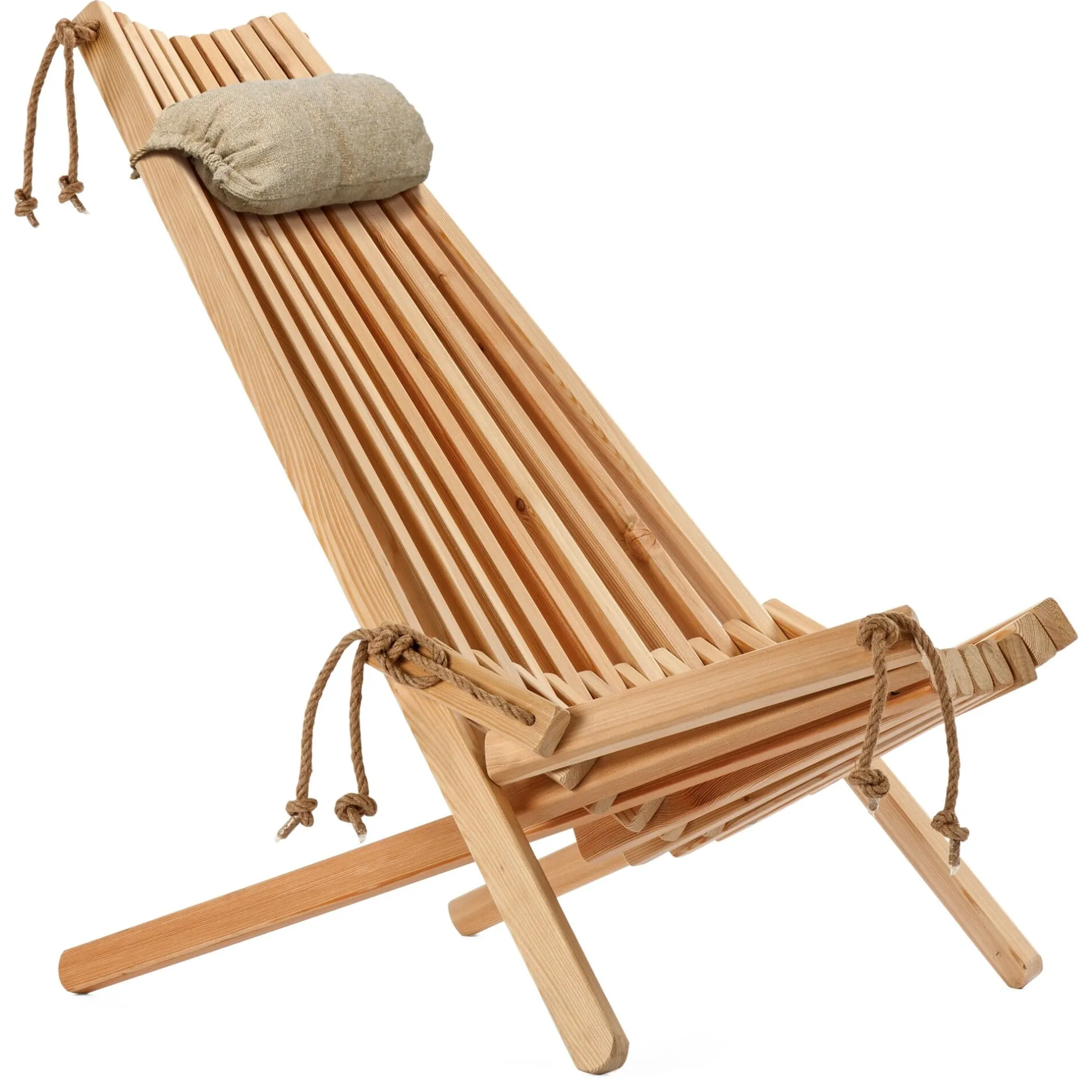 Ein einfaches Kopfkissen aus grobem Leinengewebe, das den Liegekomfort auf dem Faltsessel aus Lärchenholz erhöht. Die Kordeln dienen der Befestigung am Kopfteil.