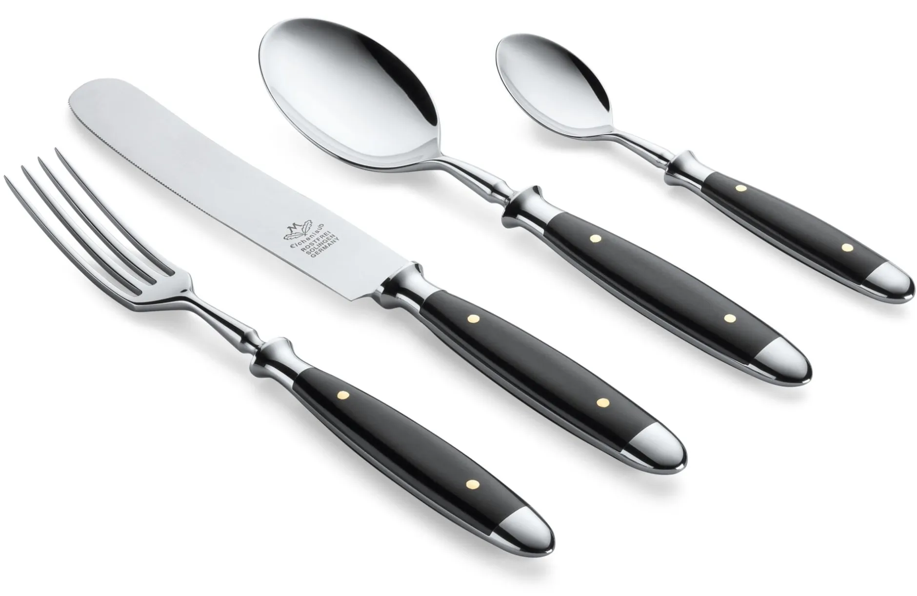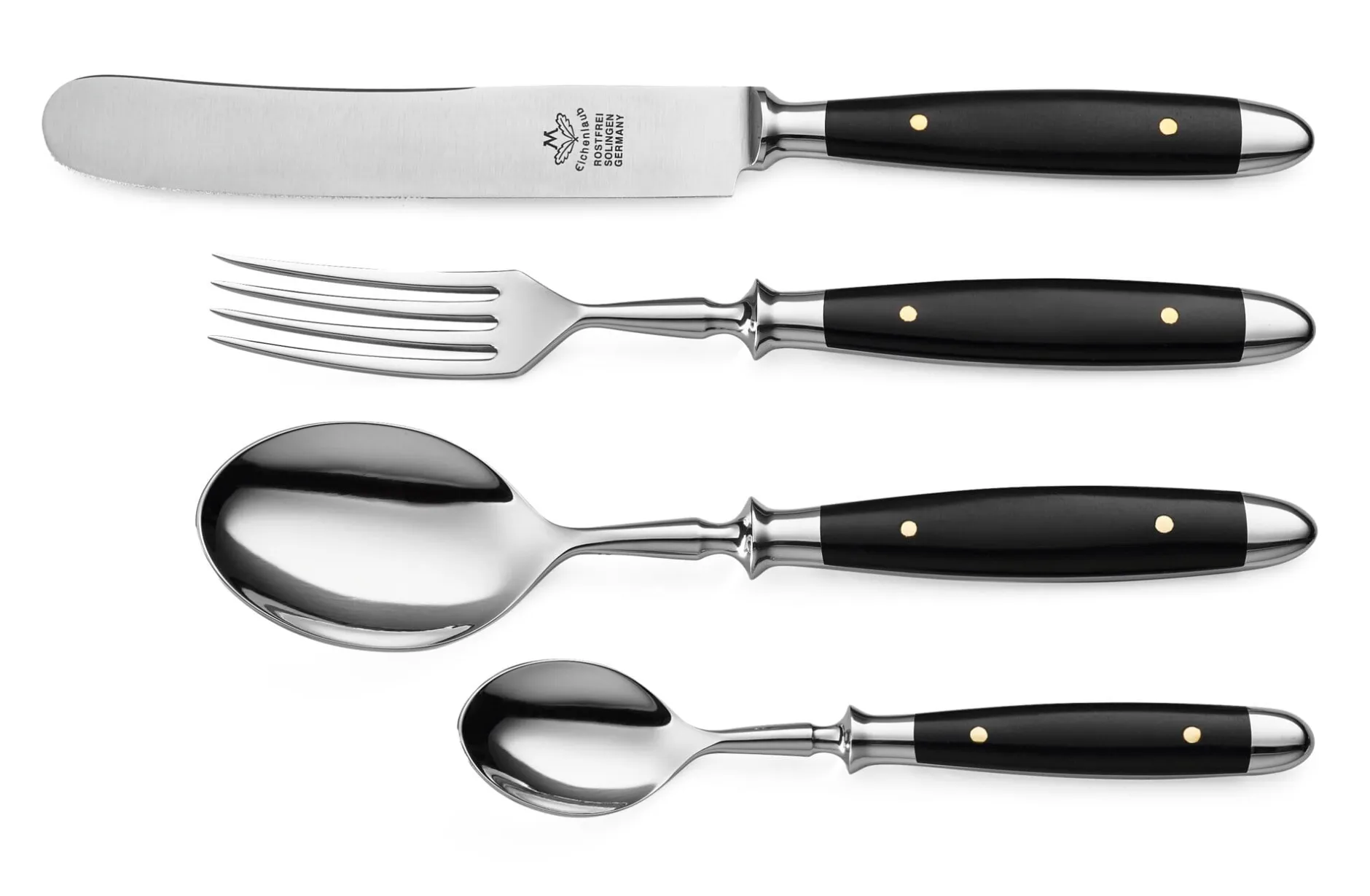 4-teilig (1 Messer, 1 Gabel, je 1 Tafel und Kaffeelöffel). Hergestellt in Deutschland.