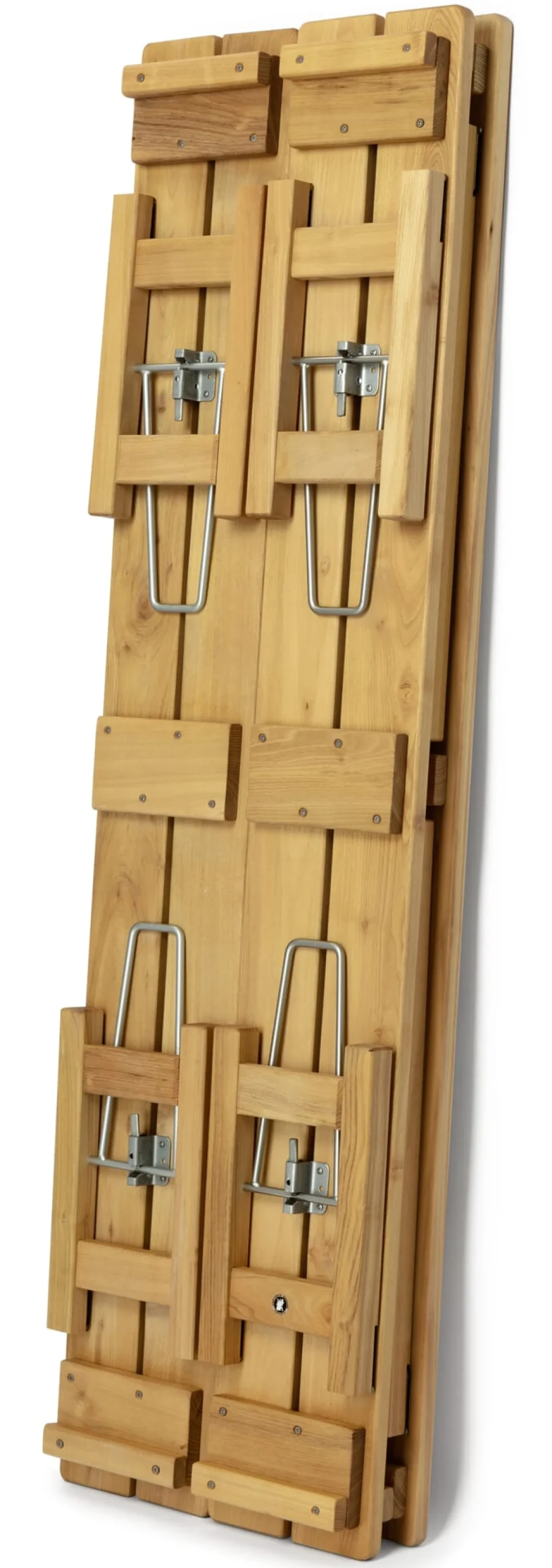 Das Besondere: Massives Robinienholz wird nicht nur bei den Latten (diese sind beachtliche 2,7 cm stark), sondern auch bei den Beinen (mit einer Kantenlänge von 4 cm) verwendet, und schwere Klappbeschläge aus verzinktem Stahl verbinden alles außerordentlich stabil miteinander. Die ganze Konstruktion übersteigt also bei weitem die gattungstypische Beschränkung auf das Notwendige.