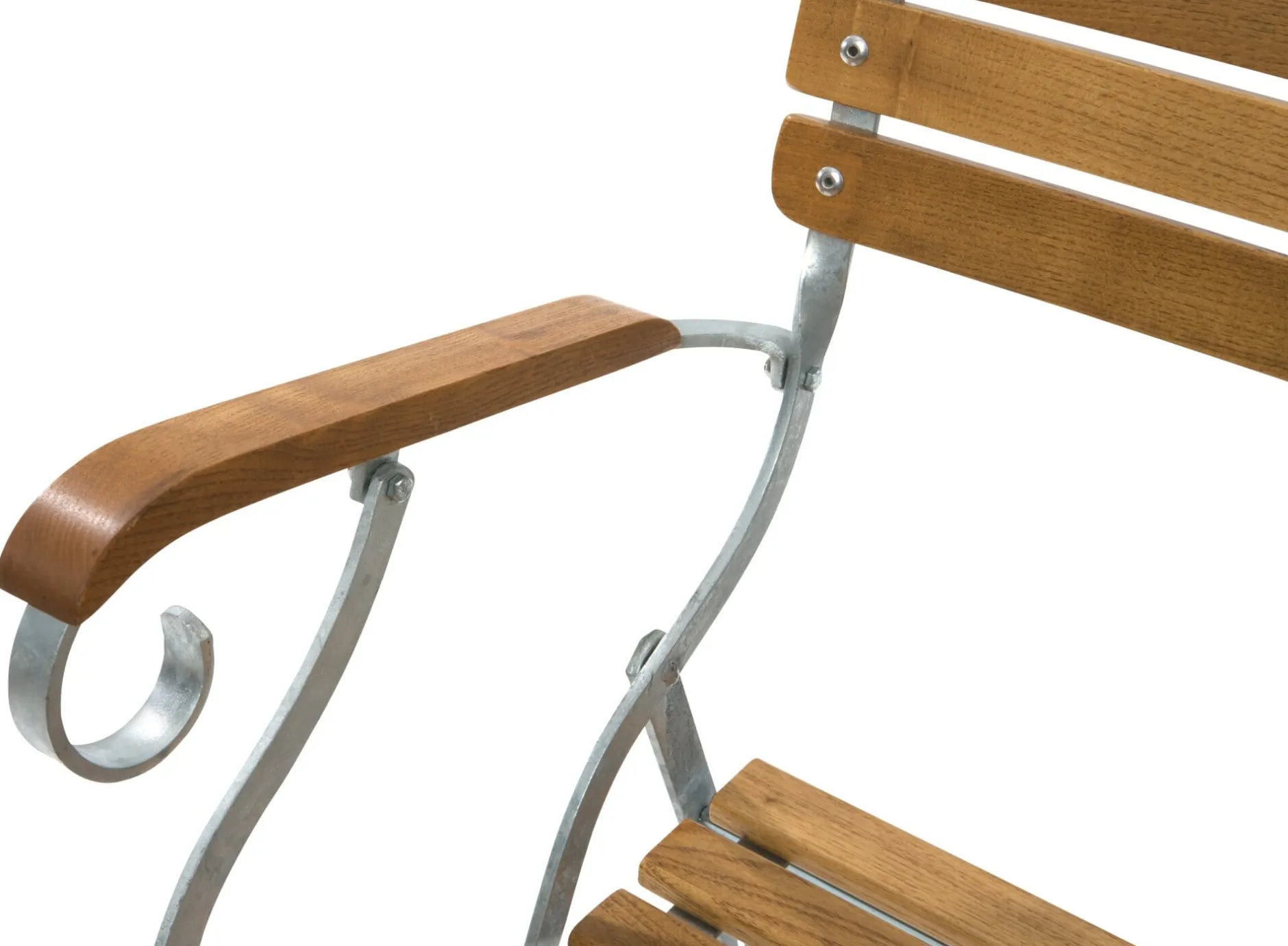 Komfortabler Sessel mit Armlehnen, der auch auf dem Balkon nicht allzu raumgreifend wirkt. Bandstahl feuerverzinkt, Robinienholz geölt. Höhe 80 cm, Breite 54 cm, Tiefe 54 cm. Sitzfläche 39 × 39 cm. Sitzhöhe 45 cm. Klappmaße 105 × 54 × 15 cm. Gewicht 11 kg.