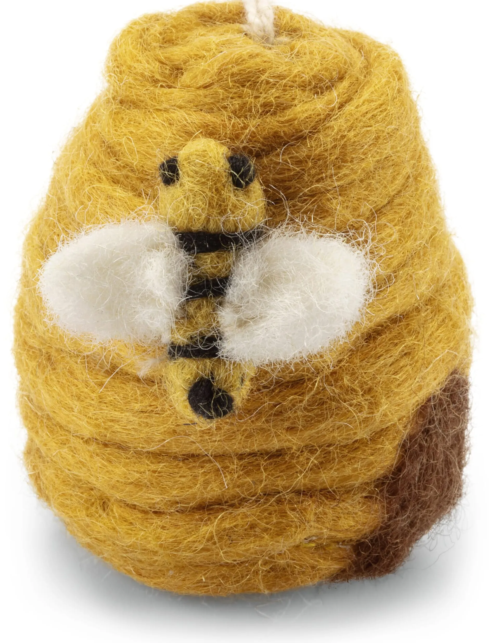 Kaum haben die ersten Frühblüher ihre Blüten geöffnet, schon summen sie herum: Wild- und Honigbienen. Dabei ist es ausschließlich eine Eigenschaft der von Imkern betreuten Honigbienen, ihr Volk in einem Bienenkorb – auch „Stülper“ oder „Beute“ genannt – zu versammeln, ob für die Nacht oder über den Winter. In Mitteleuropa finden sich bereits in frühgeschichtlicher Zeit Hinweise auf von Menschen gefertigte Korbbehausungen für Bienen, ein weiterer Hinweis darauf, wie bedeutend die Arbeit der Bienen für den Menschen ist. Solch ein wichtiges Wesen darf natürlich in der Frühlings- und Osterdekoration nicht fehlen. Als ausdauernde Ergänzung fügt sich dieser kleine, von Hand aus reiner Schurwolle gefilzte Bienenkorb in die Zweige Ihres Frühlingsstraußes und Osterschmucks – und macht eine ebenso schmucke Figur auf Ihrer festlichen Frühstückstafel, wo das aufgenähte, ebenfalls handgefilzte Bienchen zugleich die Süße des Honigs verspricht.