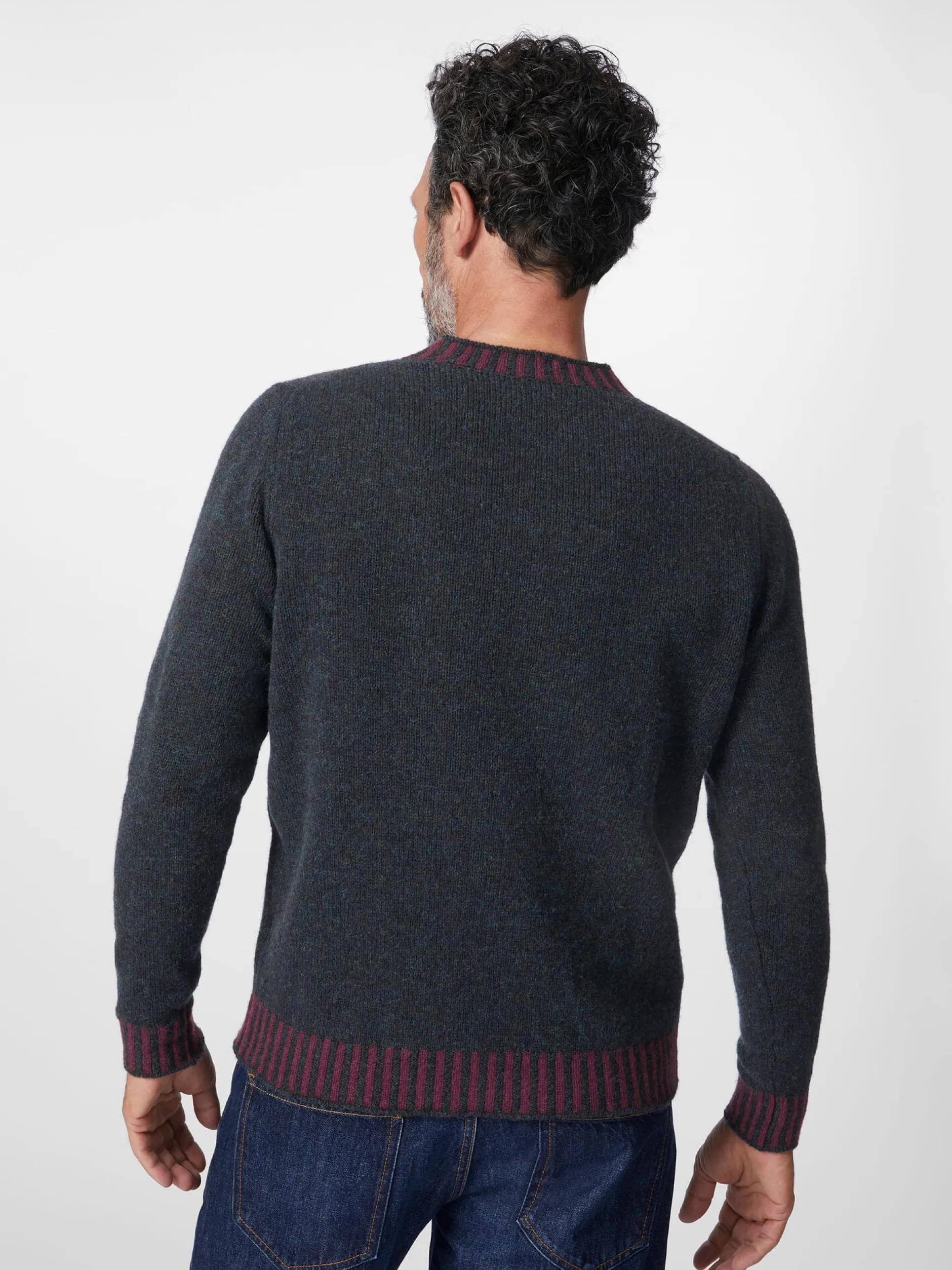 Wärmender Pullover aus reiner Schurwolle, dessen Gestrick eine lebendige Melangeoptik zeigt. Hals, Ärmel und Rumpf schließen mit Rippenstrickbündchen ab, die durch ihre Zweifarbigkeit einen markanten Kontrast zum restlichen Pullover bilden.