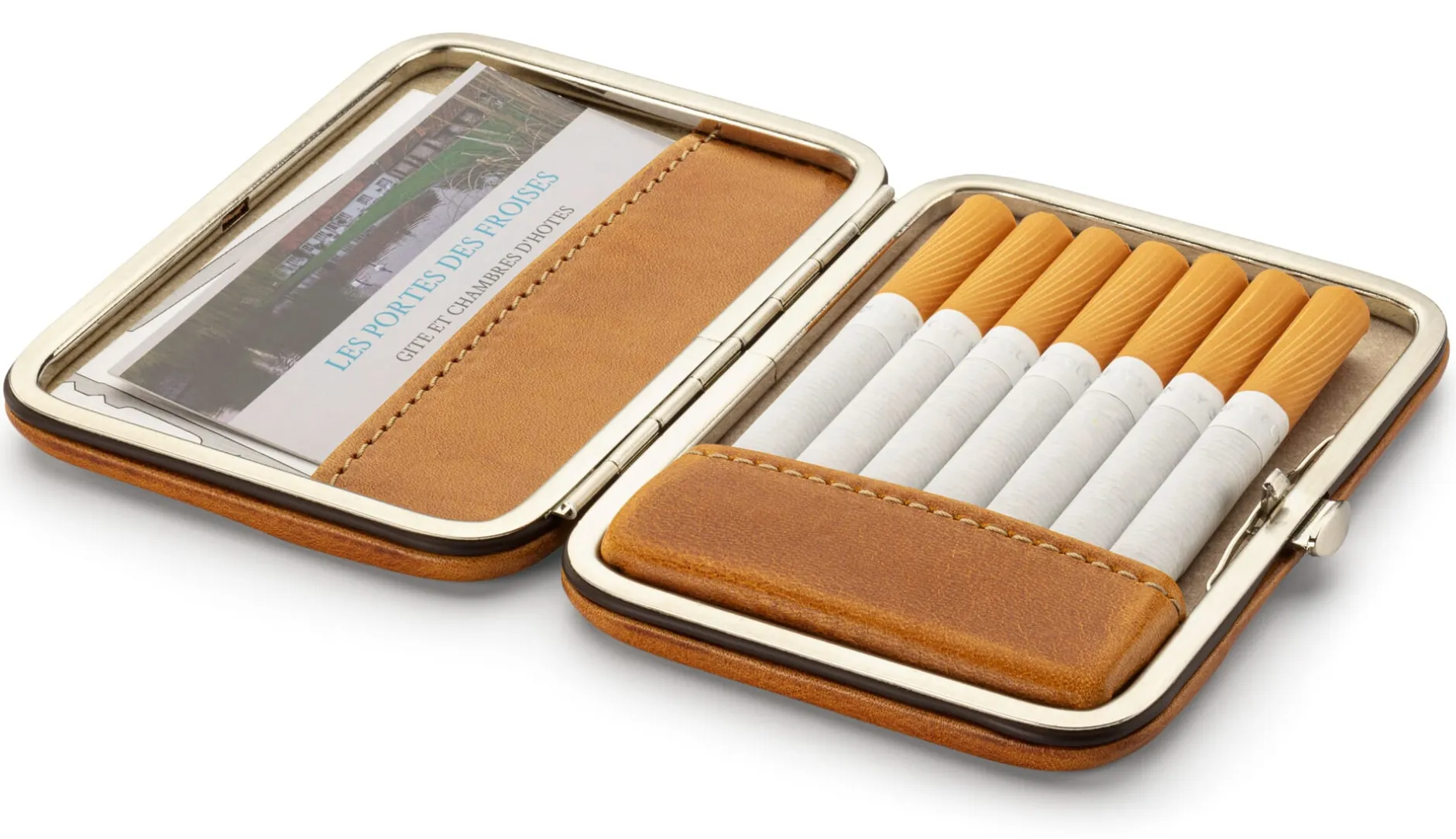 Dieses kleine, aber feine Etui aus schmiegsamem, vegetabil gegerbtem Rindleder bietet Platz für Visitenkarten oder für bis zu sieben Zigaretten. Personalausweis und Führerschein im Kartenformat passen ebenfalls hinein, zum Beispiel in das kleine Steckfach im Deckel, wo sie stramm und sicher gehalten werden. Der vernickelte Stahlrahmen bietet dabei die nötige Stabilität, sodass unterwegs nichts zerdrückt werden kann. Für das (ungepolsterte) Futter wird widerstandsfähiges Lefa (Lederfaserstoff) verwendet, ein ressourcenschonend aus Lederresten und Naturlatex hergestelltes Material.