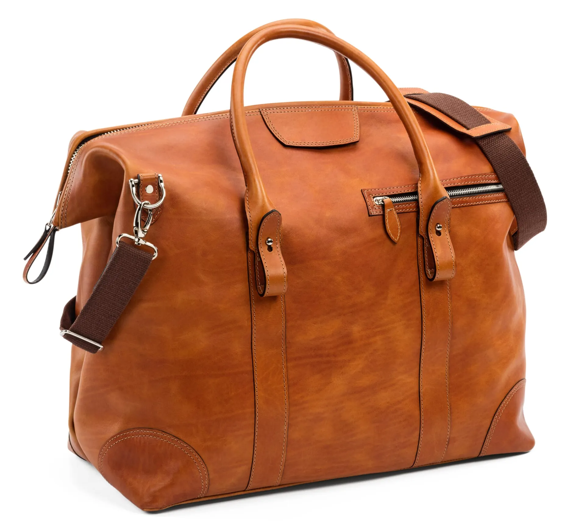 Hammann fertigt den Weekender in dieser Größe und opulenten Ausstattung eigens für Manufactum: Verwendet werden beste Stierhäute süddeutscher und österreichischer Herkunft, die in Italien pflanzlich gegerbt und anilingefärbt werden. Dabei dringen die Pigmente tief in das Leder ein, sodass seine natürliche Oberfläche sichtbar bleibt und sich mit der Zeit eine schöne Patina bilden kann. Der Korpus ist mit sauber umgeschlagenen Kanten gearbeitet, offene Lederkanten werden sorgfältig glattgezogen, gefärbt und gewachst. Die Tragegriffe sind innen mit einer Baumwoll-Dochtschnur unterfüttert, die Volumen gibt und stabilisiert, sodass die Griffe selbst bei befüllter Tasche angenehm in der Hand liegen. Lederbesätze schützen die Ecken zusätzlich, der verstärkte Boden steht auf sechs Metallfüßchen. Bei Bedarf kann ein Schulterriemen über stabile Lederaufnahmen und massive Metallbeschläge am Korpus angebracht werden.