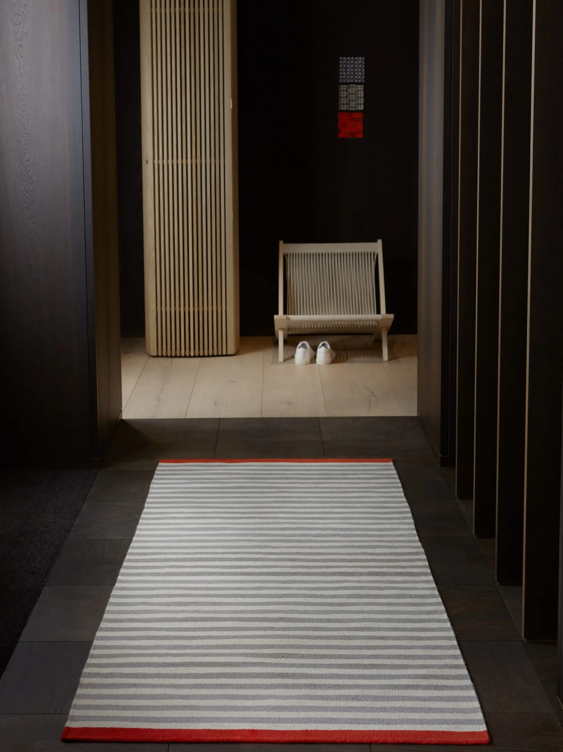 Mustergültig skandinavisch: Das klare Streifenmuster des handgewebten Teppichs fasst die Textildesignerin Lisbet Friis mit leuchtend roten Webabschlüssen ein. Beim dänischen Familienunternehmen Fabula trifft skandinavische Gestaltung auf orientalische Handwerkstechnik – durch die Kelim-Webart bildet der Schussfaden auf beiden Seiten des Teppichs das Muster, sodass dieser beidseitig verwendbar ist. Dank seiner geringen Florhöhe ist ROSEMARY vor allem auch in Durchgangsbereichen und Fluren einsetzbar. Hergestellt in Indien.