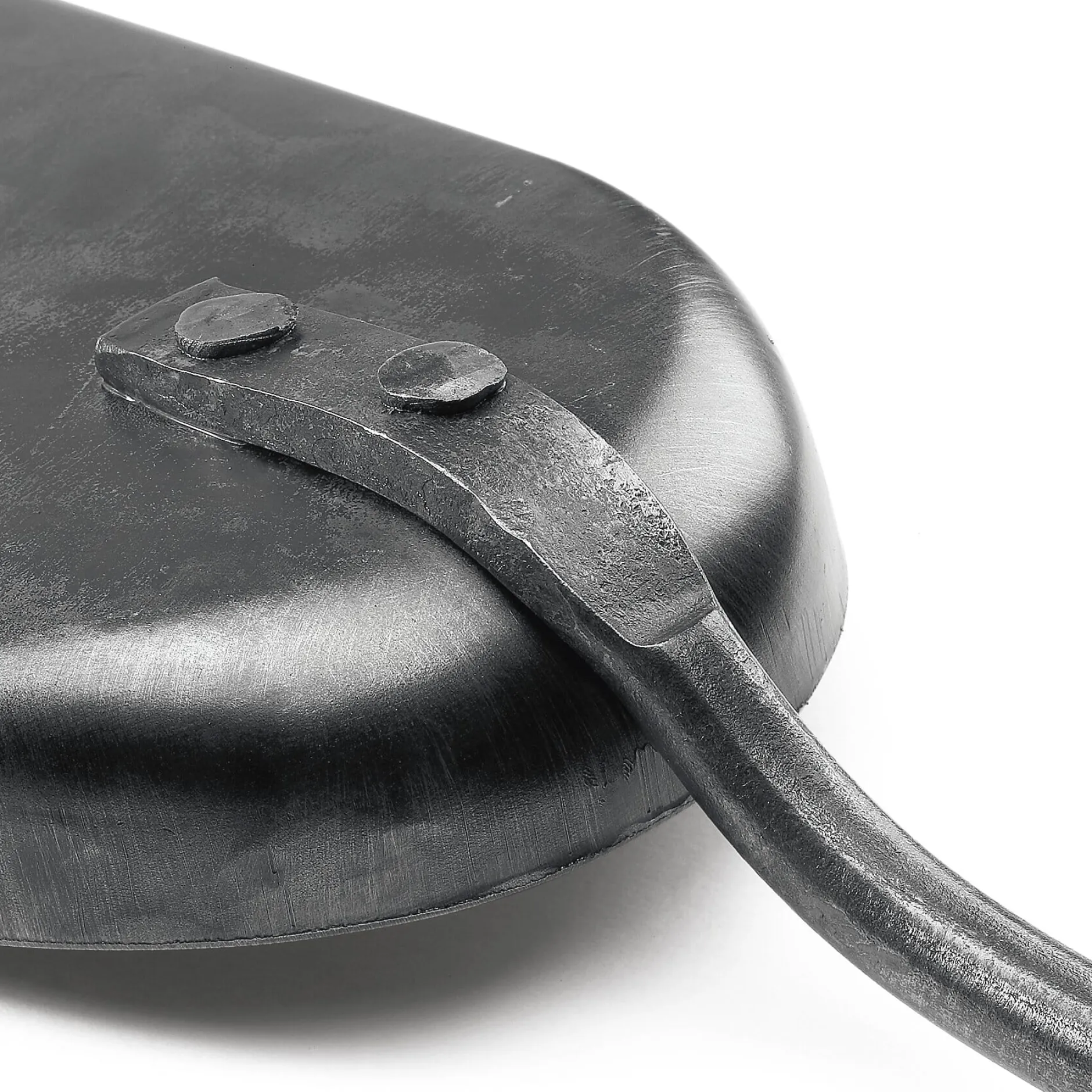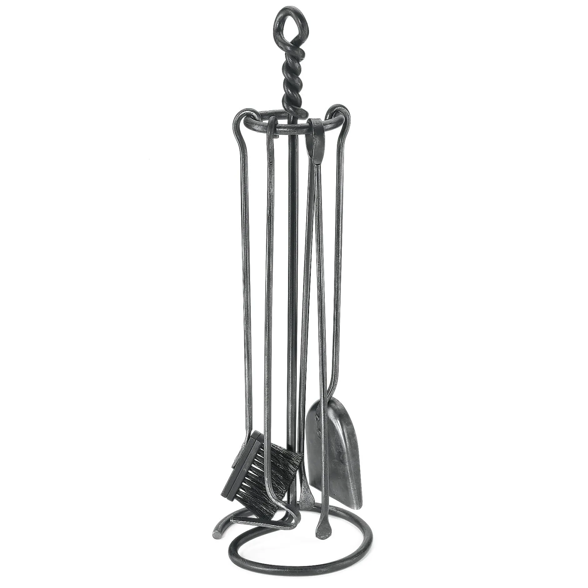Eine einfache Kamingarnitur, die wegen ihrer durchdachten Formgebung auf jede Art von Schweißung verzichten kann. Sowohl der Ständer als auch die einzelnen Werkzeuge sind aus Schmiedeisen geformt, lediglich die Schaufel ist genietet (und der Besen ist mit Polyamidfasern bestückt). Abschließend sind die schmiedeeisernen Oberflächen mit Hartöl gegen Korrosion geschützt.