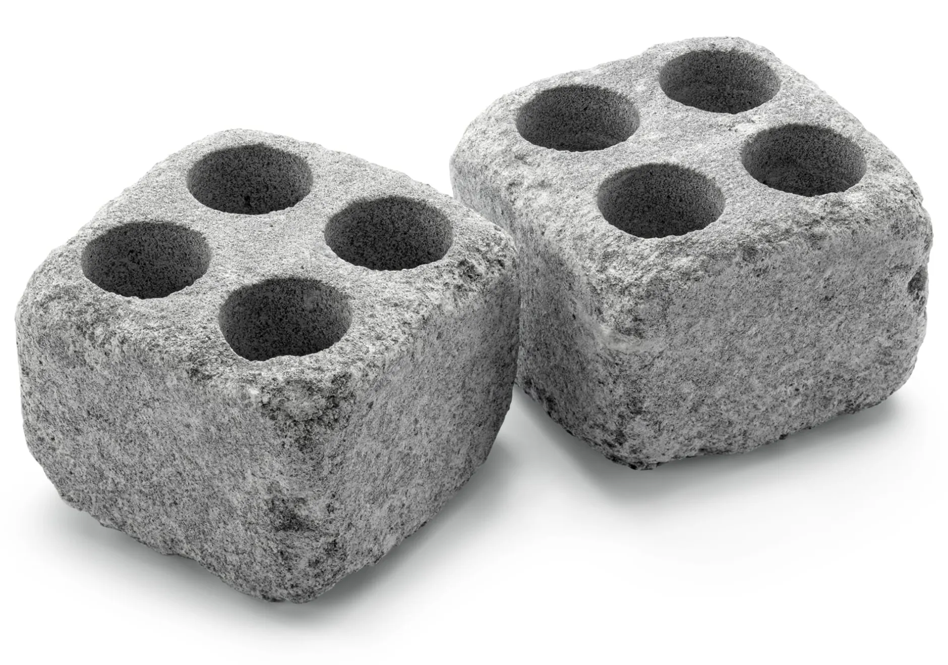 Set mit 2 Steinen aus Speckstein à 8 × 8 × 6 cm. Gewicht je Stein ca. 830 g. Volumen je Bohrung 20 ml. Hergestellt in Finnland.