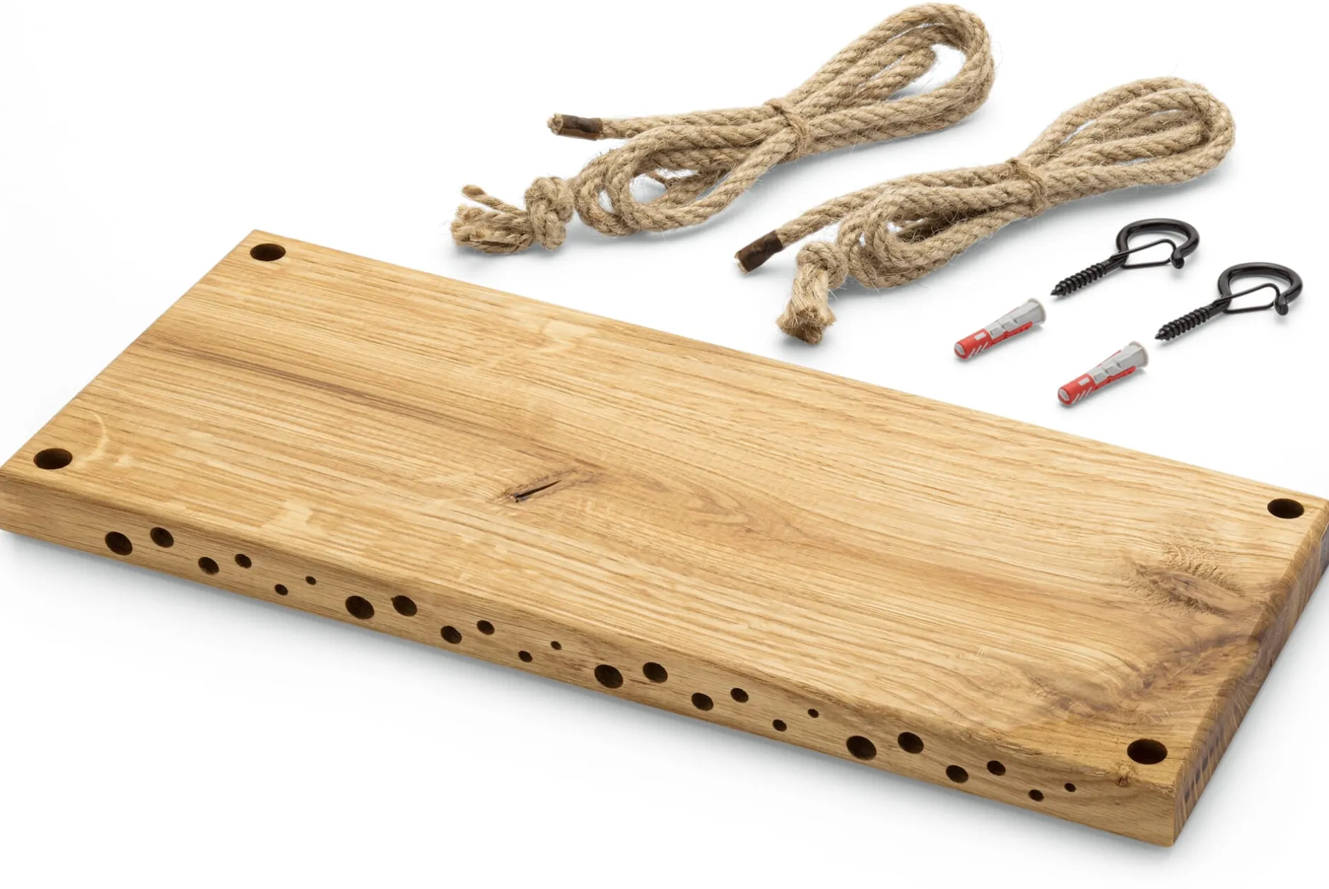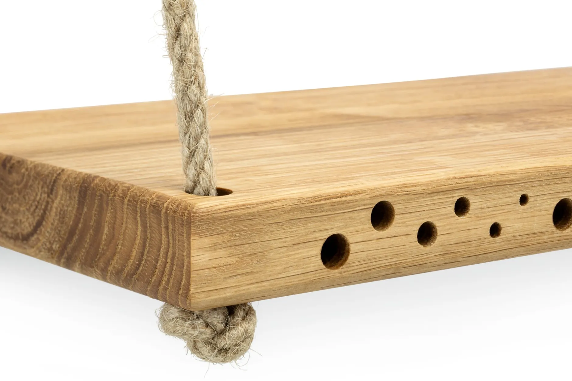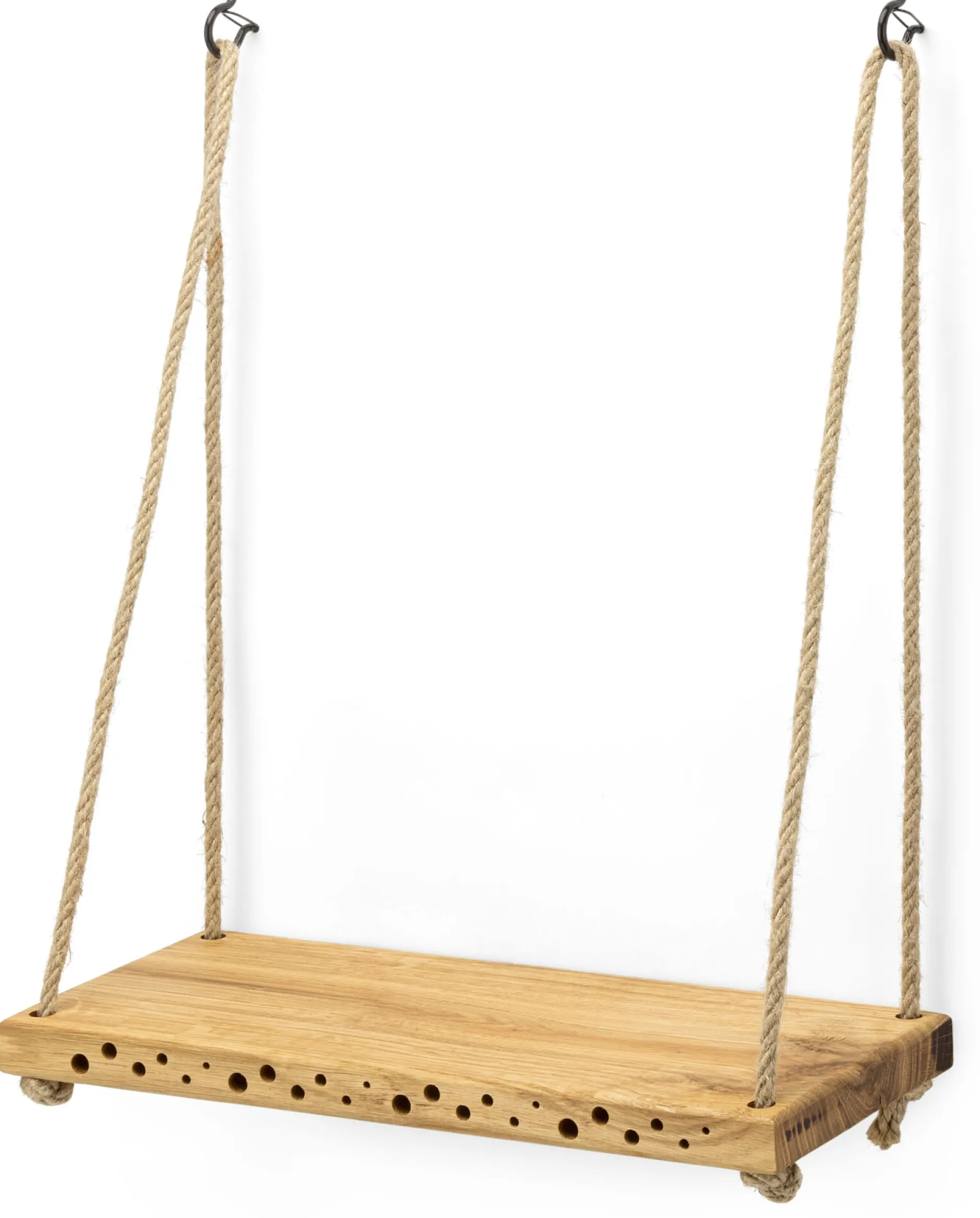 Eichenholz (Herkunft Europa). Holzoberflächen mit Leinöl imprägniert. 2 Juteseile (L 95 cm) und 2 Metallhaken zur Aufhängung beiliegend. L 33 × B 14 × H 2,3 cm. Gewicht 700 g. Bohrlöcher Ø 3 bis Ø 8 mm. Hergestellt in Deutschland.