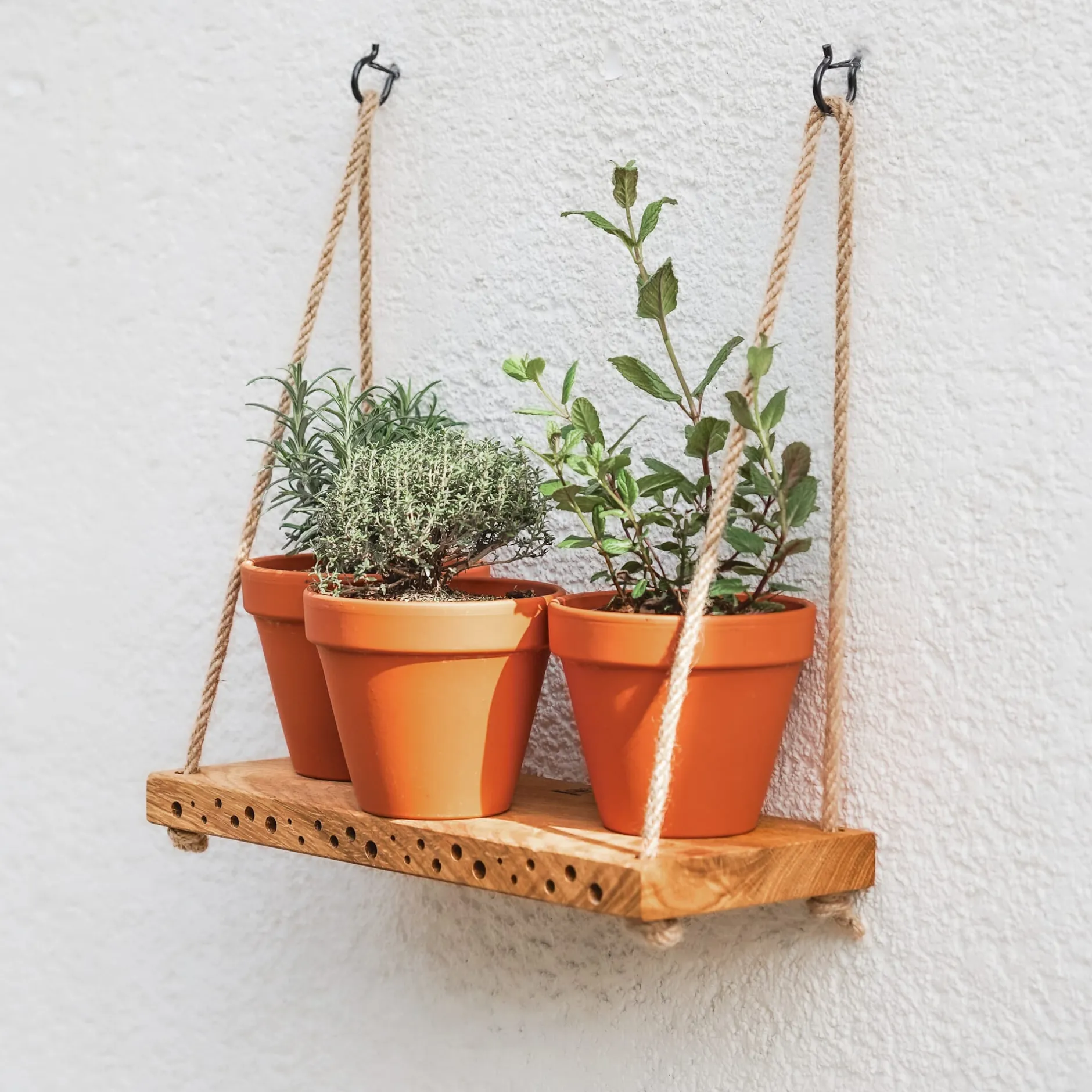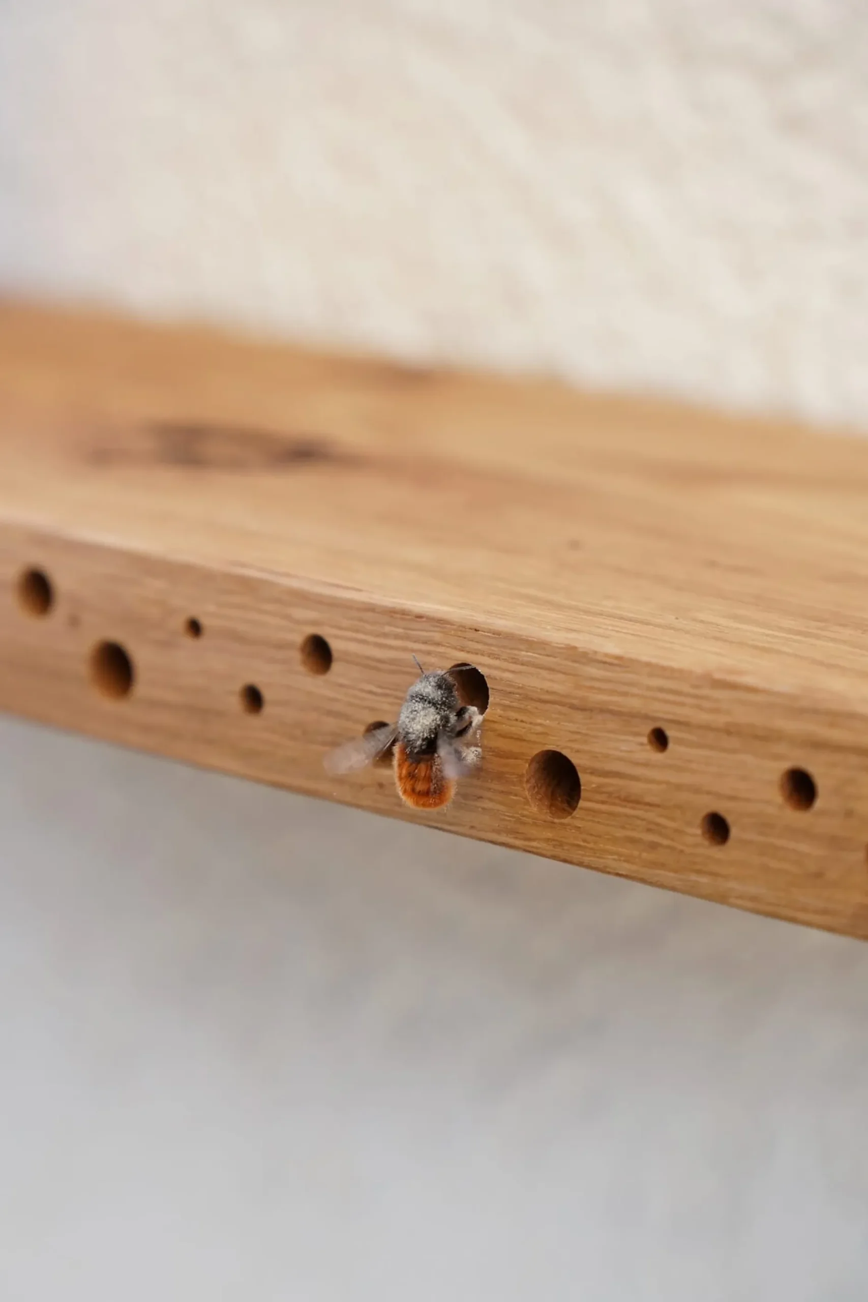 Mit Wildbienen auf Augenhöhe! Einerseits Abstellfläche für Pflanztöpfe, andererseits Nisthilfe: Das ist dieses Regal aus geöltem Eichenholz. Erkennen Sie die kreisrunden Bohrungen im Holz? Diese Bohrlöcher besitzen unterschiedliche Durchmesser und können somit über 40 Wildbienen- und anderen hohlraumbesiedelnden Insektenarten einen sicheren Nistplatz bieten. Darunter sind Mauerbienen, Scherenbienen, Löcherbienen, Maskenbienen, Mörtelbienen, Blattschneiderbienen, Grillenjäger, Taufliegen, Schlupfwespen … Insbesondere die fleißigen Wildbienen werden als Bestäuber dringend gesucht – ob auf Ihrem Balkon oder an den Pflanzungen in der Umgebung. Vielleicht gibt es ja ganz in der Nähe Ihrer Wohnung einen bepflanzten Innenhof oder Hinterhofgarten mit Hochbeeten, in denen Gemüsepflanzen wachsen. Die passende Aufhängung wird mitgeliefert: Das Regalbrett kommt inklusive Juteseilen zu Ihnen. Aufhängehaken sowie die passenden Dübel liegen ebenso bei (gegebenenfalls müssen die Dübel gegen ein zur Hauswand passendes Paar ausgetauscht werden).